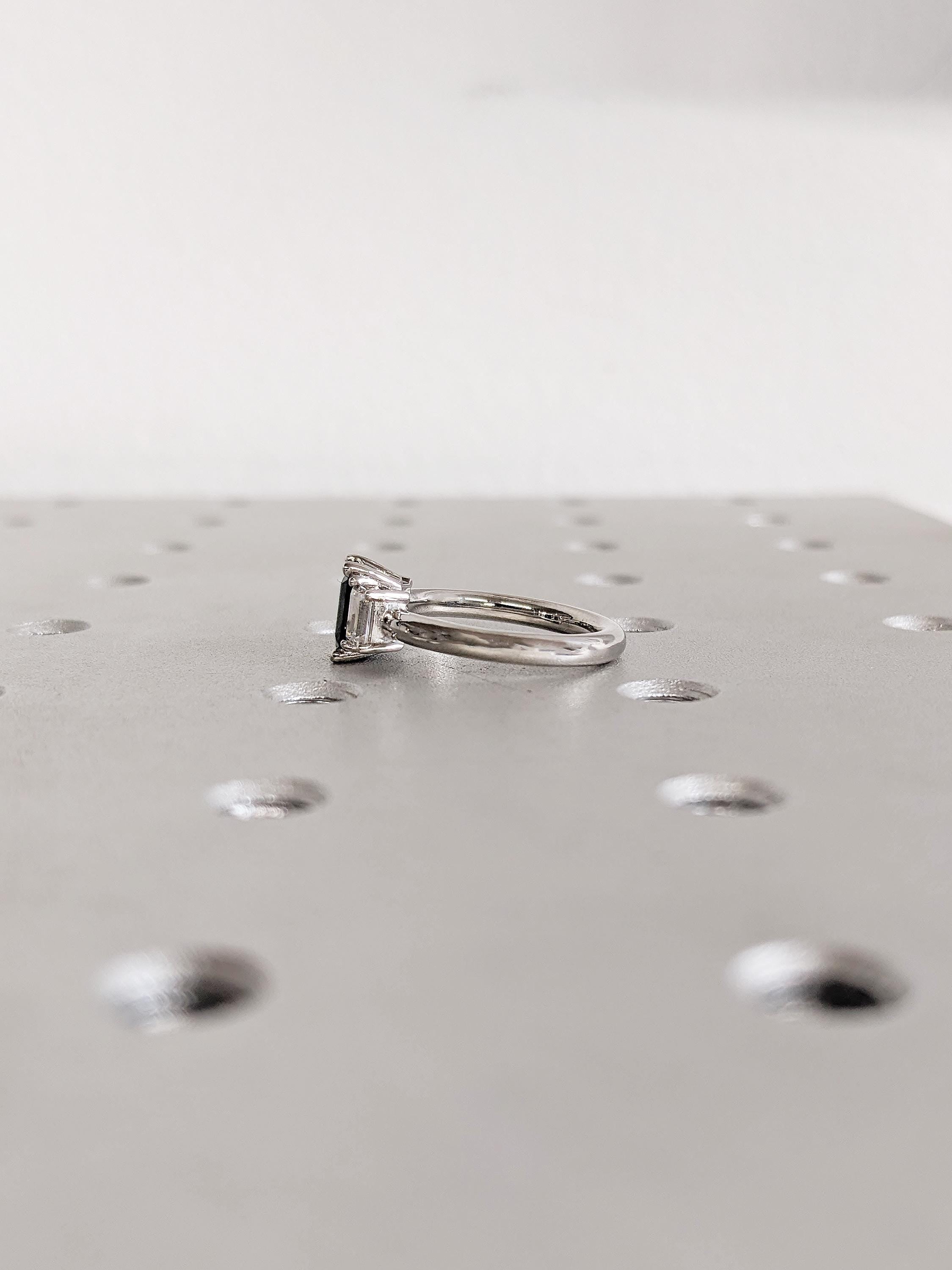 Stand out with our remarkable centerpiece, featuring an emerald-cut Peacock Sapphire gleaming in a captivating green-blue hue. Enhanced by two trapezoid-cut Natural Diamonds, Lab Diamond or Moissanites, this engagement ring exudes elegance and allure.