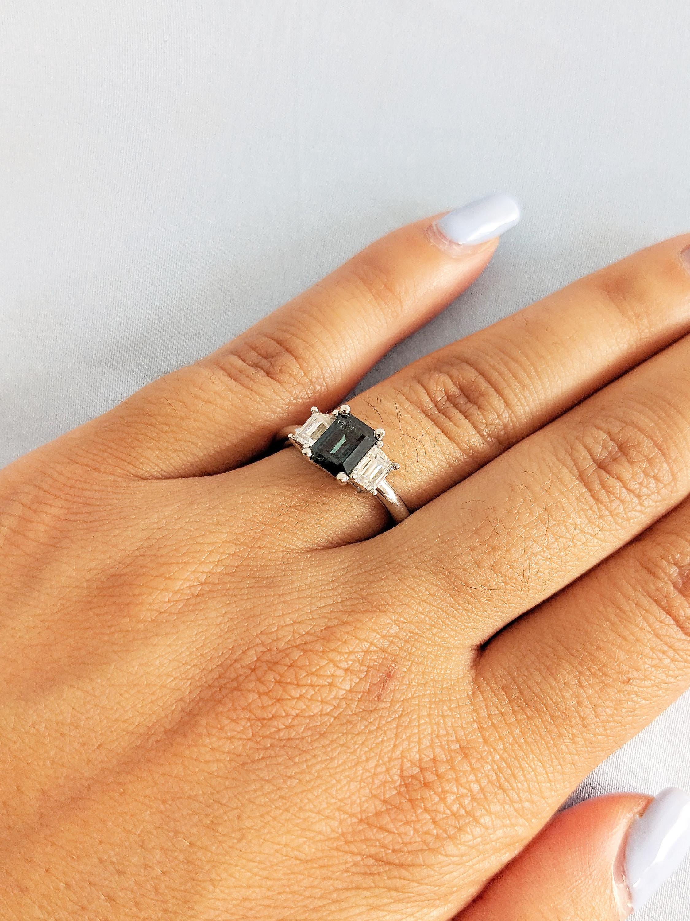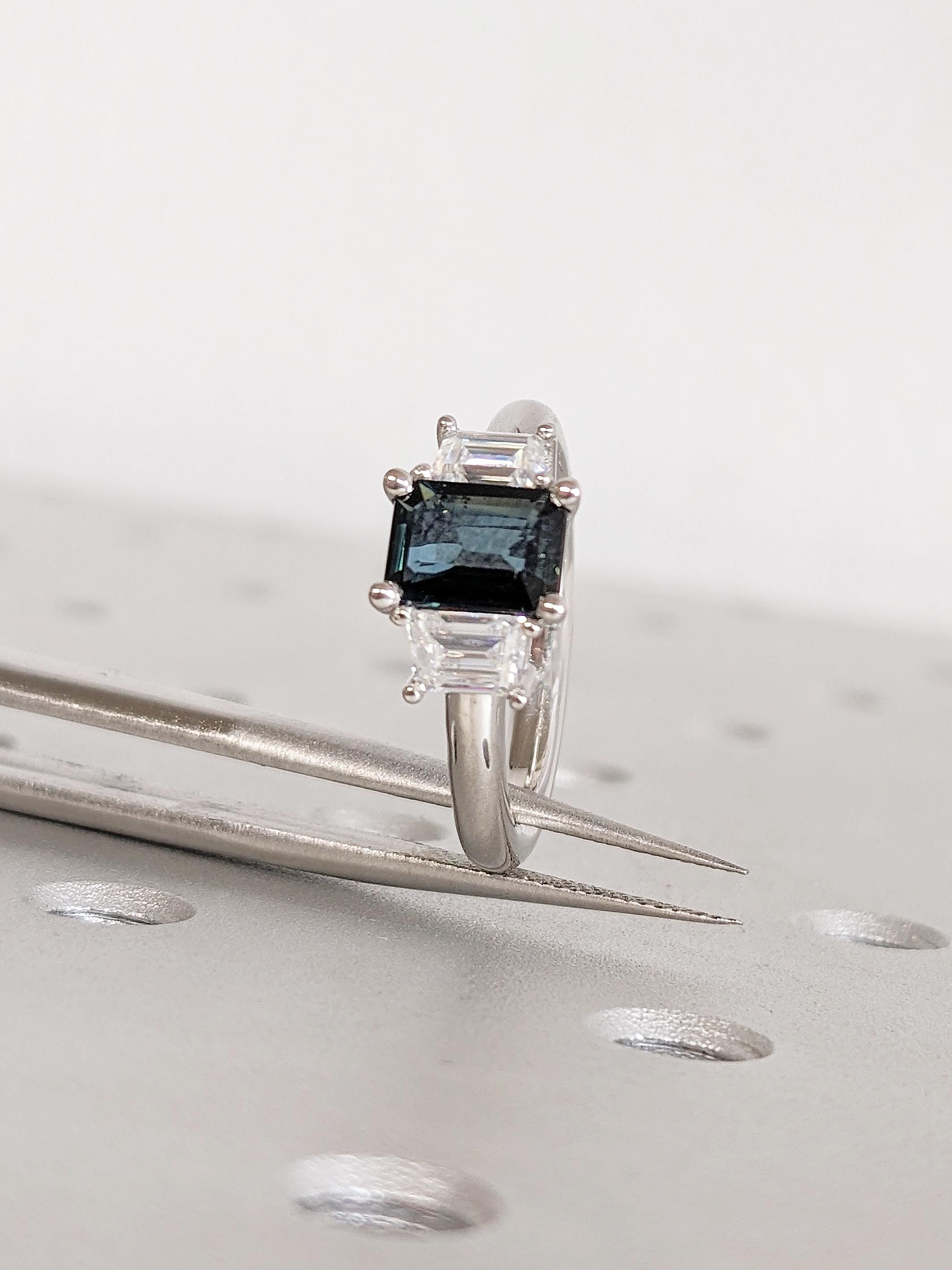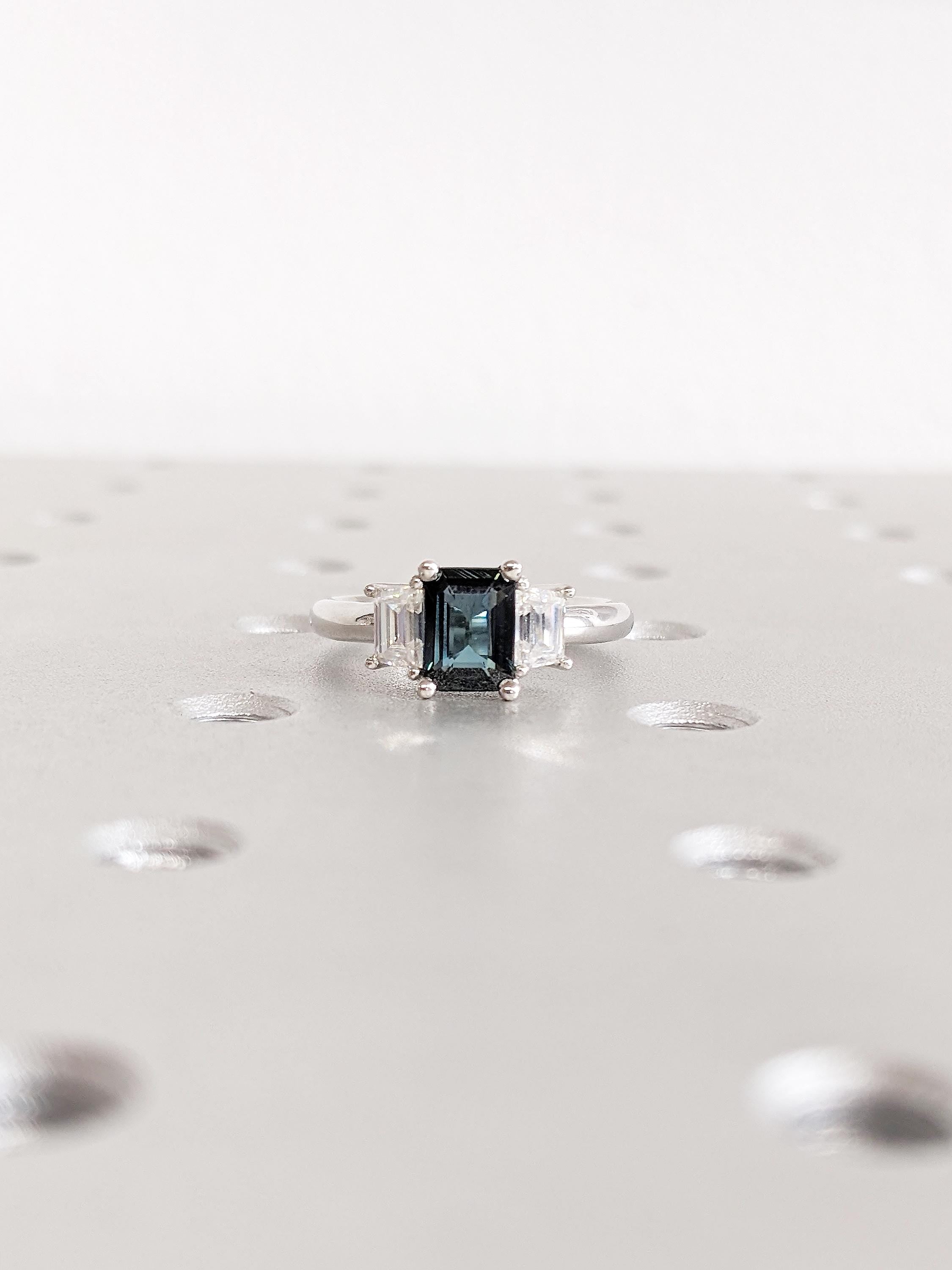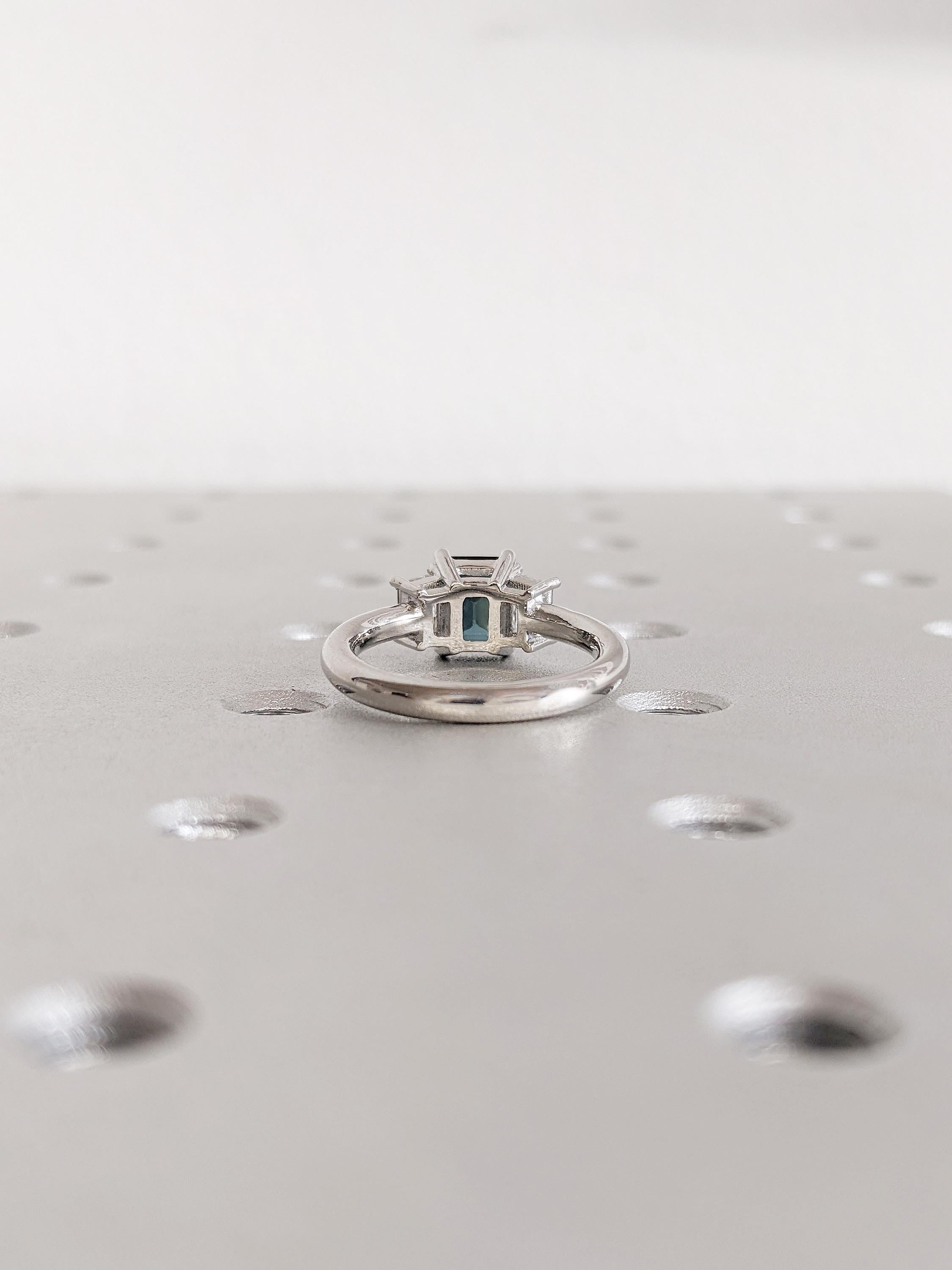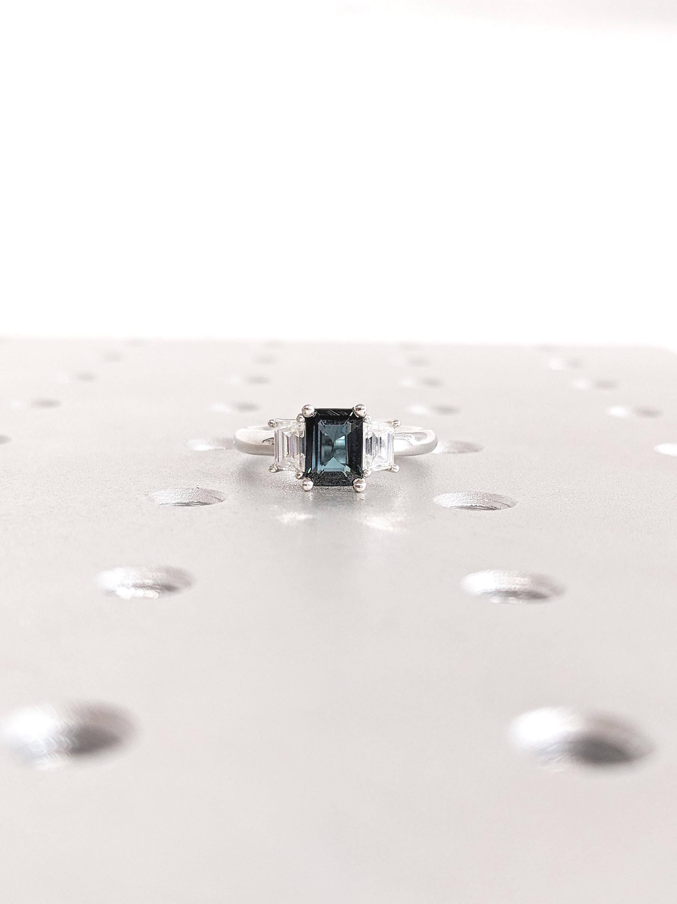 Three Stone Ring, Montana Sapphire Ring, Platinum Engagement Ring, Trapezoid Moissanite, Blue Green Sapphire Gemstone Ring, Anniversary Ring