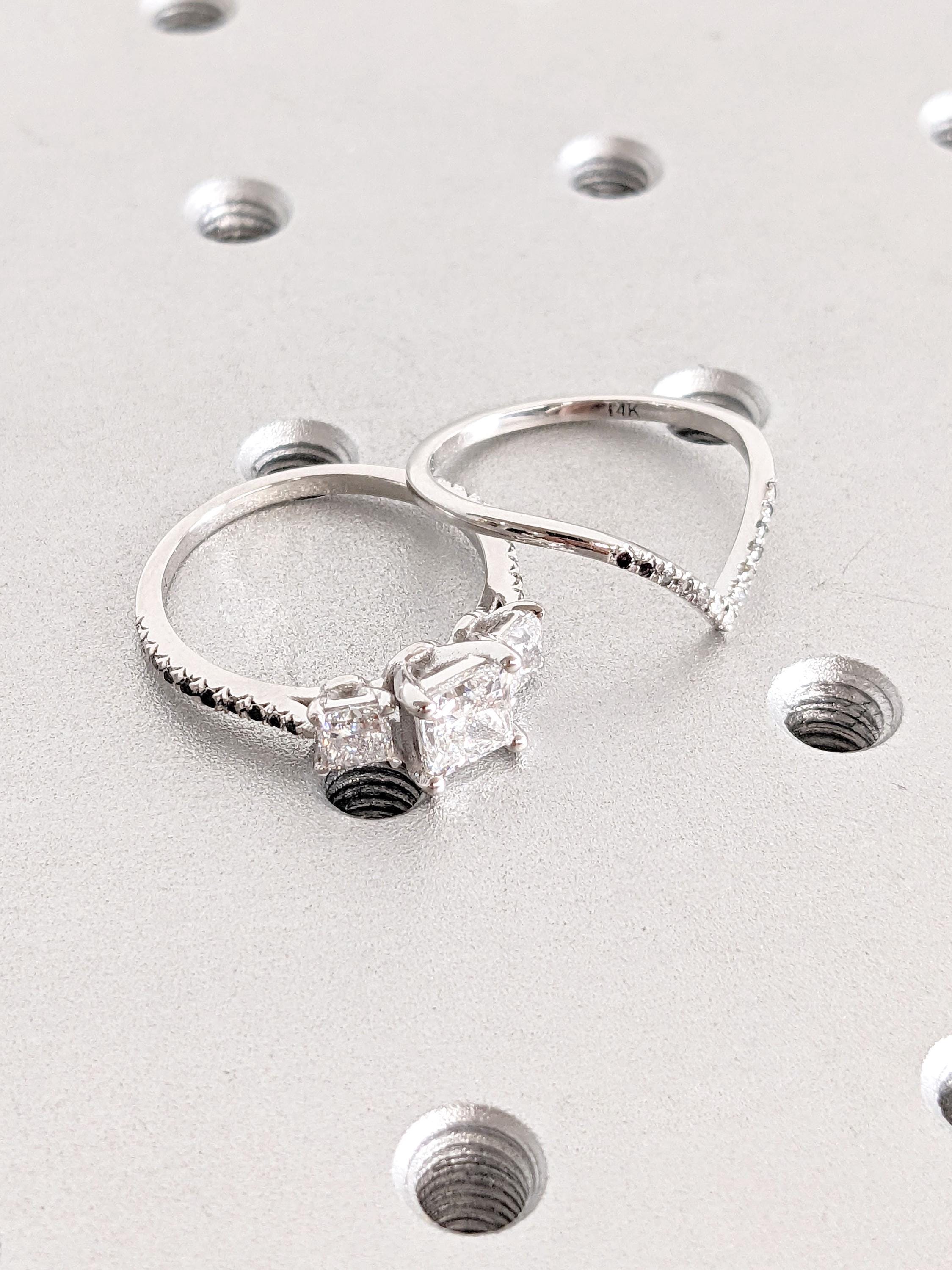 A beautiful three stone ring design, features princess cut Moissanite focal stone, accented by princess cut white side stones, set on a dainty half eternity band paved with tiny round black diamonds. This luxurious statement jewelry is the perfect gift for those who loves a little added sophistication to their style for any occasion.