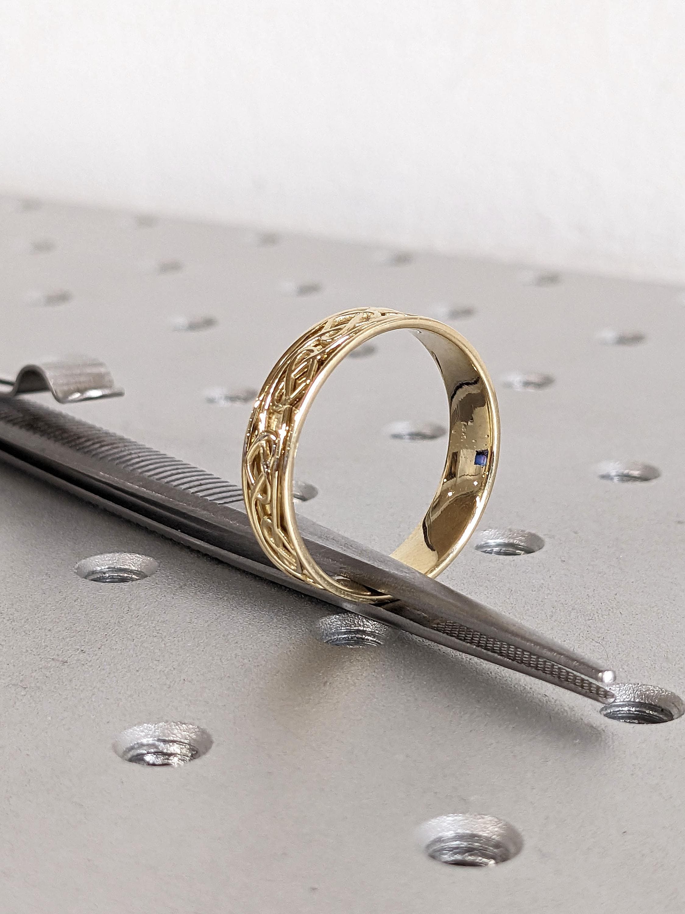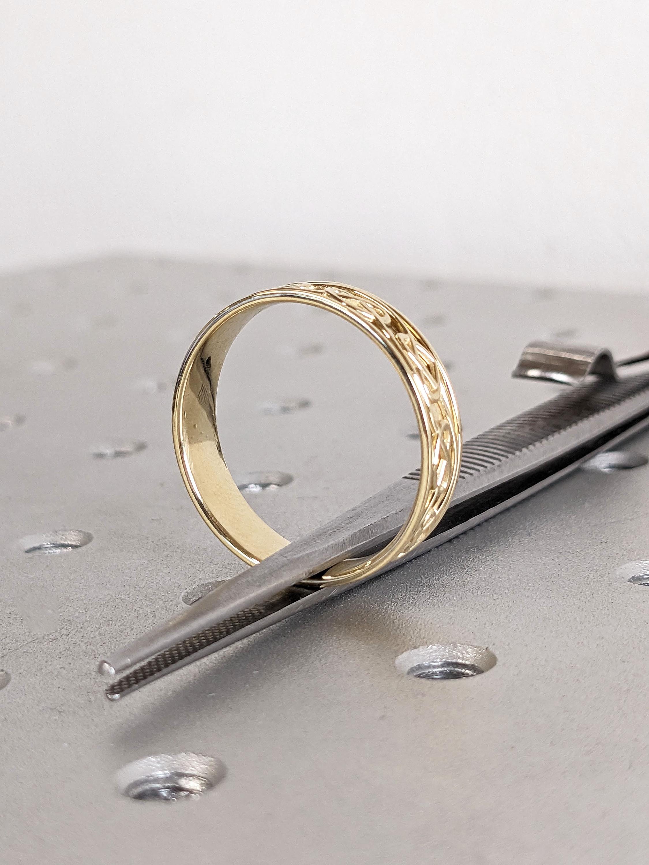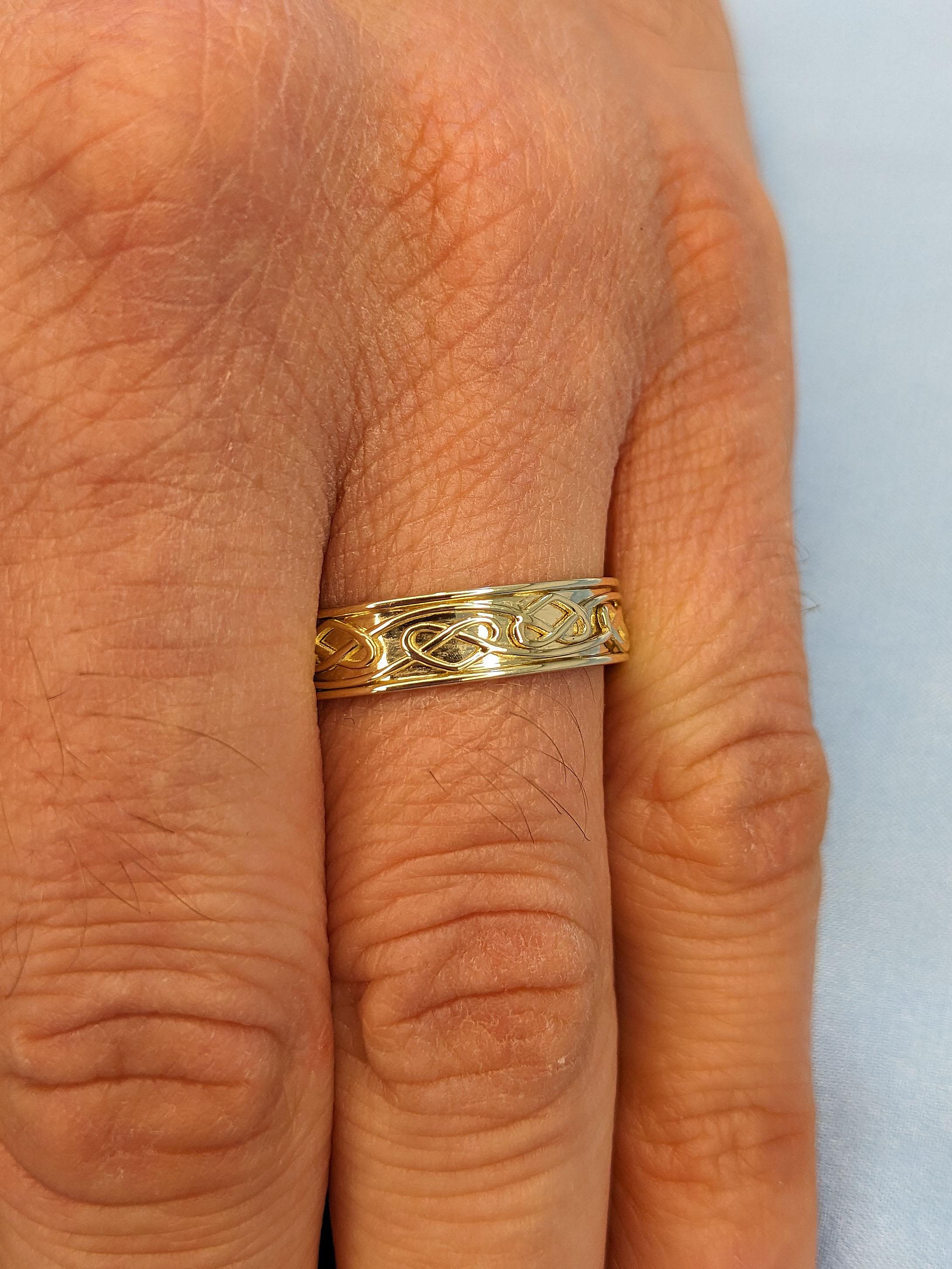 Crafted with character and heritage, this men’s band features the Celtic love knot motif, a symbol of strength, loyalty, and eternal connection. The 5mm width gives it a solid, substantial feel, while the vintage-inspired detailing adds depth and timeless appeal. A powerful design for the man who values tradition, symbolism, and enduring style.