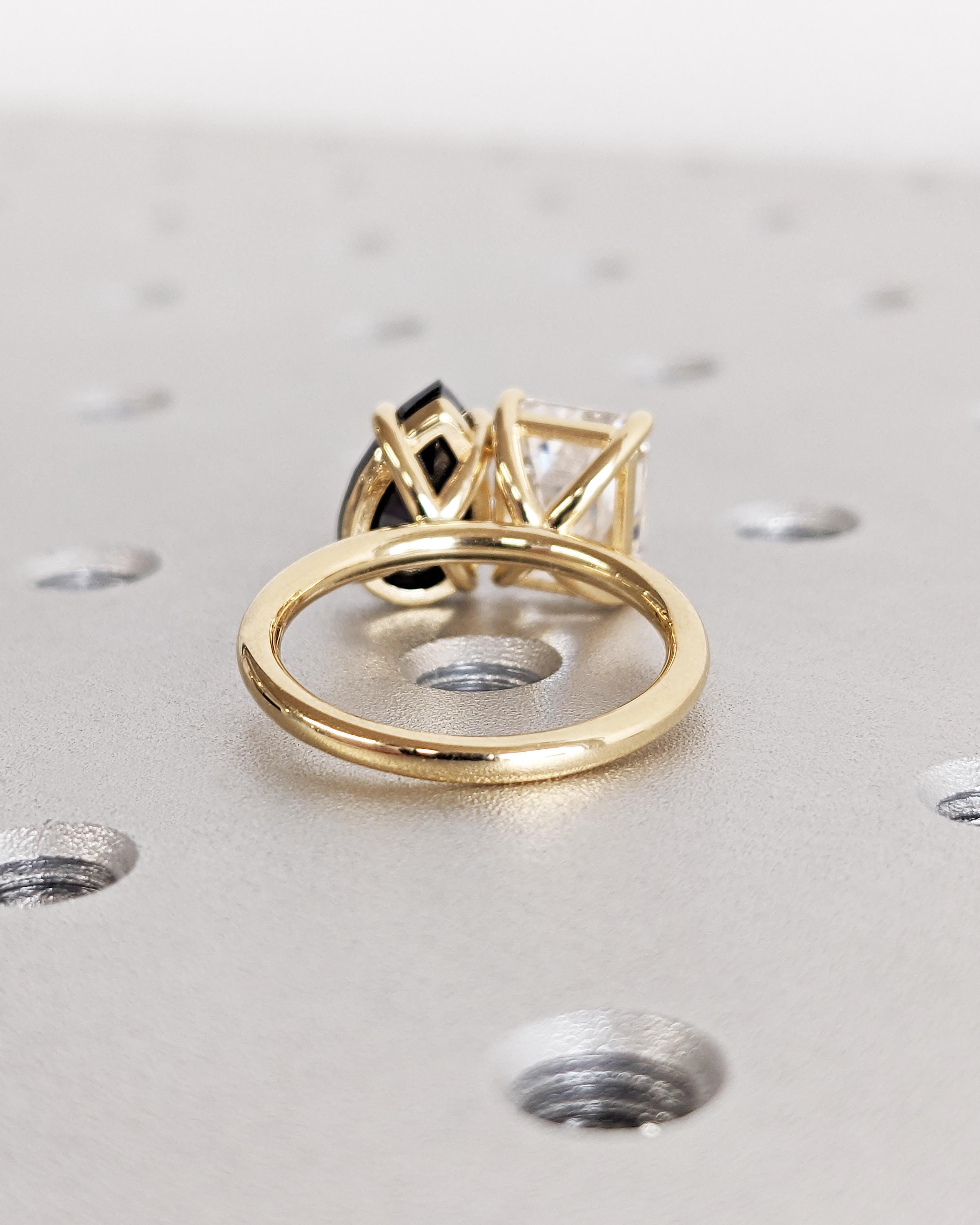 Embrace elegance and contrast with this Toi et Moi ring, featuring an emerald-cut Moissanite and a pear-cut Black Diamond. The white and black duo symbolizes strength, unity, and timeless beauty. The double stone design represents two hearts coming together, and perfect for those who want something different yet classic. An unforgettable gift for life’s most meaningful moments.