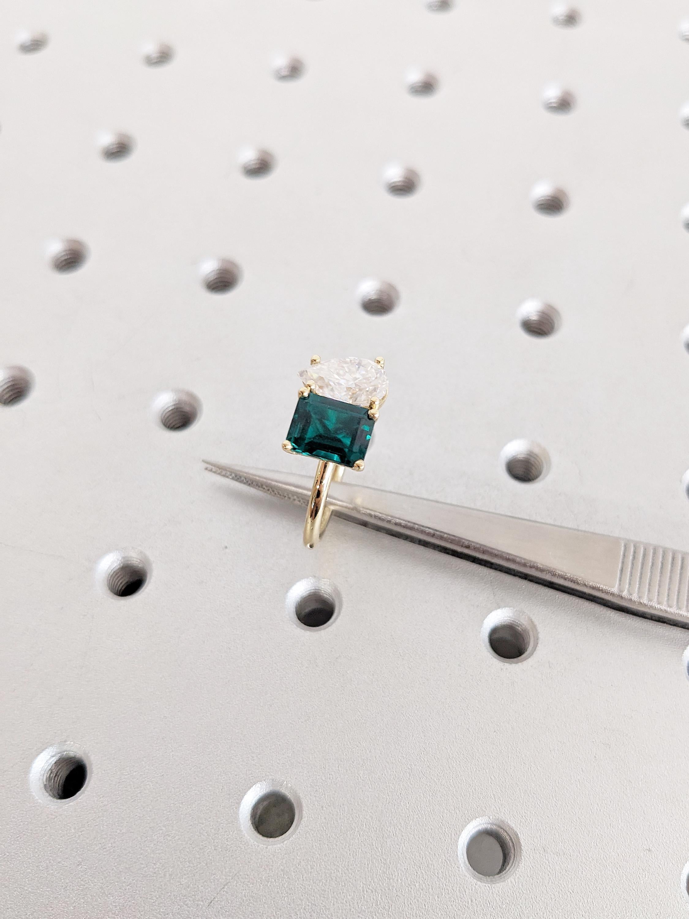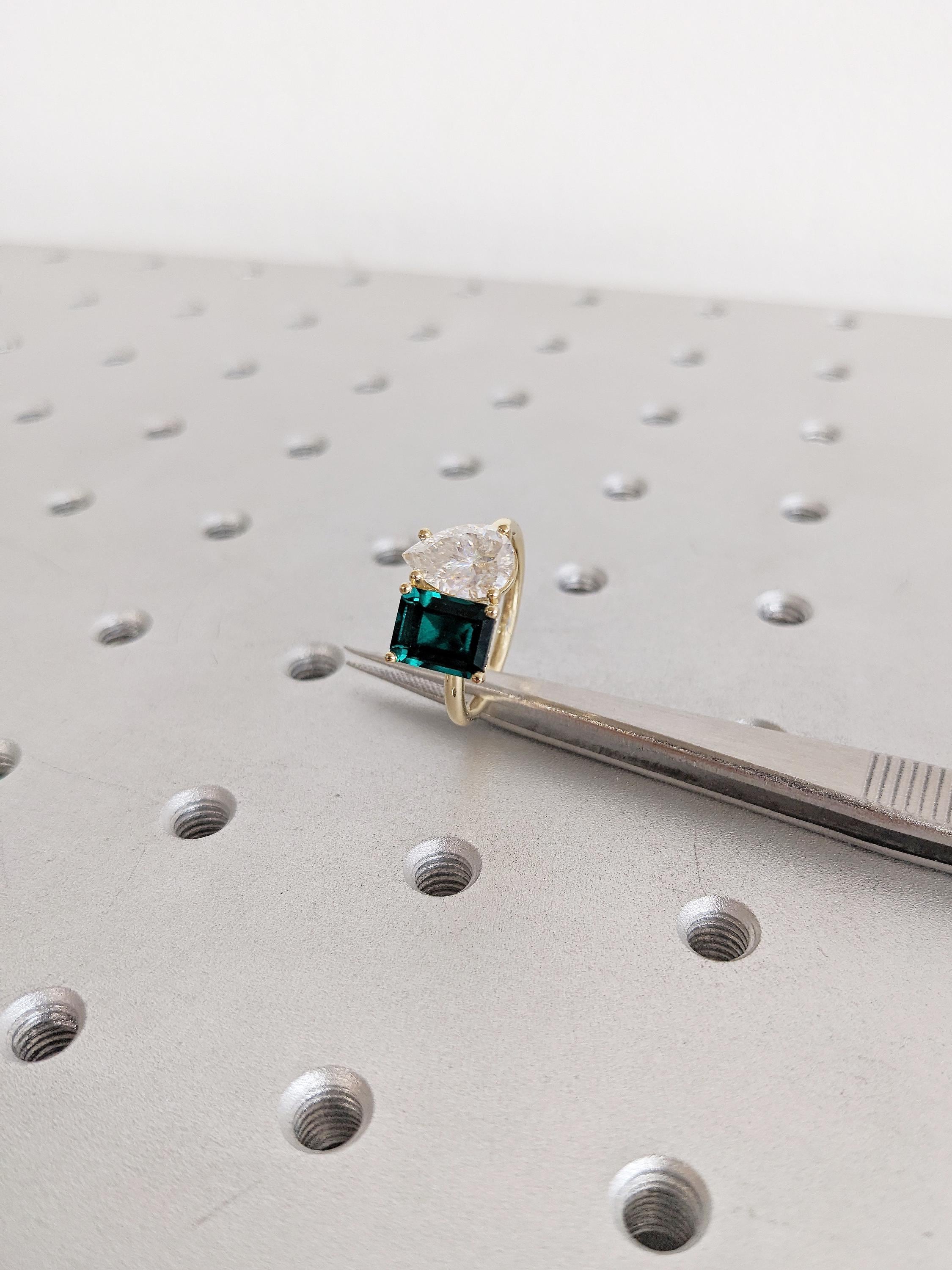 This elegant two-stone ring features a Lab Grown Emerald in a striking emerald cut, paired with a brilliant pear-shaped Moissanite, both securely set in prongs. The vivid green emerald contrasts beautifully with the sparkling moissanite, creating a harmonious balance of color and brilliance. Designed in a refined art deco style, this ring is an ideal choice for engagements or bridal wear, combining sustainable craftsmanship with timeless elegance in a unique design.