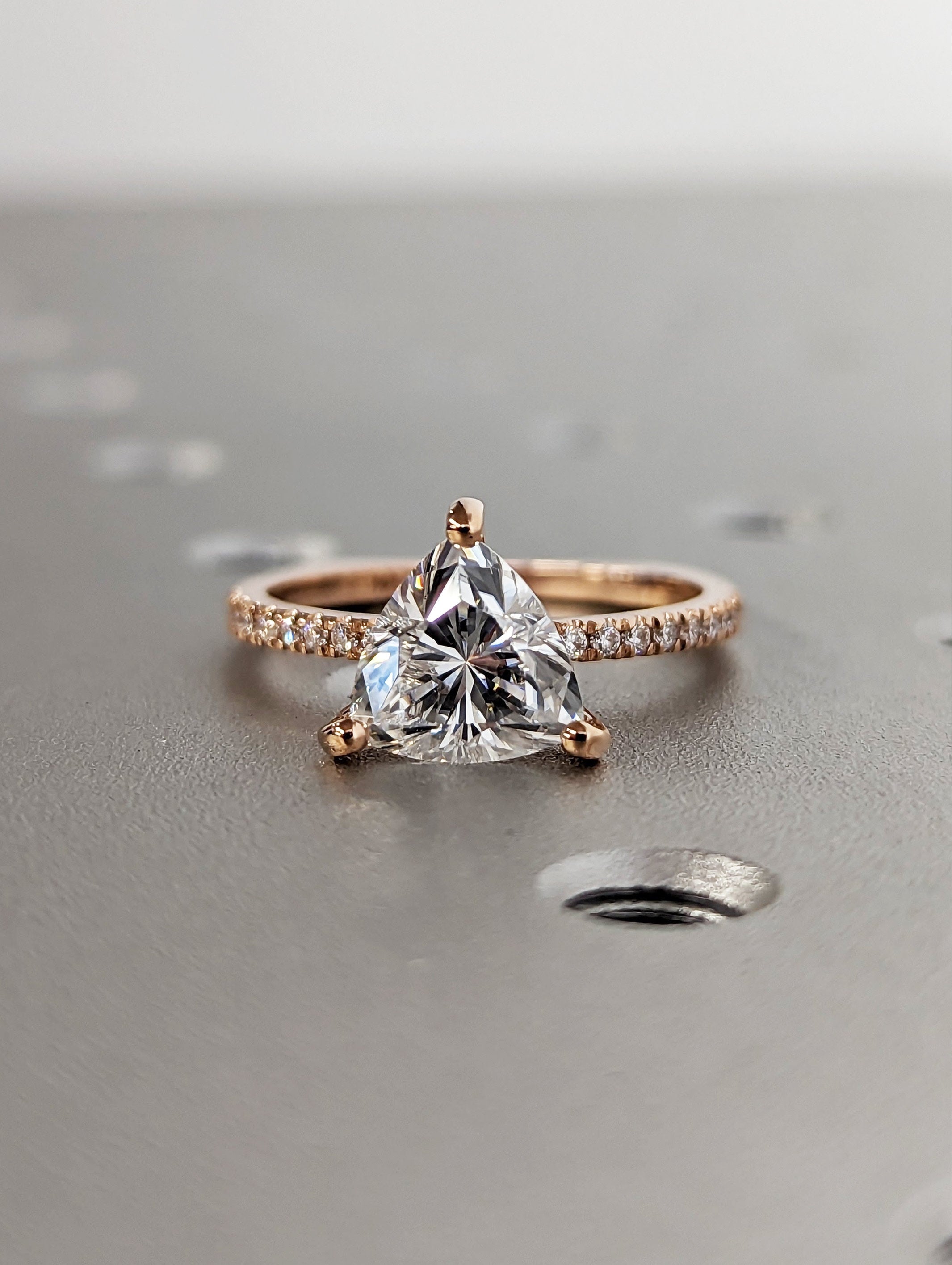 A brilliant trillion-cut moissanite takes center stage in this ring with a delicate and thin pave setting, complemented by a moissanite eternity band. The 1.6mm gold band features a European shank for added comfort and style, creating a captivating and modern piece of jewelry.