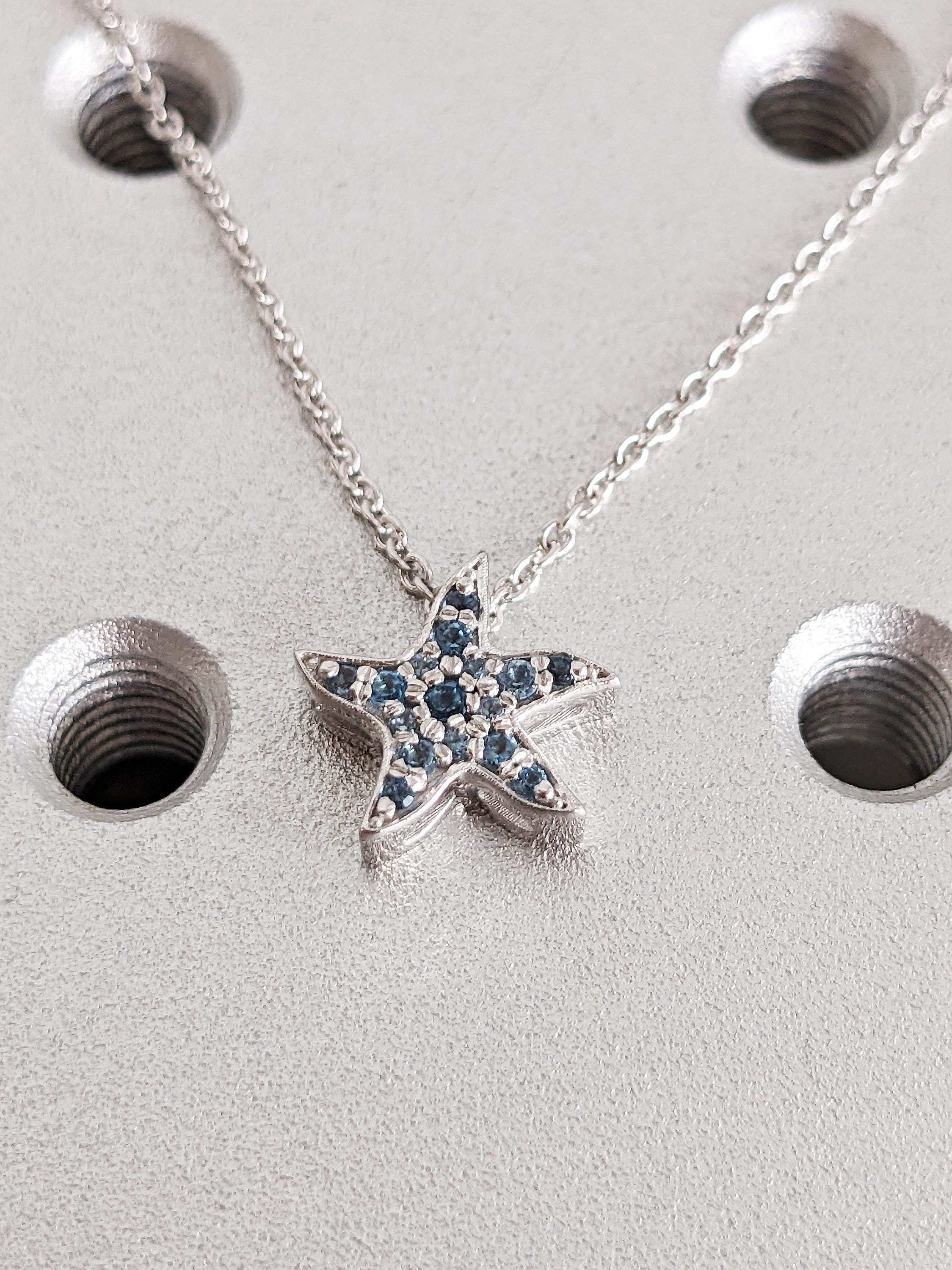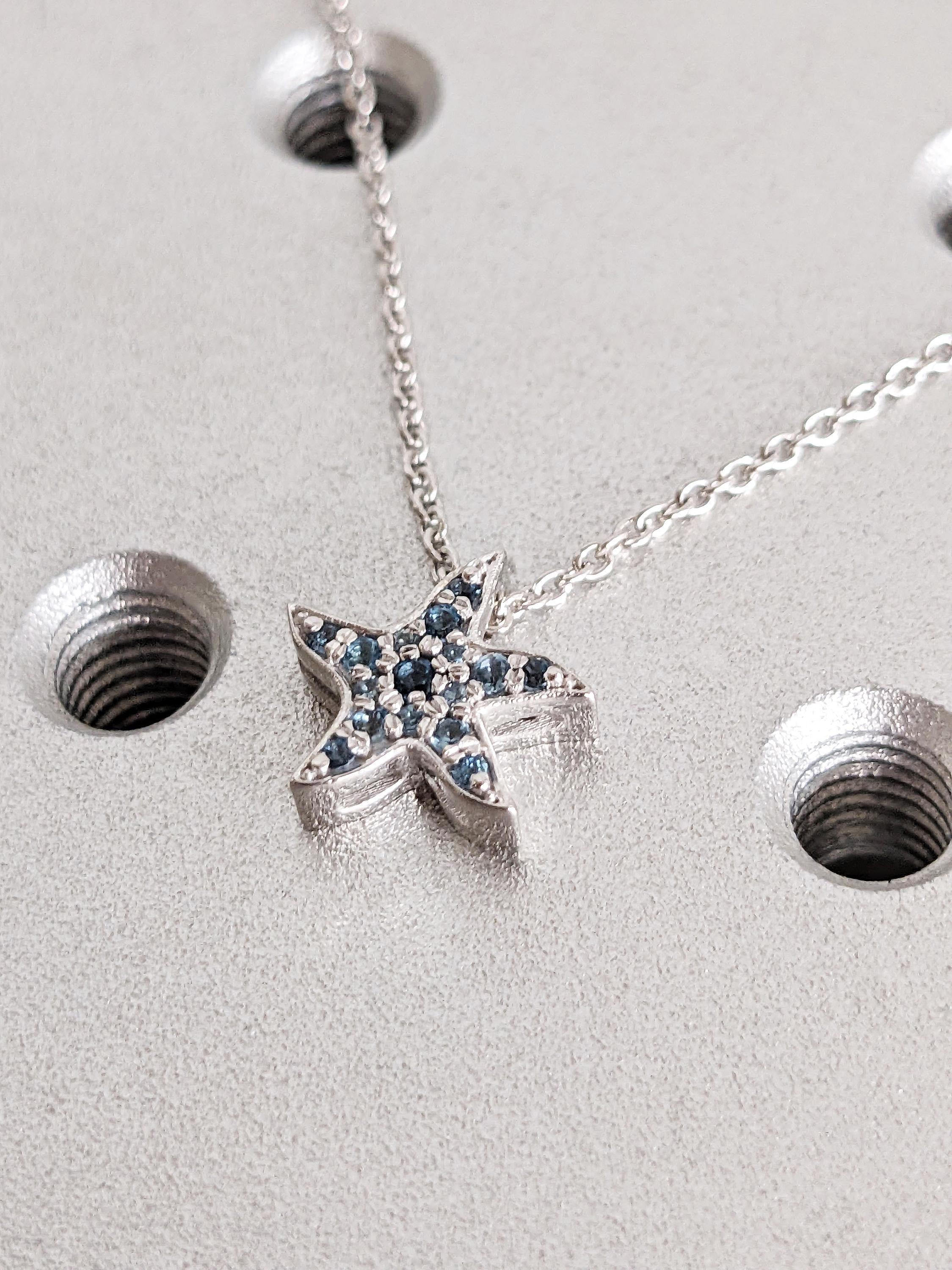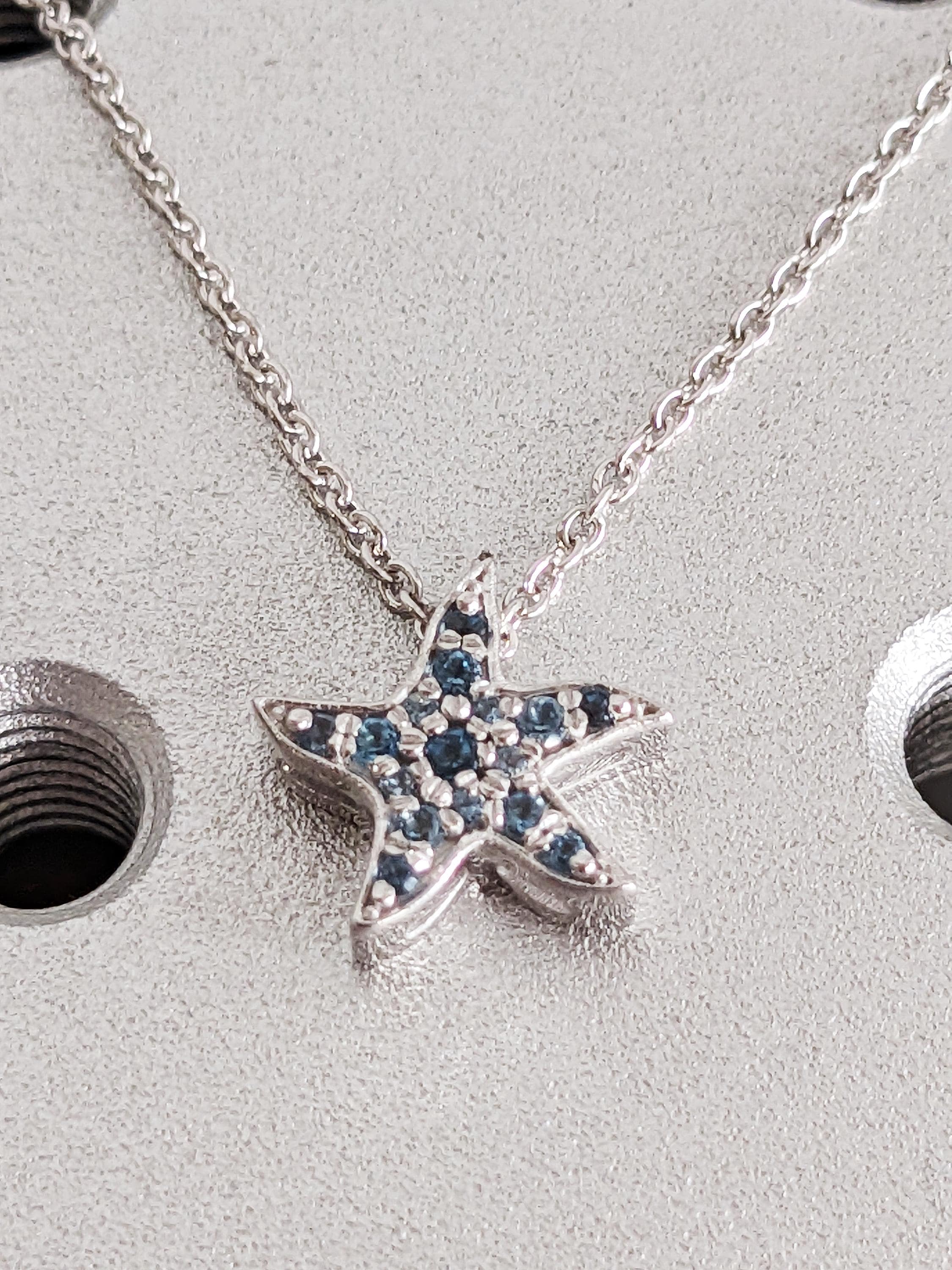 This necklace features blue topaz set in a delicate star shaped pendant, catching the light with every movement. The slim chain adds a subtle elegant touch, making it perfect for everyday wear or a gentle pop of sparkle on special occasions. A dainty feminine piece that brings a hint of celestial charm to any outfit.
