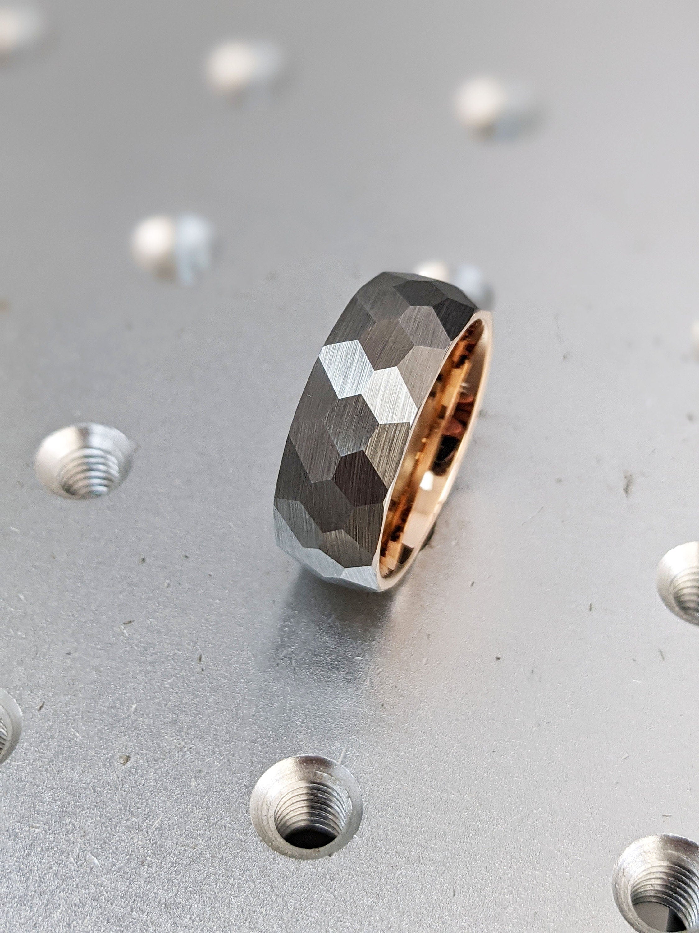 This wide hammered tungsten men’s wedding band features a wide hammered finish with a rose gold plated interior for a modern, masculine look. Crafted to be cobalt-free and hypoallergenic, it ensures lasting comfort and durability. With its comfort-fit design, this ring is perfect for everyday wear while symbolizing strength and timeless commitment.