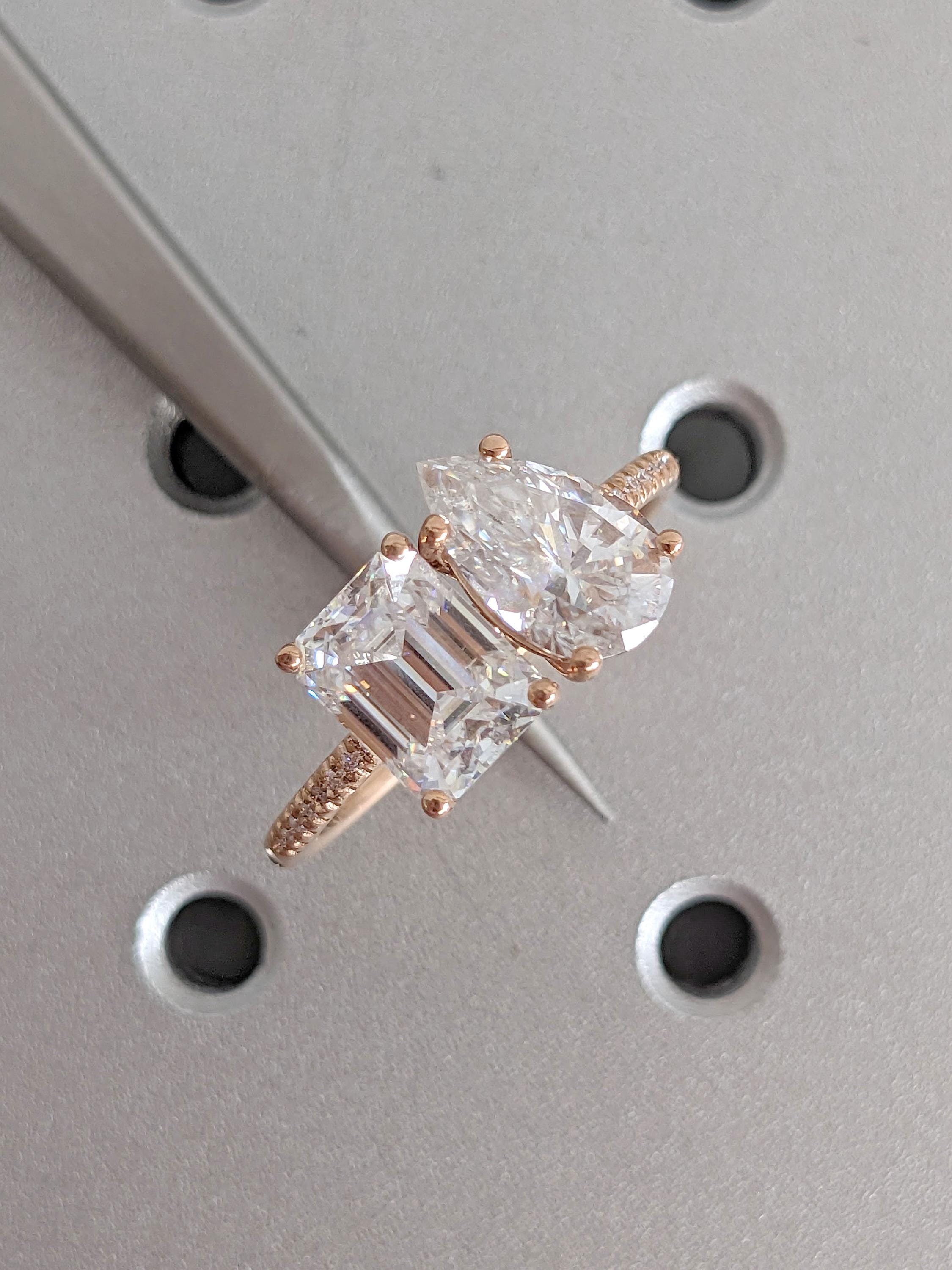 This modern Toi et Moi ring pairs two sparkling Moissanite, an elegant emerald-cut stone and a romantic pear-cut stone, symbolizing two souls coming together as one. Both centers rest on a refined paved half eternity band, adding just the right amount of sparkle without overwhelming the design.