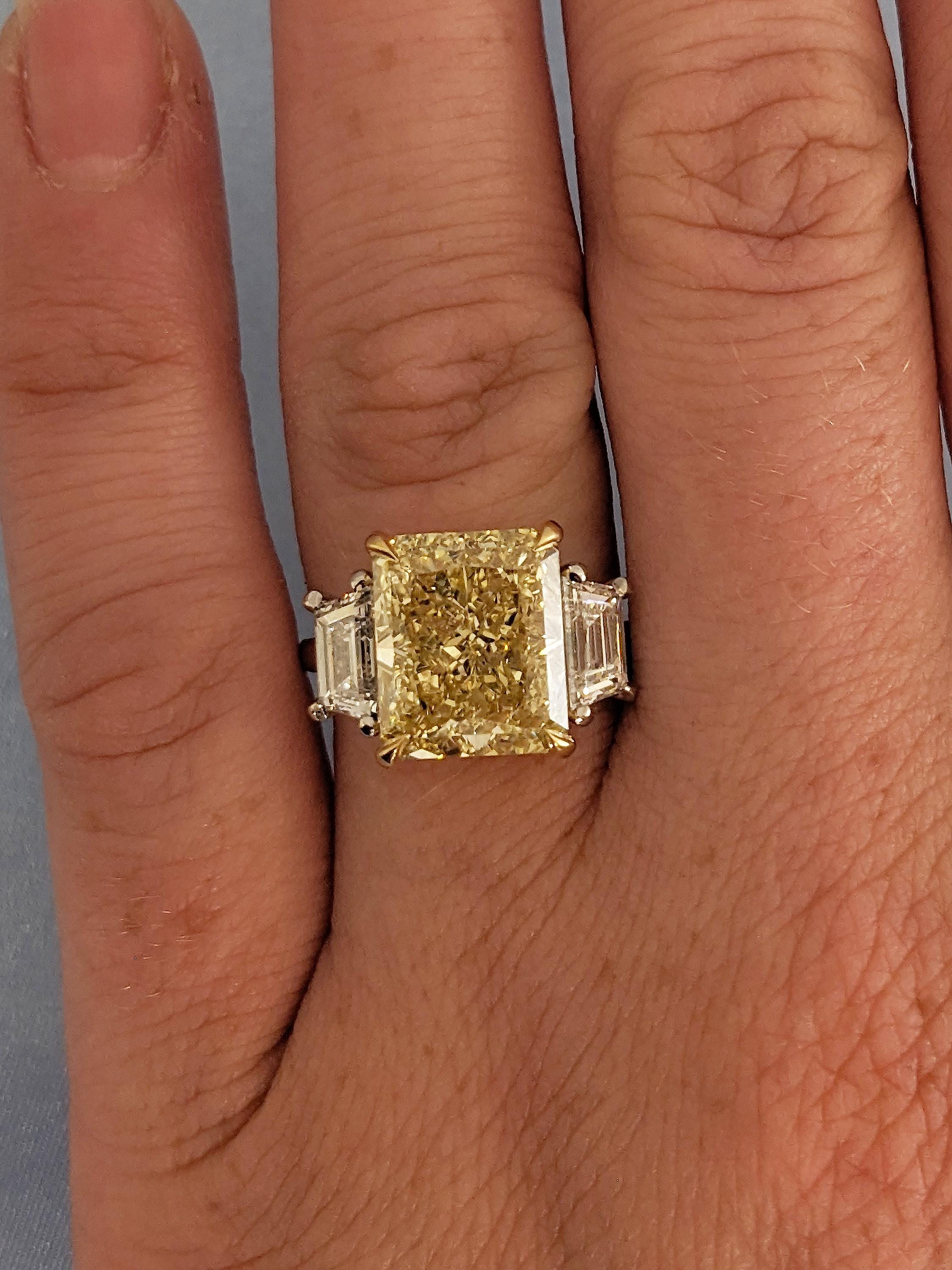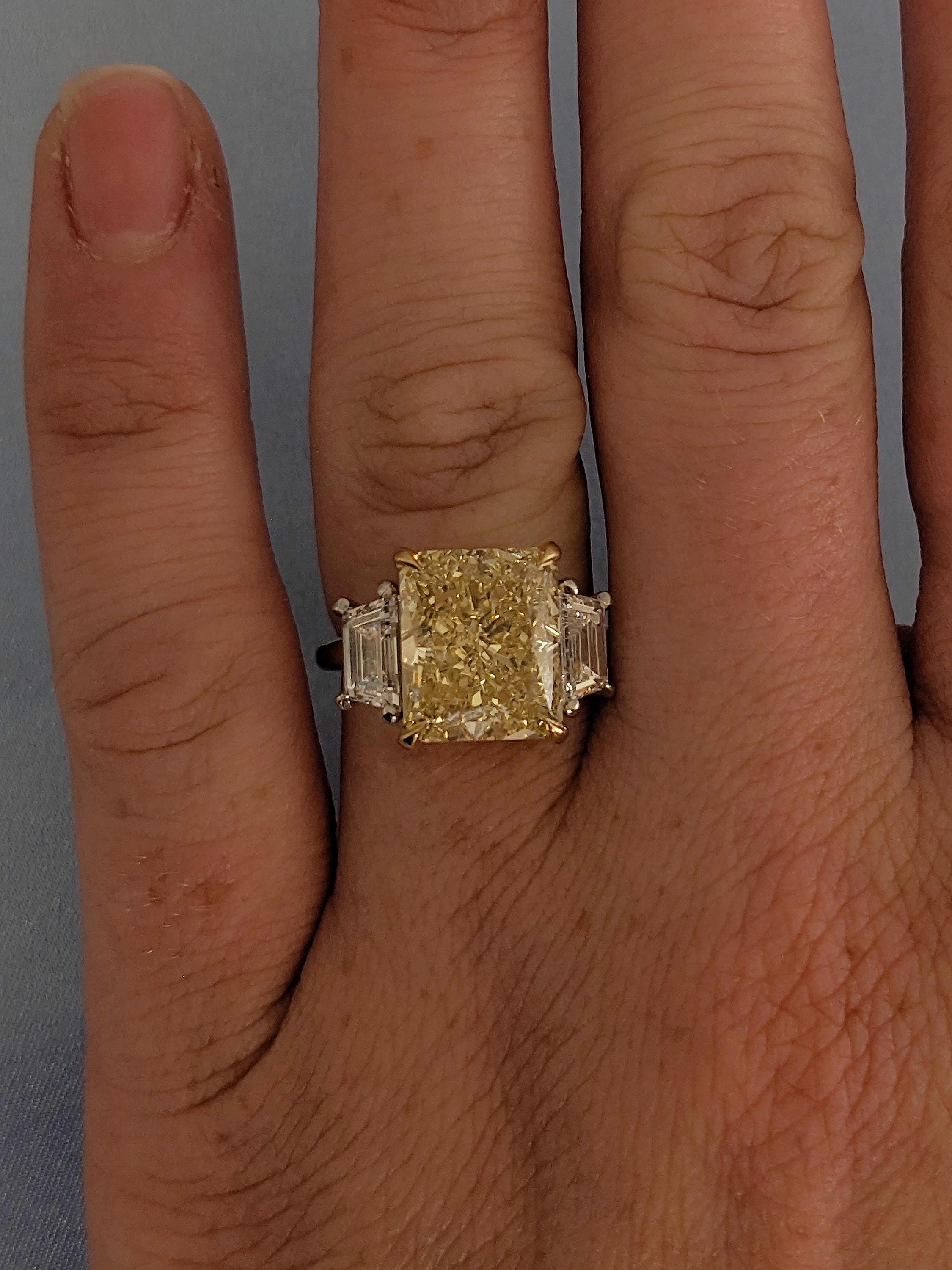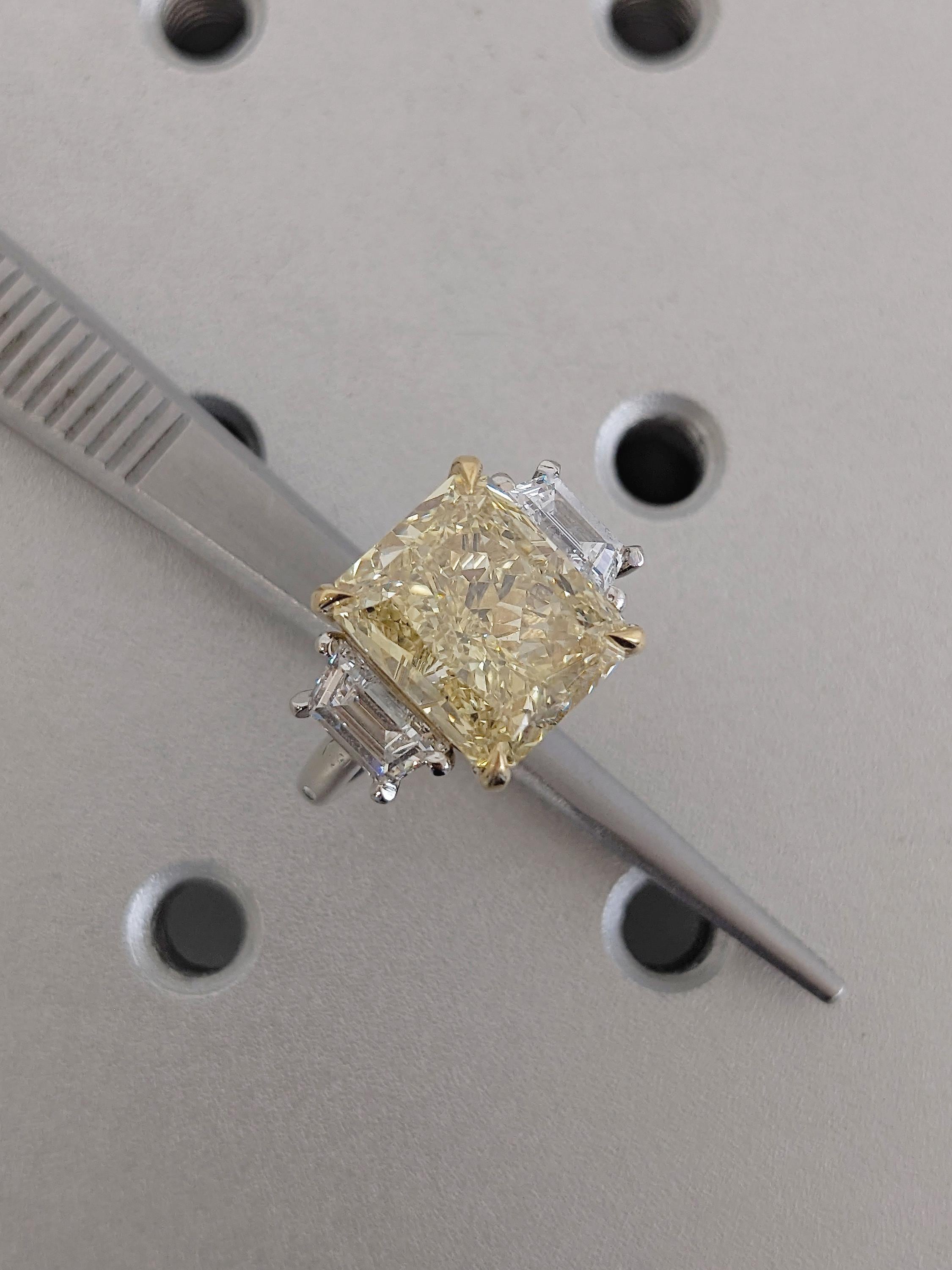 This radiant cut yellow Lab Grown Diamond engagement ring makes a bold yet refined statement. The vibrant yellow center stone is flanked by trapezoid-cut moissanite side stones, offering exceptional sparkle and elegant balance. Finished in a sophisticated two-tone design with contrasting head and shank, this ring blends modern luxury with timeless appeal.