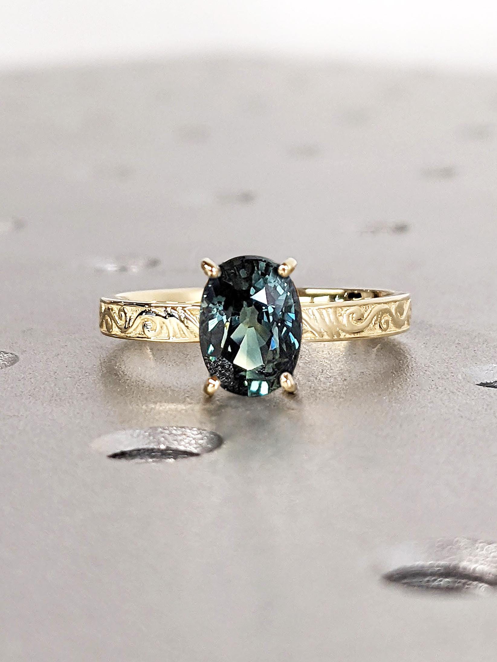 Unique 1 Carat Green Sapphire Ring | Solid Yellow Gold Engagement Ring | Antique Proposal Ring | Scrollwork Engraving | Sapphire Engagement