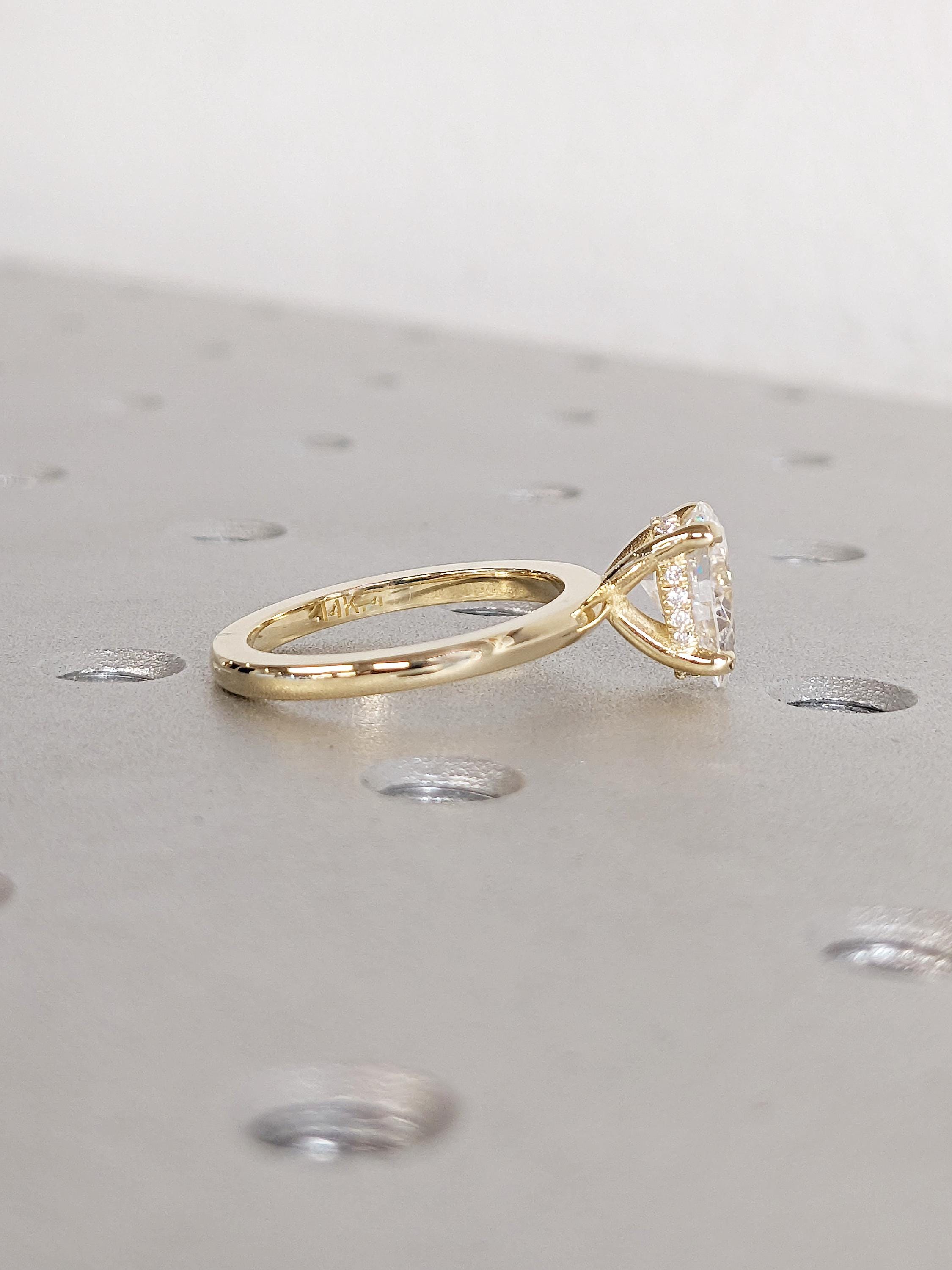 A timeless solitaire ring, features a pear cut Moissanite center on a high profile talon prong setting. With a thin band of 1.8mm width, and a hidden halo paved with your choice of Natural Diamonds, Lab Grown Diamonds or Moissanites. This minimalist statement piece exudes an effortless elegance and sparkles from all angles, the perfect gift and jewelry for any occasion.