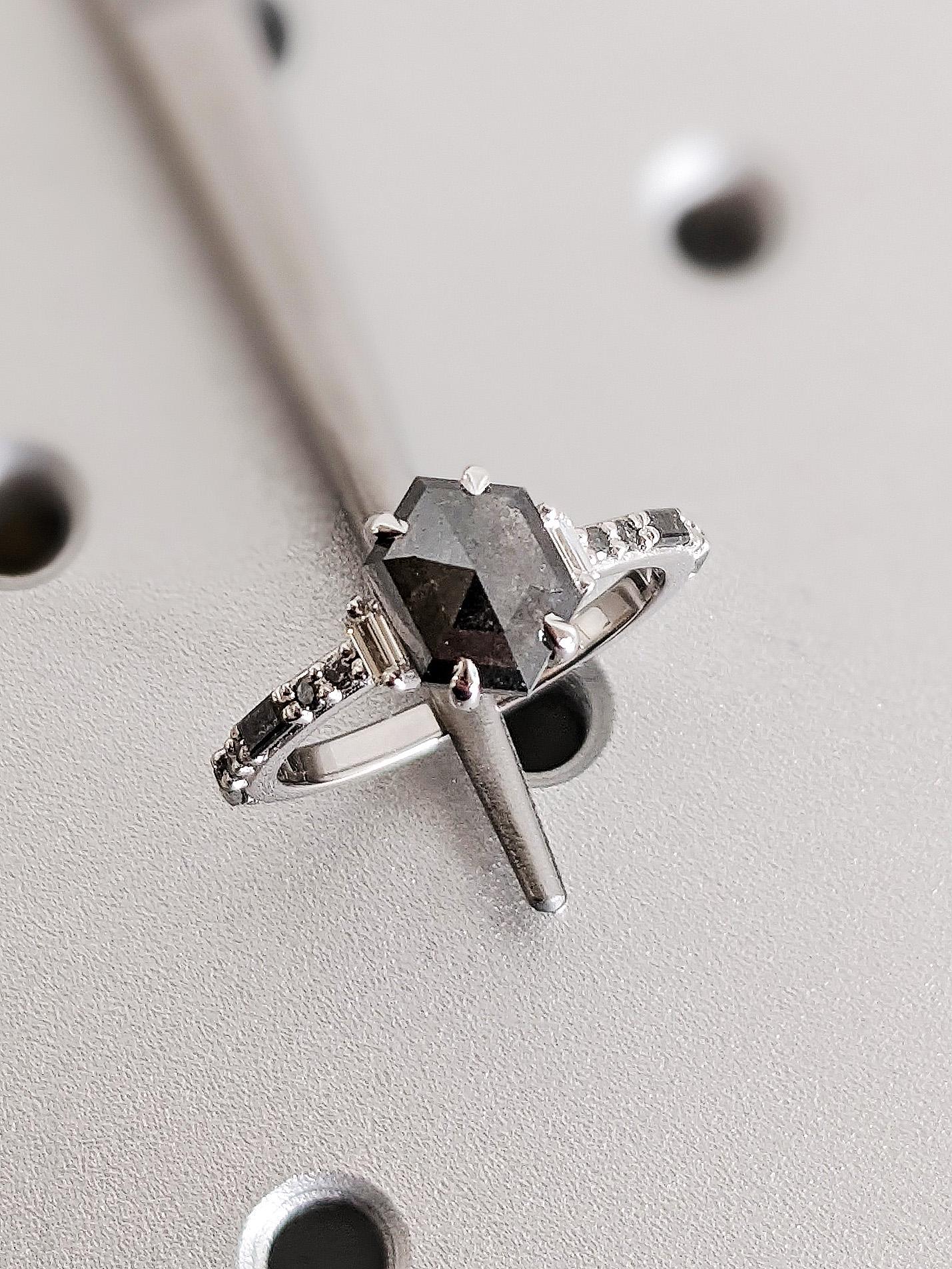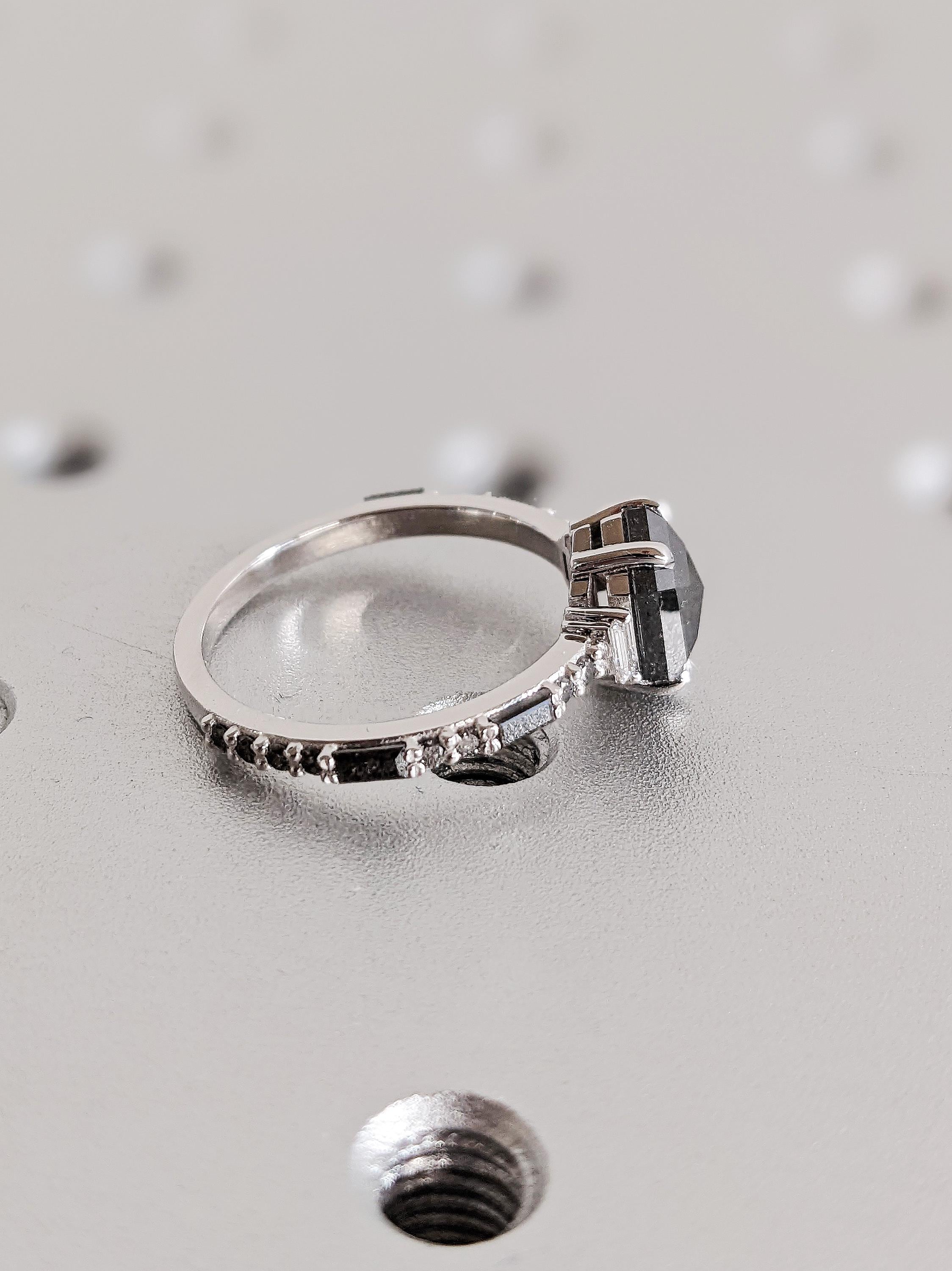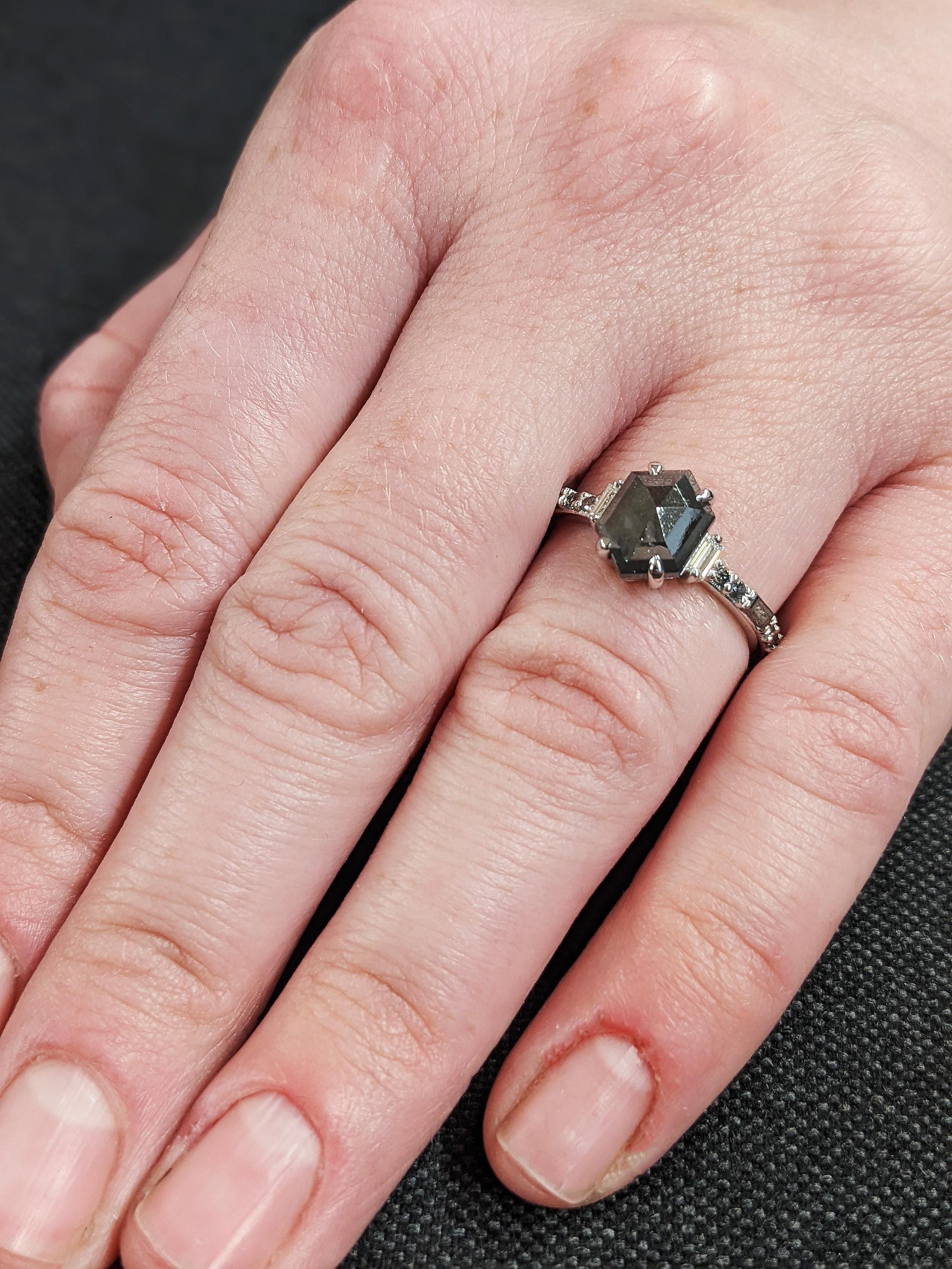 This unique engagement ring highlights a captivating hexagon Salt and Pepper diamond. A blend of raw beauty and refined design. Framed by two baguette side stones of Natural Diamonds, it balances modern geometry with classic elegance. Along the band, alternating baguette and round salt and pepper diamonds create a graceful half eternity sparkle.