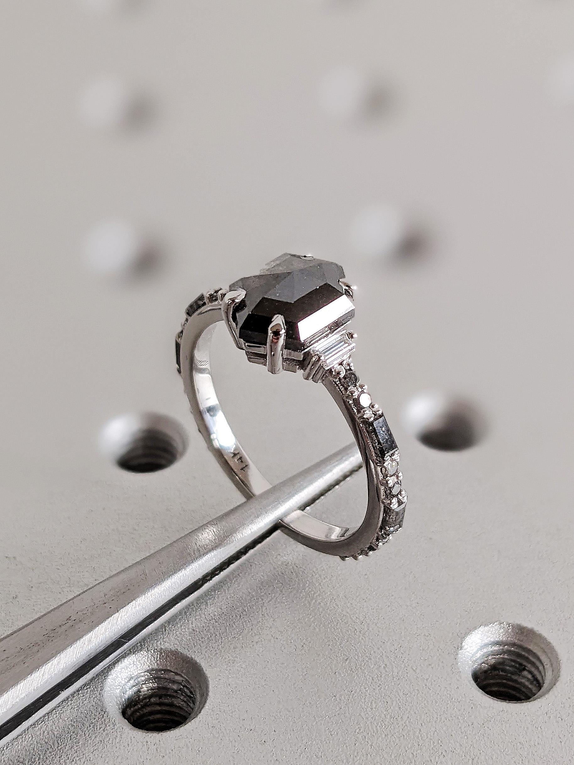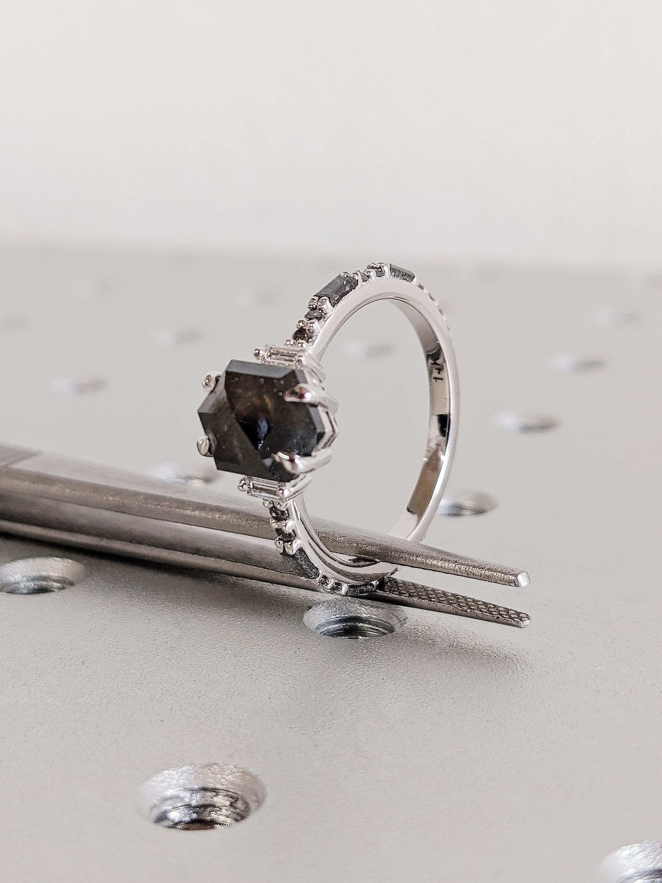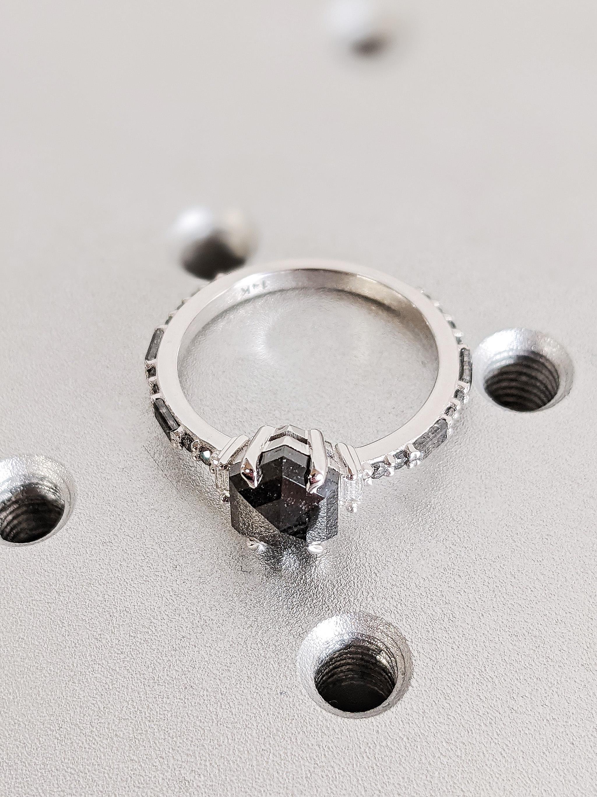 This unique engagement ring highlights a captivating hexagon Salt and Pepper diamond. A blend of raw beauty and refined design. Framed by two baguette side stones of Natural Diamonds, it balances modern geometry with classic elegance. Along the band, alternating baguette and round salt and pepper diamonds create a graceful half eternity sparkle.