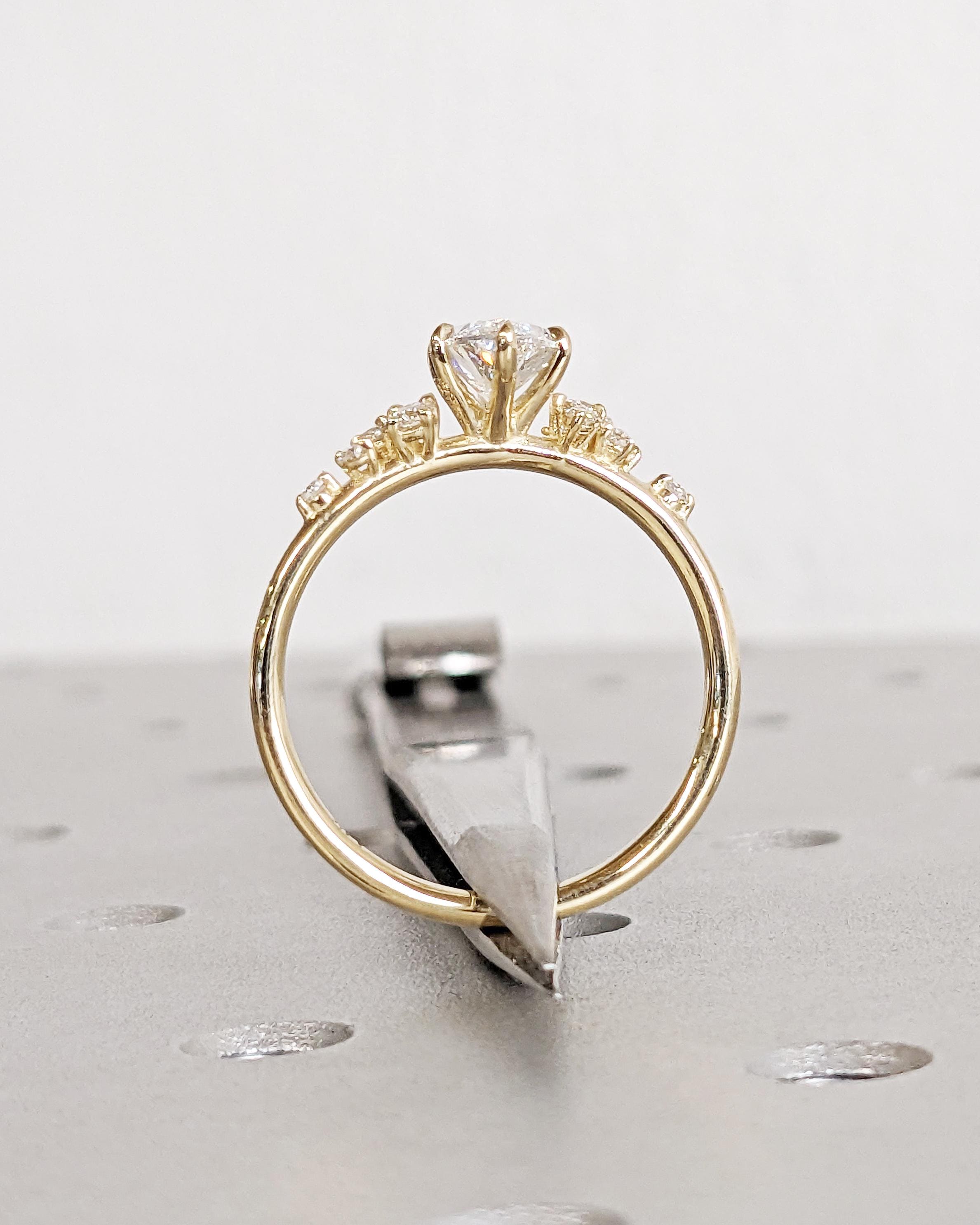 This marquise cut Moissanite engagement ring features shimmering snowdrift clusters on each side. The scattered sparkle evokes freshly fallen snow, giving it a soft and romantic charm. Side stones are available in Natural Diamond, Lab Diamond or Moissanite. A ring as unique and radiant as your love story.