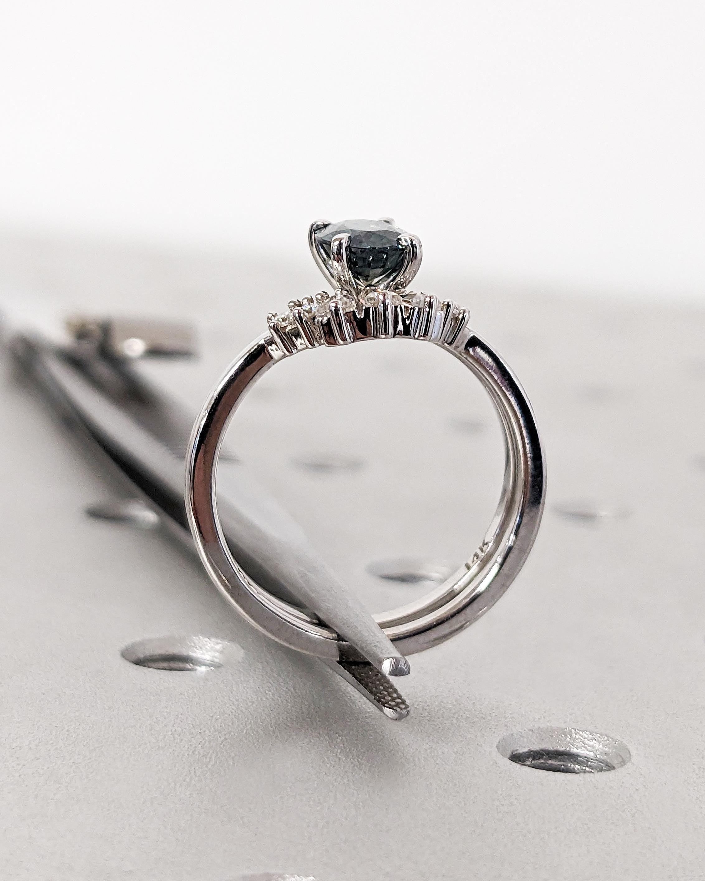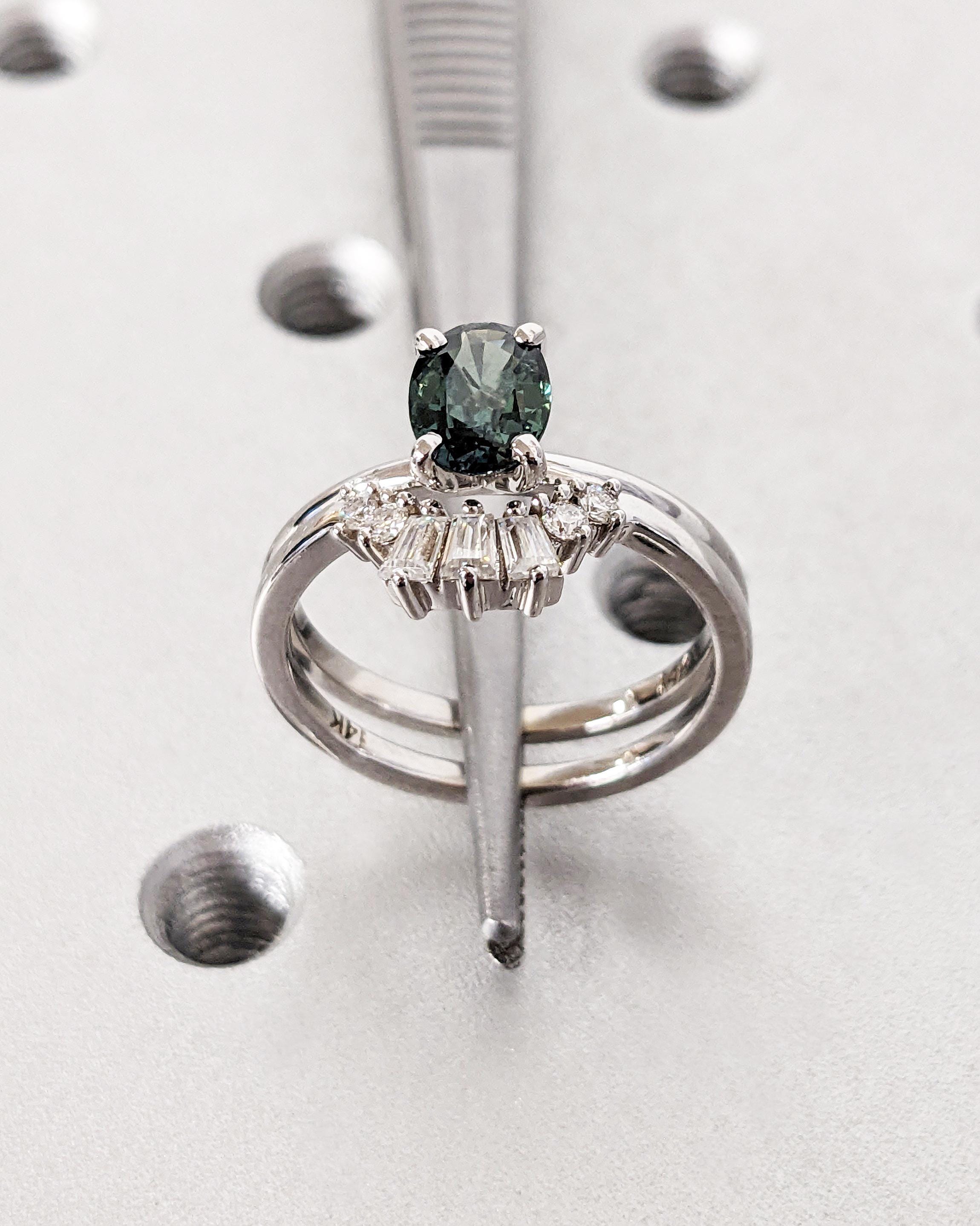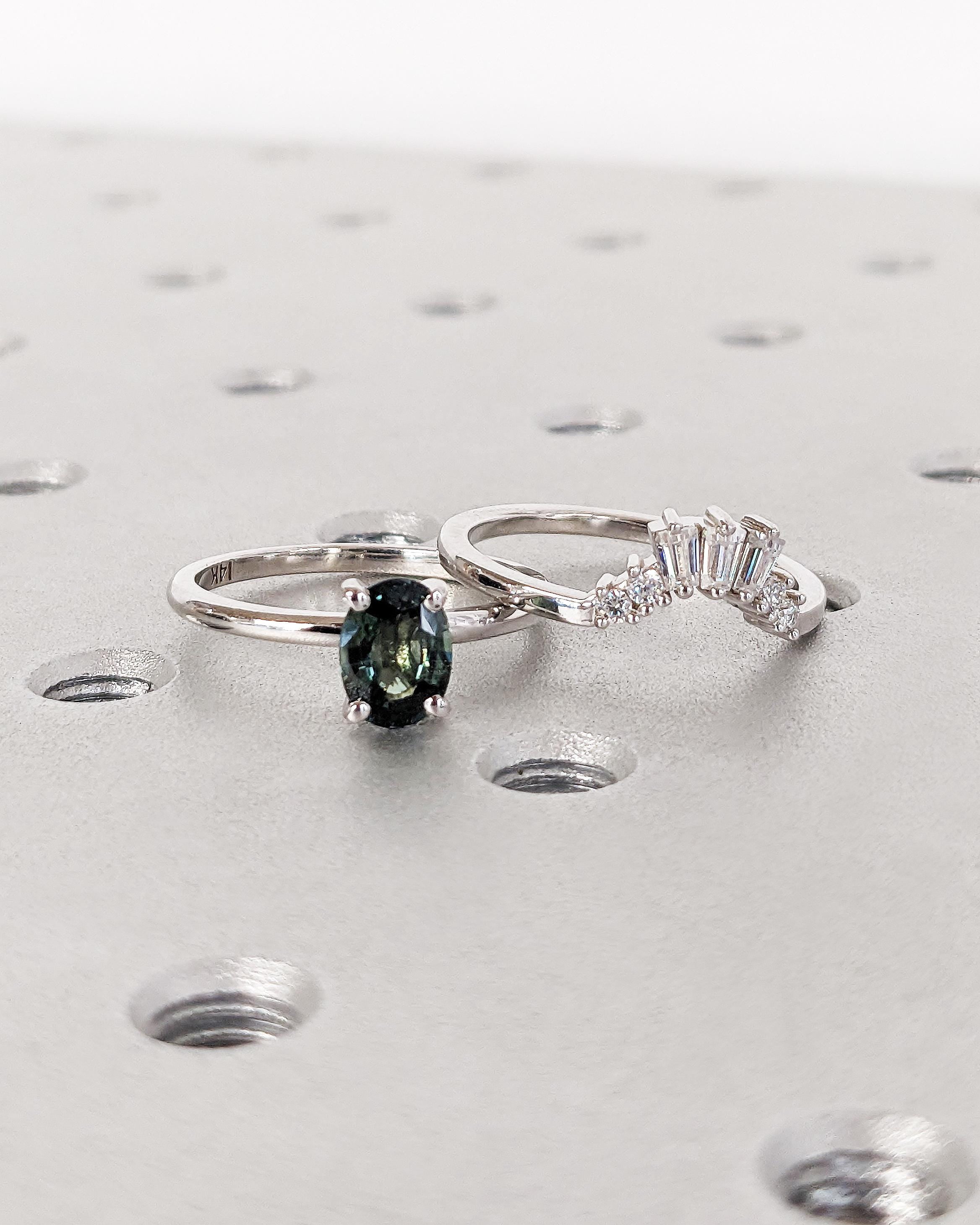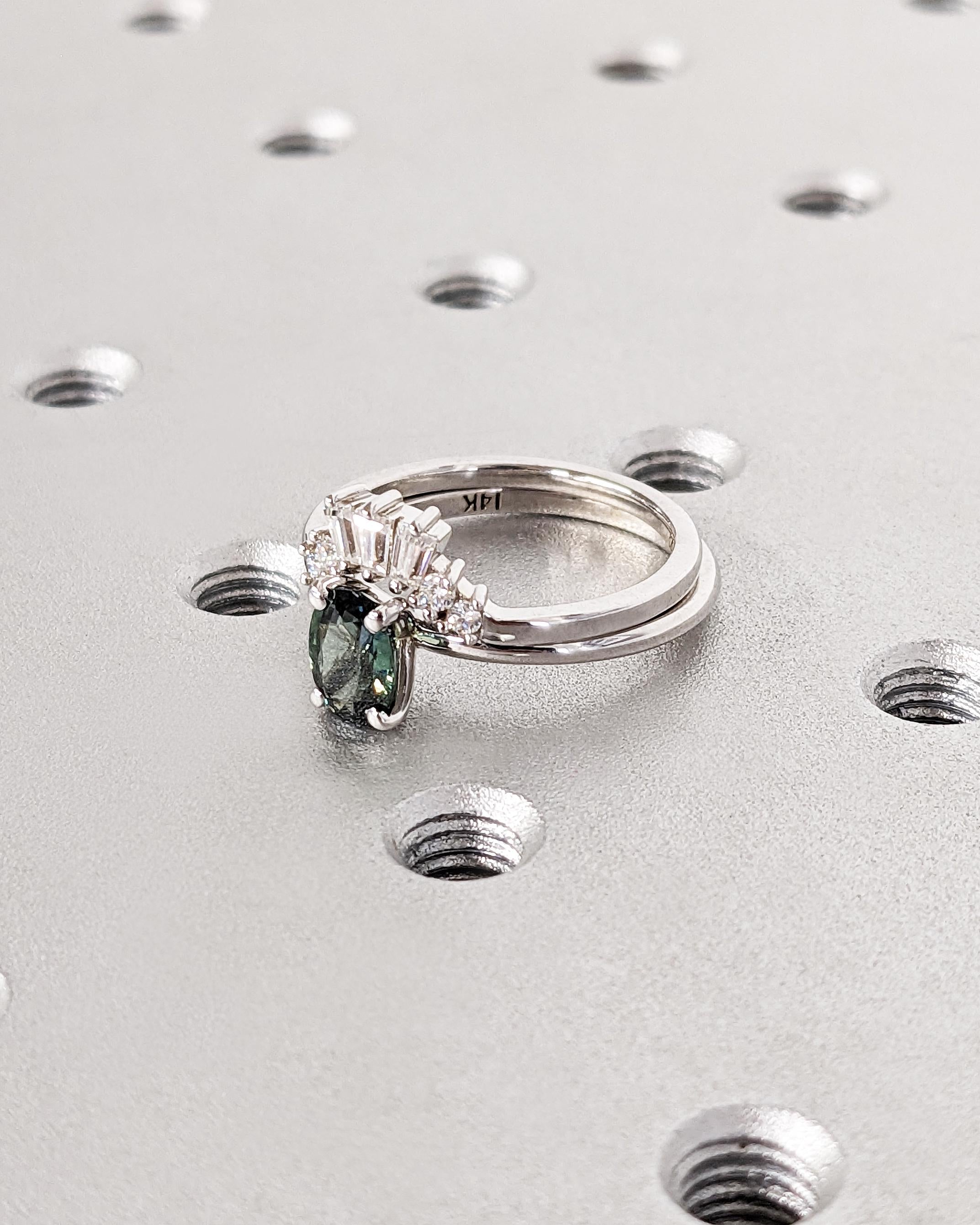 Unique Blue Green Natural Sapphire Engagement Ring Set | Oval Sapphire and Diamond Wedding Anniversary Ring | Diamond Cluster Stacking Ring