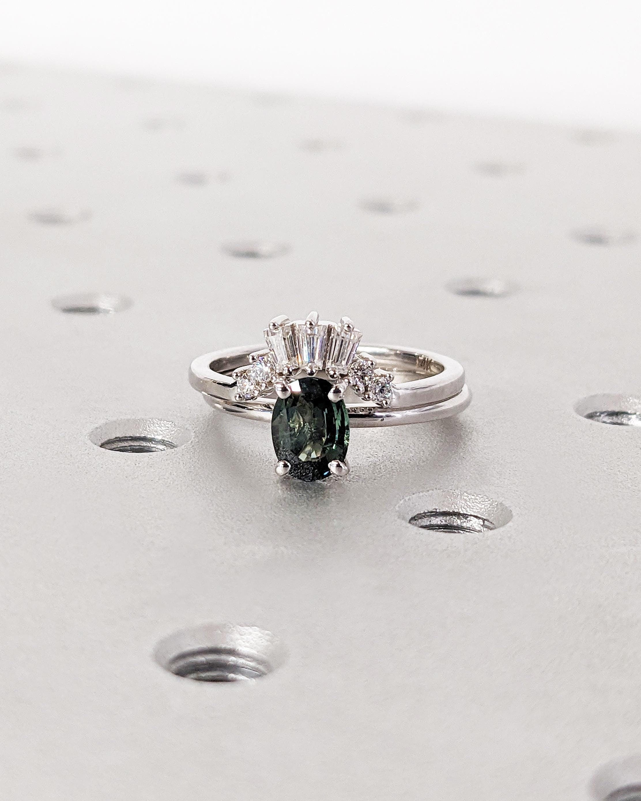Crafted for elegance, this wedding ring set features an oval-cut peacock sapphire on a slim 1.6mm band, exuding minimalist sophistication. The matching band enhances its allure with tapered baguette and round side stones, available in natural diamonds or moissanites. Together, they symbolize a balance of simplicity and refined elegance, making it a timeless choice for your love story.