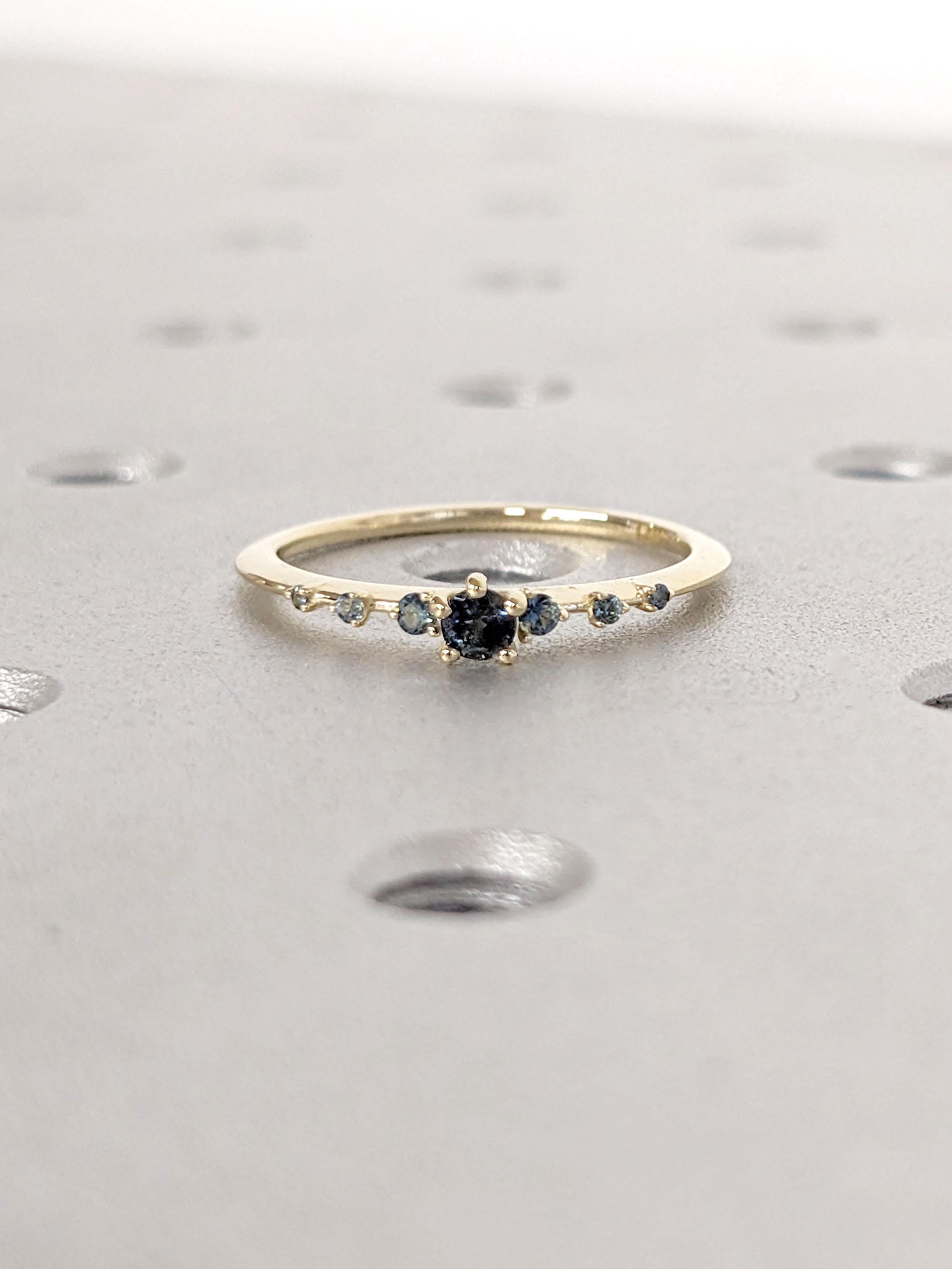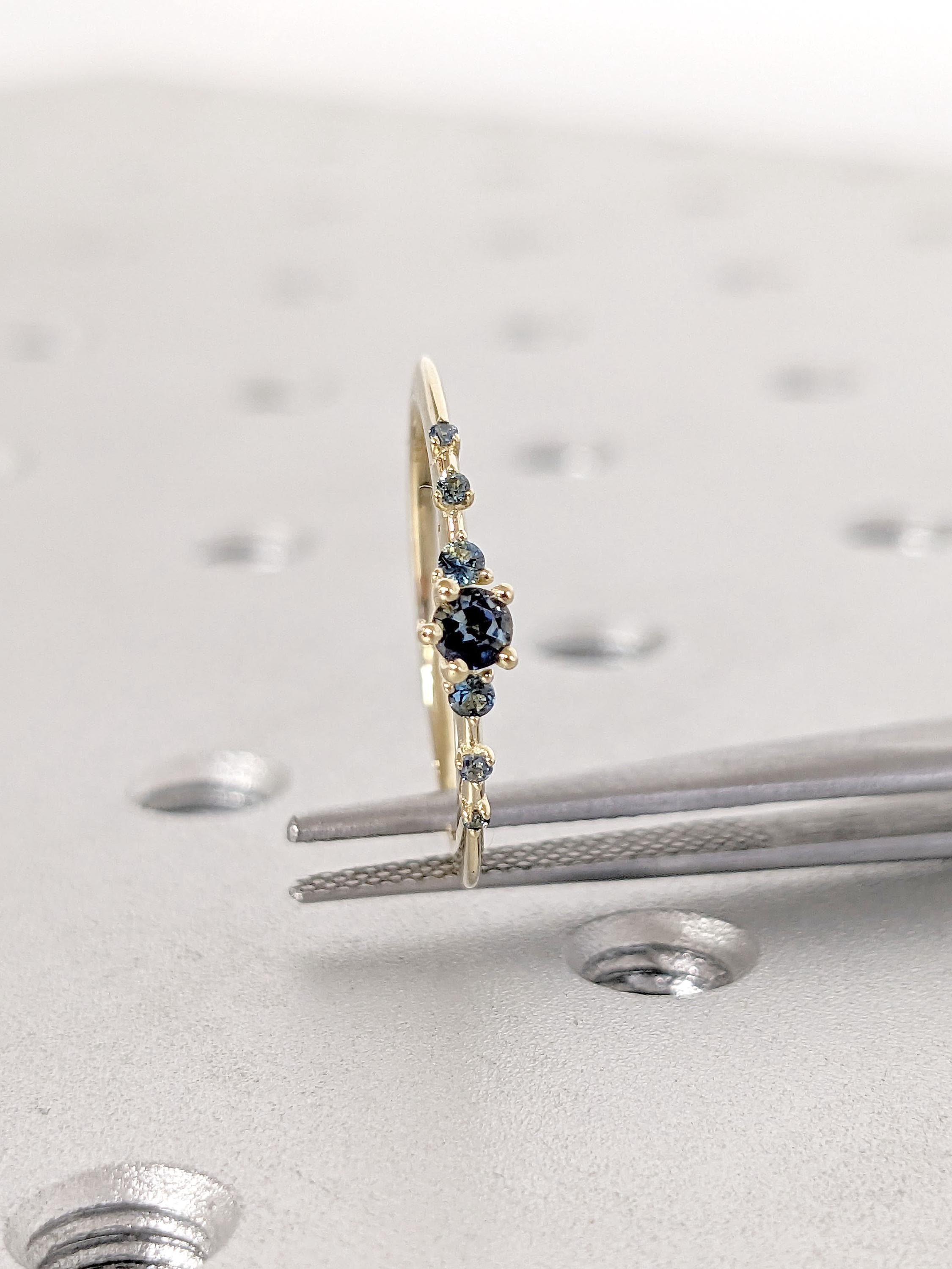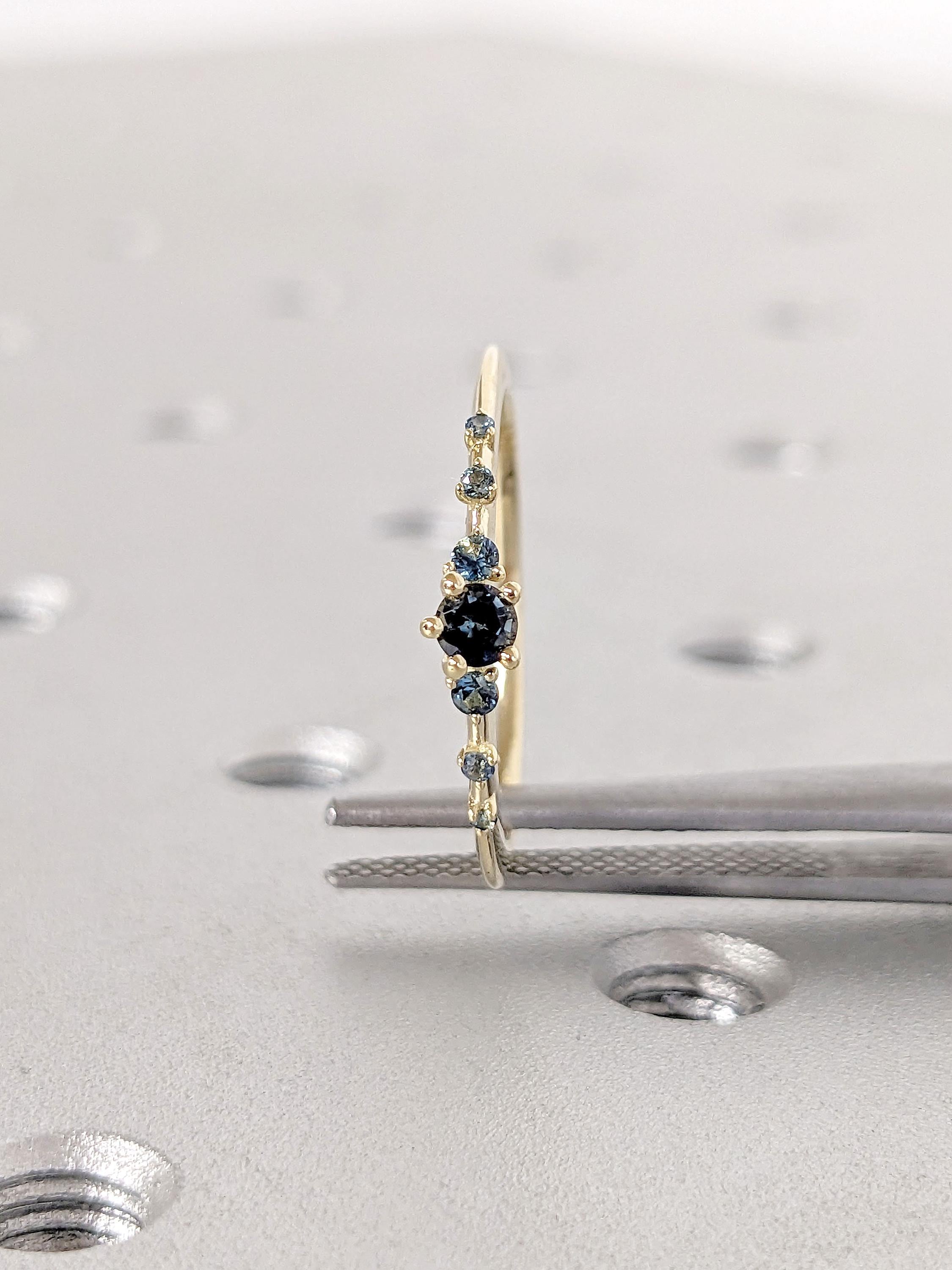 A delicate dainty ring, features clusters of natural Sapphire gemstones, elegantly set on a thin knife edge band, gradually increasing in stone size leading to the center focal stone. Timeless and trendy, the dazzling blue green hue from the Sapphires instantly elevates your styles for a subtle luxury suitable for any occasion.
