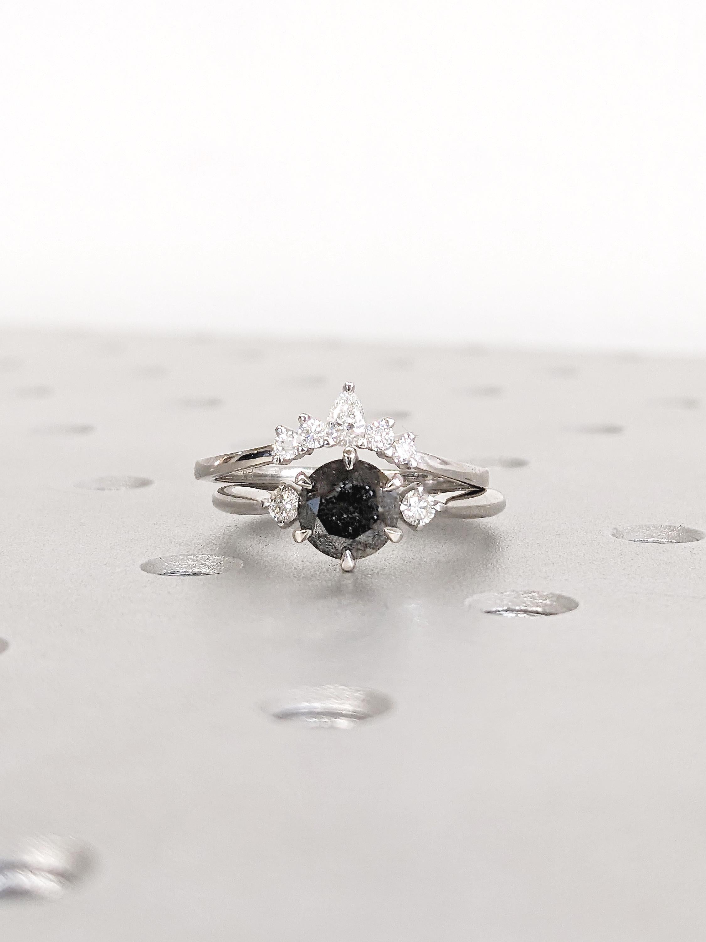 This Salt and Pepper Diamond bridal set features a striking round center stone framed by a radiant cluster of lab grown diamond side stones, creating a bold yet romantic look. The engagement ring’s galaxy-like center pairs beautifully with the sleek matching band, enhancing its sparkle and structure. Together, they form a modern, artful set perfect for a bride who loves character, brilliance, and contemporary elegance.