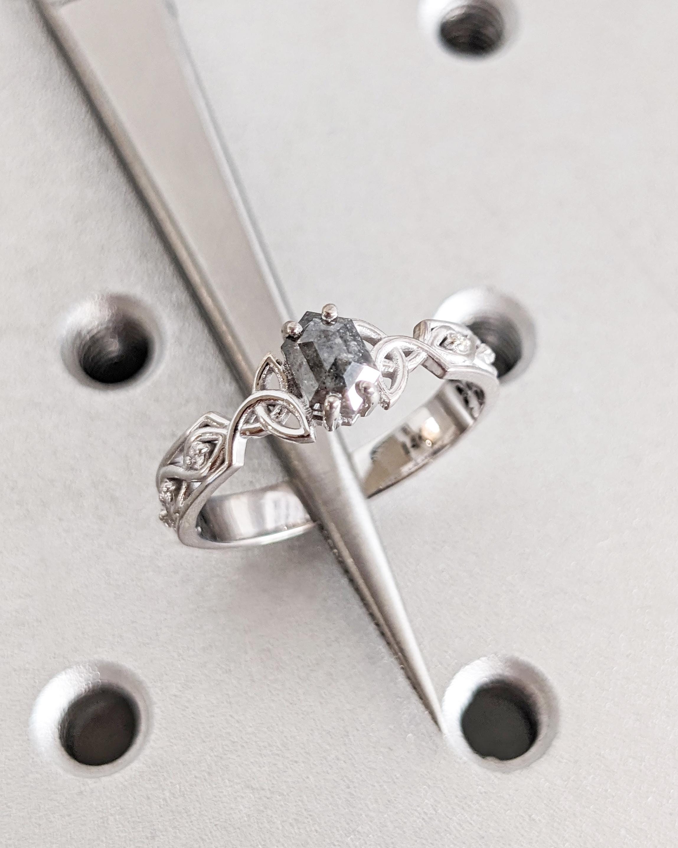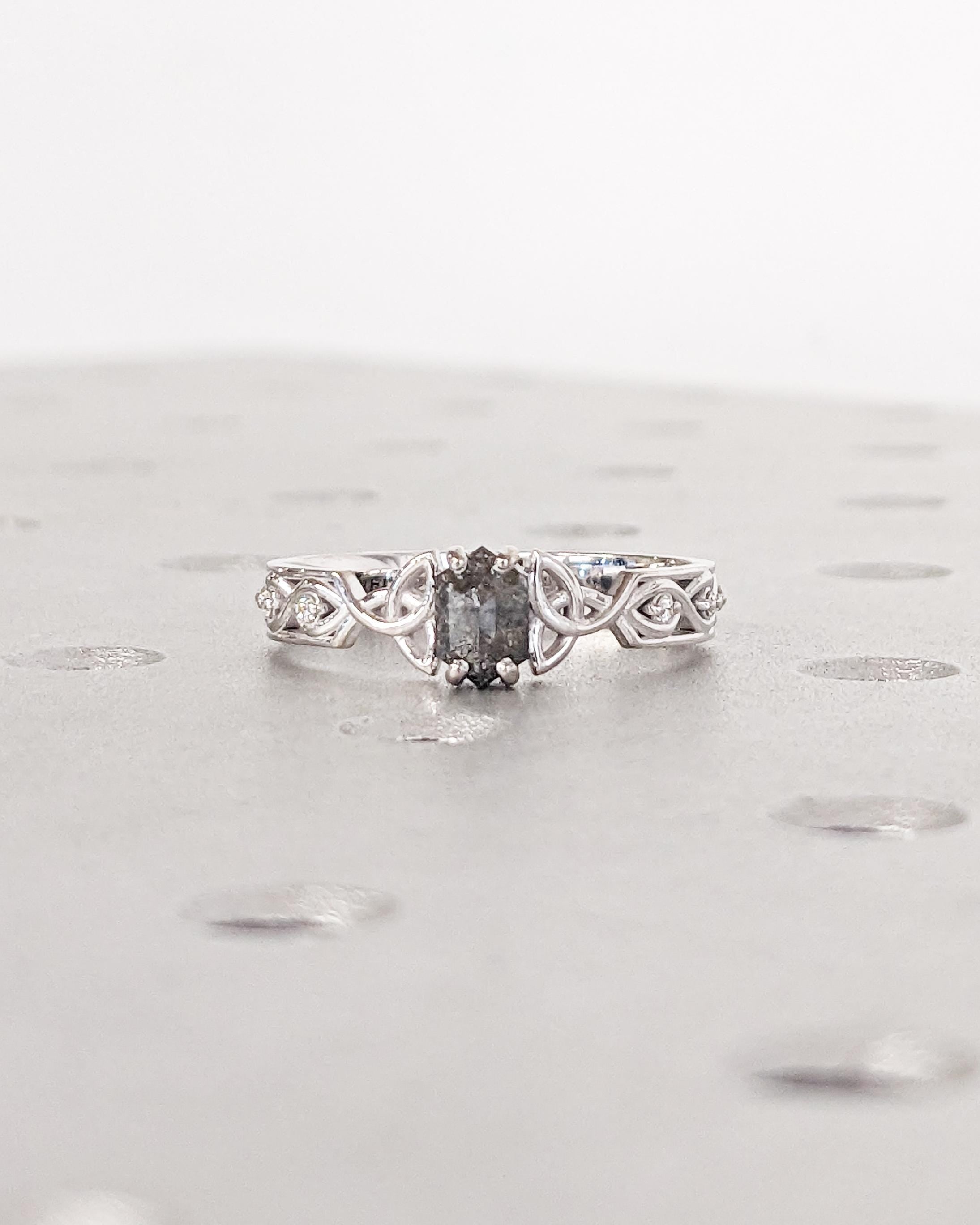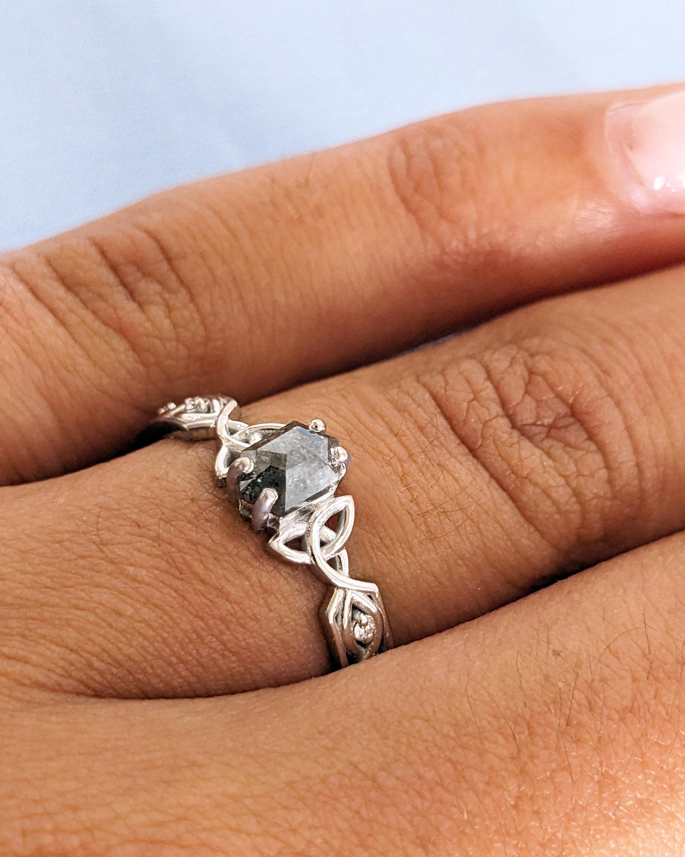 This hexagon salt and pepper diamond engagement ring is truly one-of-a-kind. The Celtic trinity knots honor love, protection, and eternity. Diamond side stones offer a bright, elegant touch. A romantic and meaningful engagement piece full of artistry, heritage, and heartfelt symbolism.