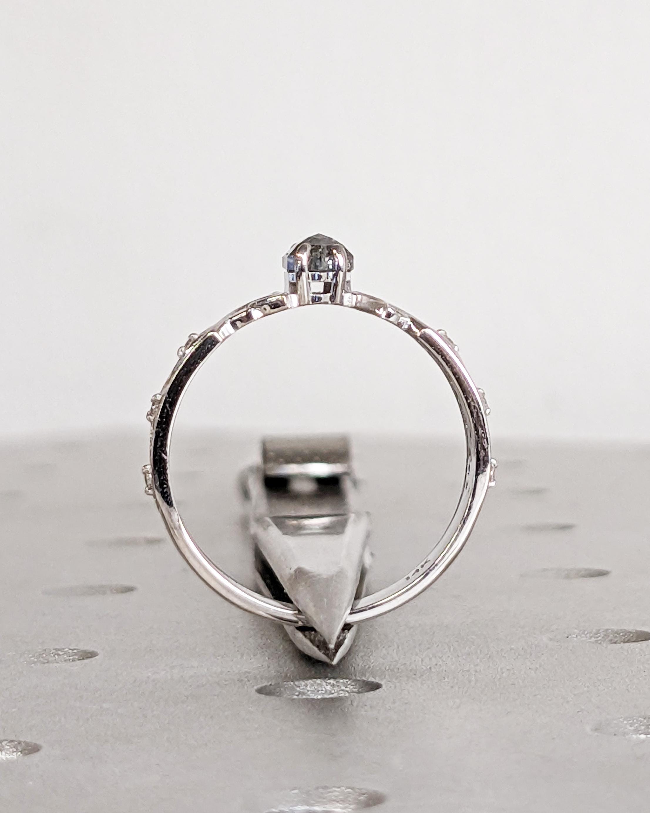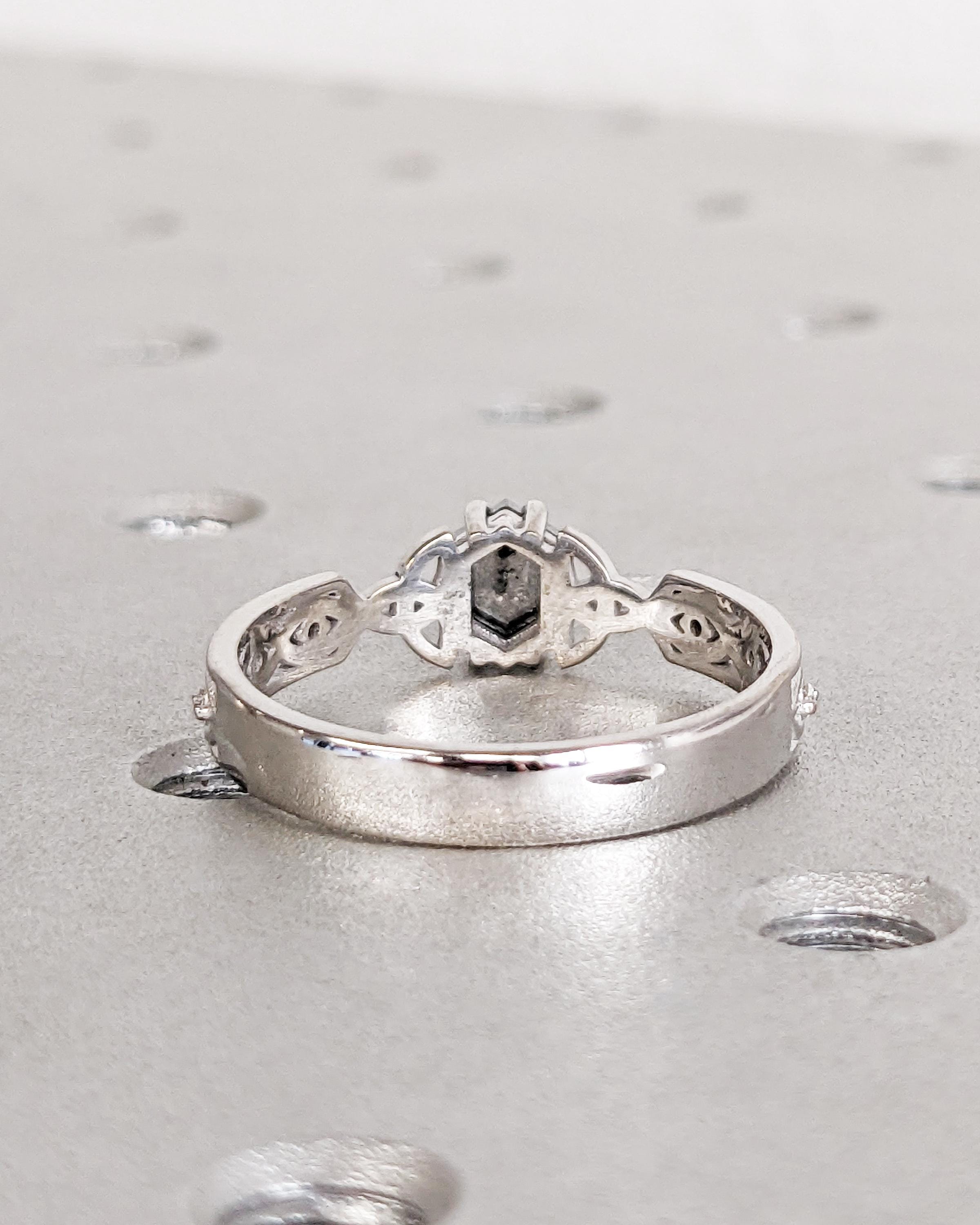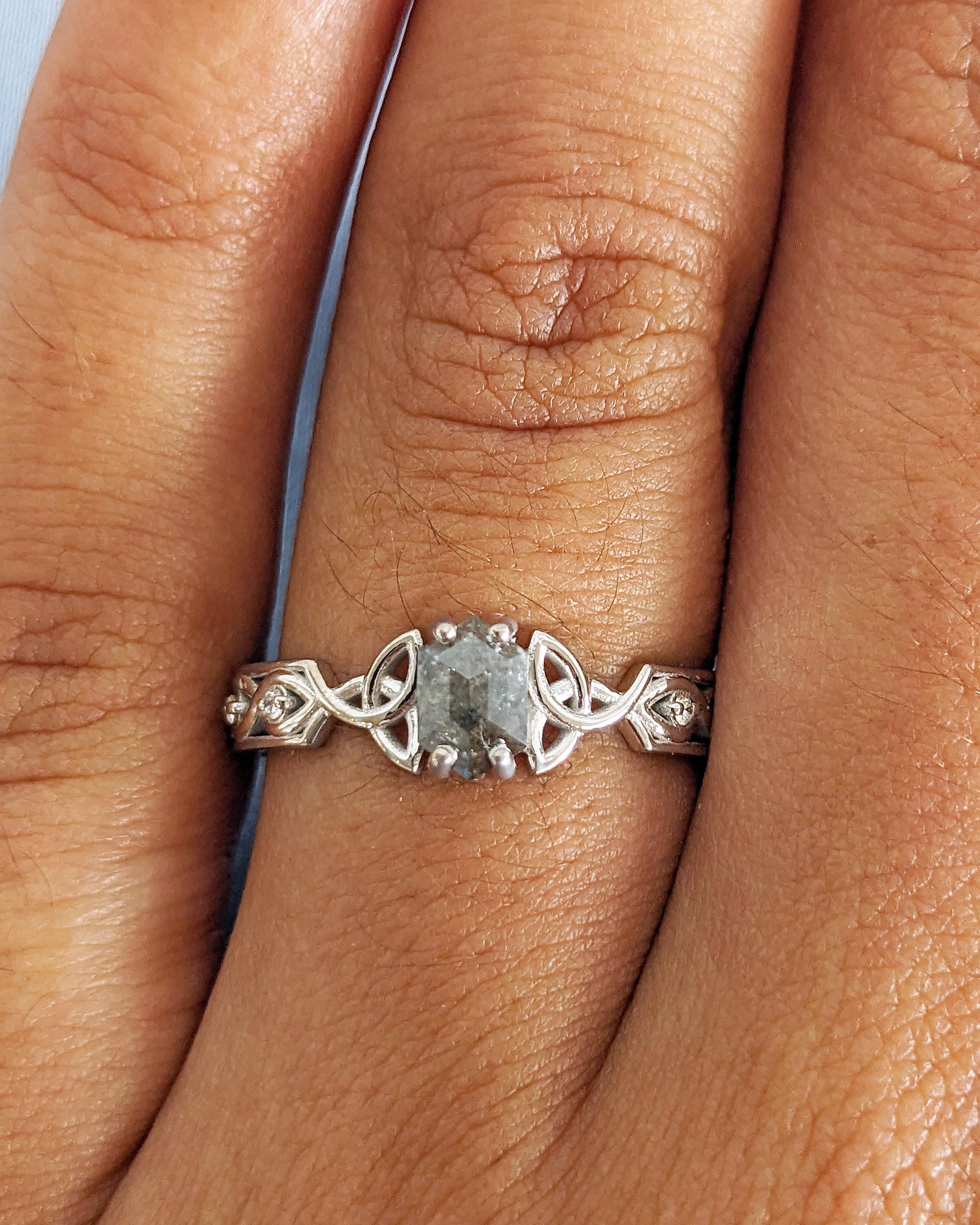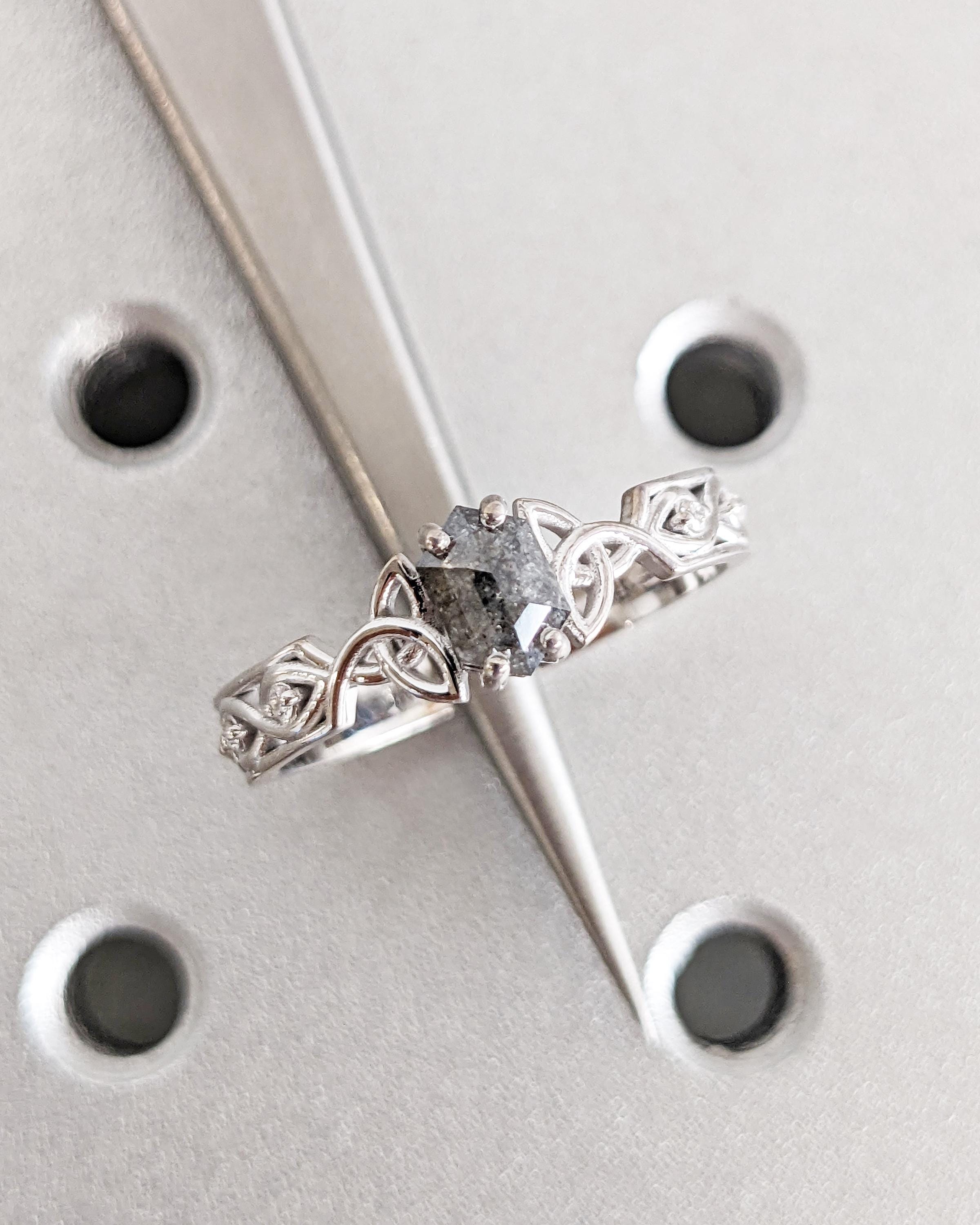 This hexagon salt and pepper diamond engagement ring is truly one-of-a-kind. The Celtic trinity knots honor love, protection, and eternity. Diamond side stones offer a bright, elegant touch. A romantic and meaningful engagement piece full of artistry, heritage, and heartfelt symbolism.