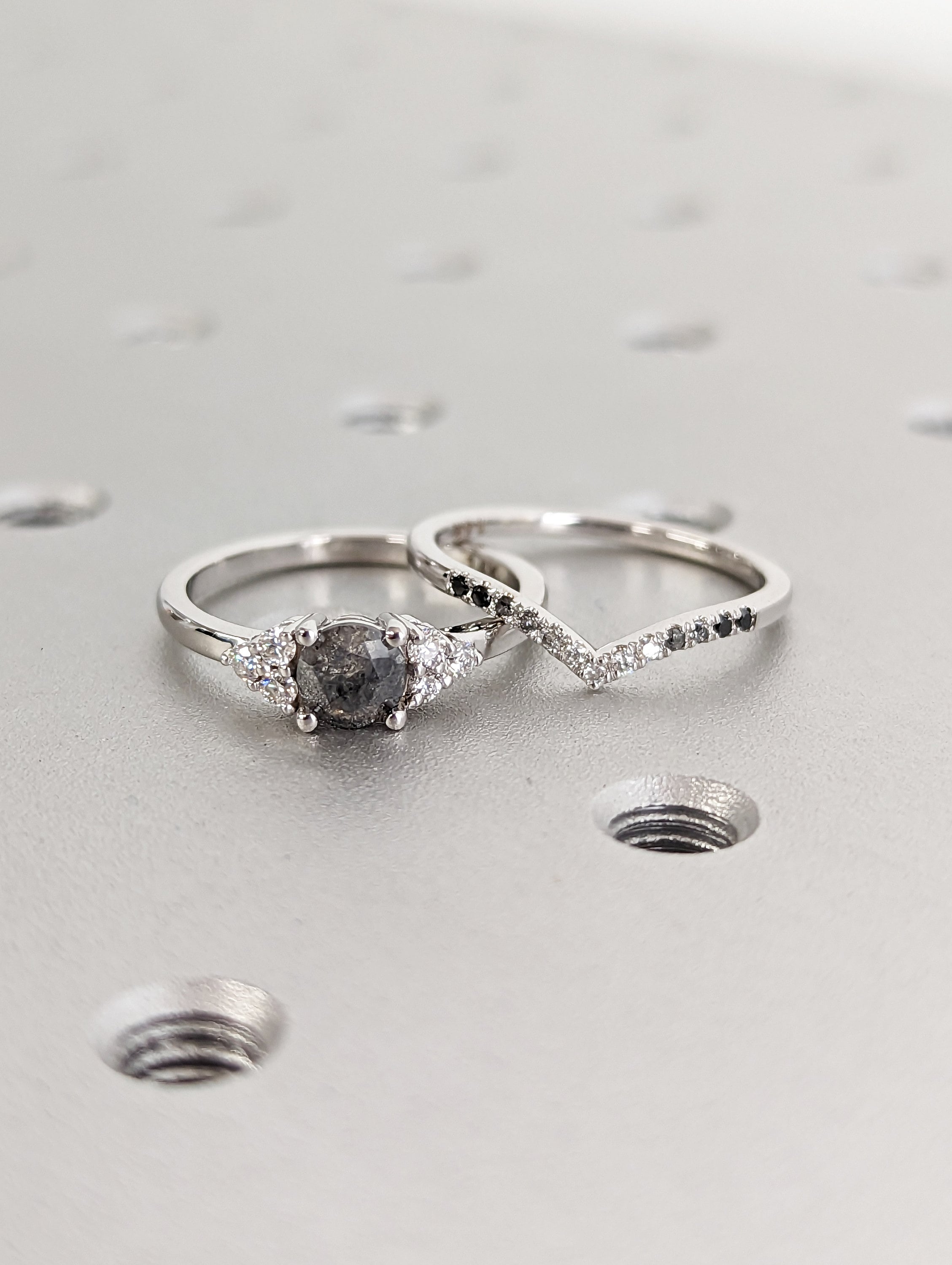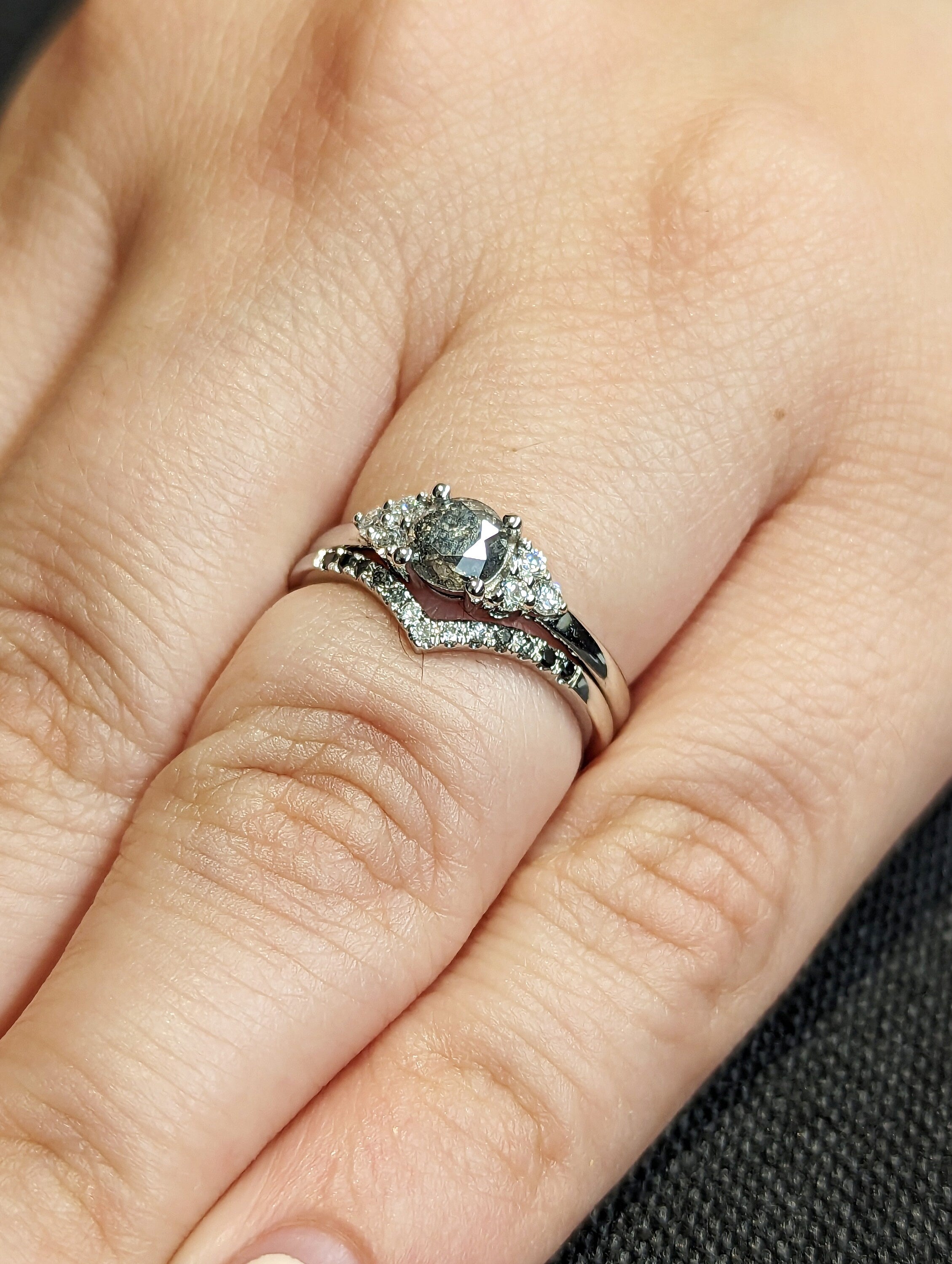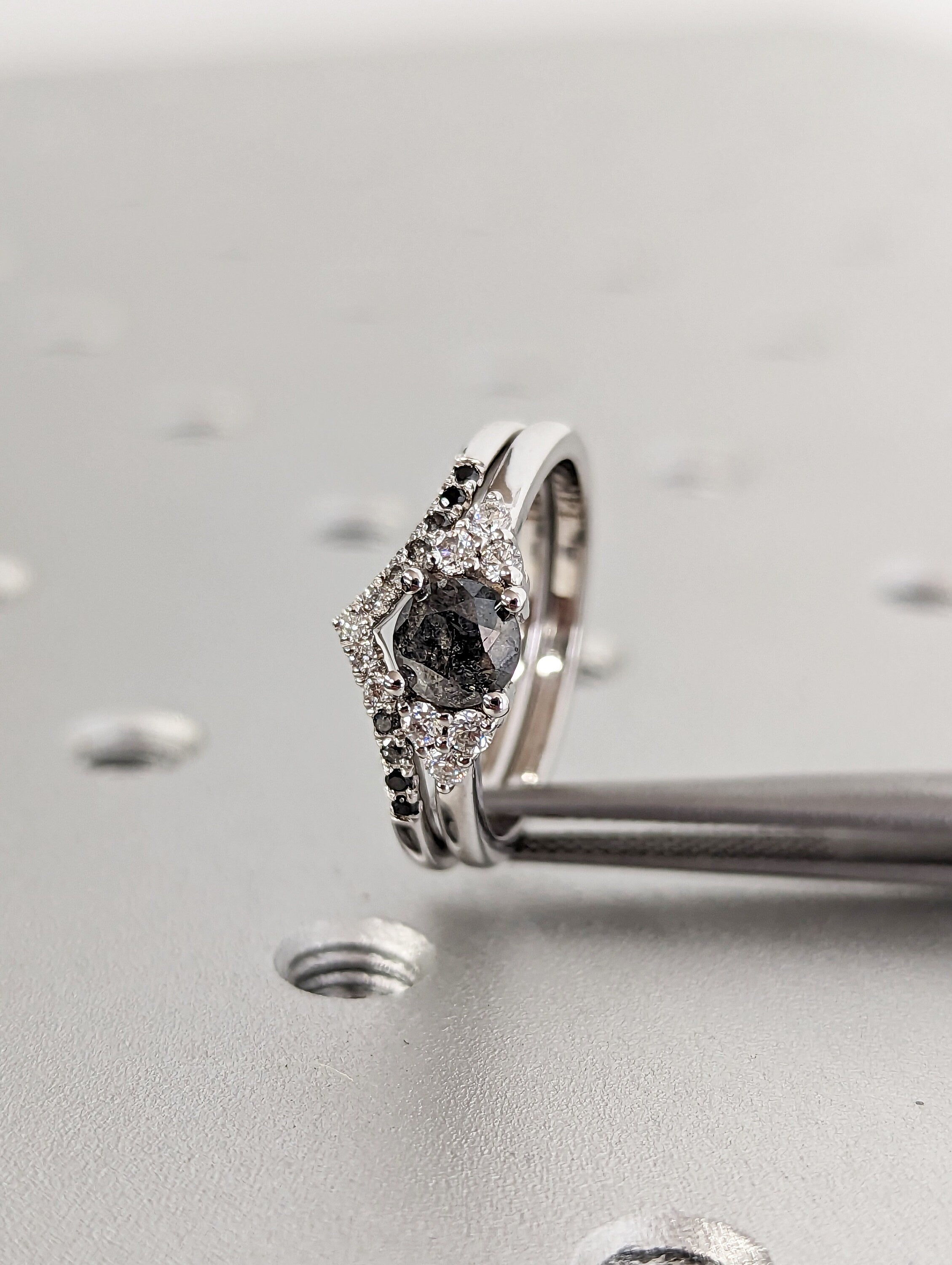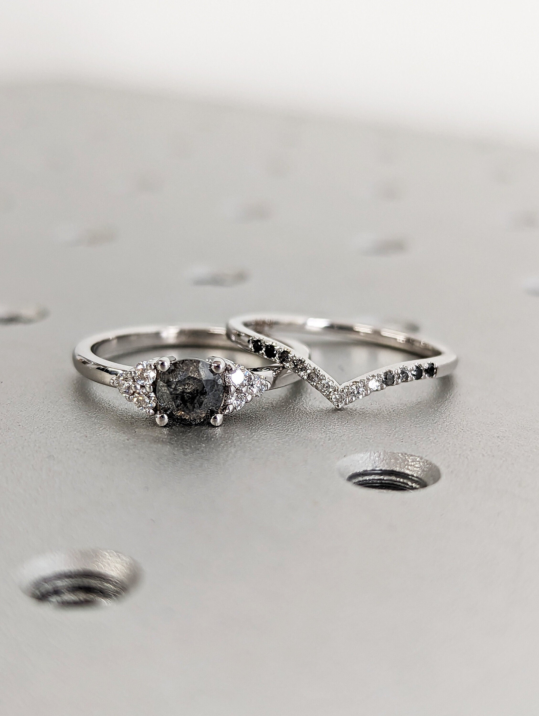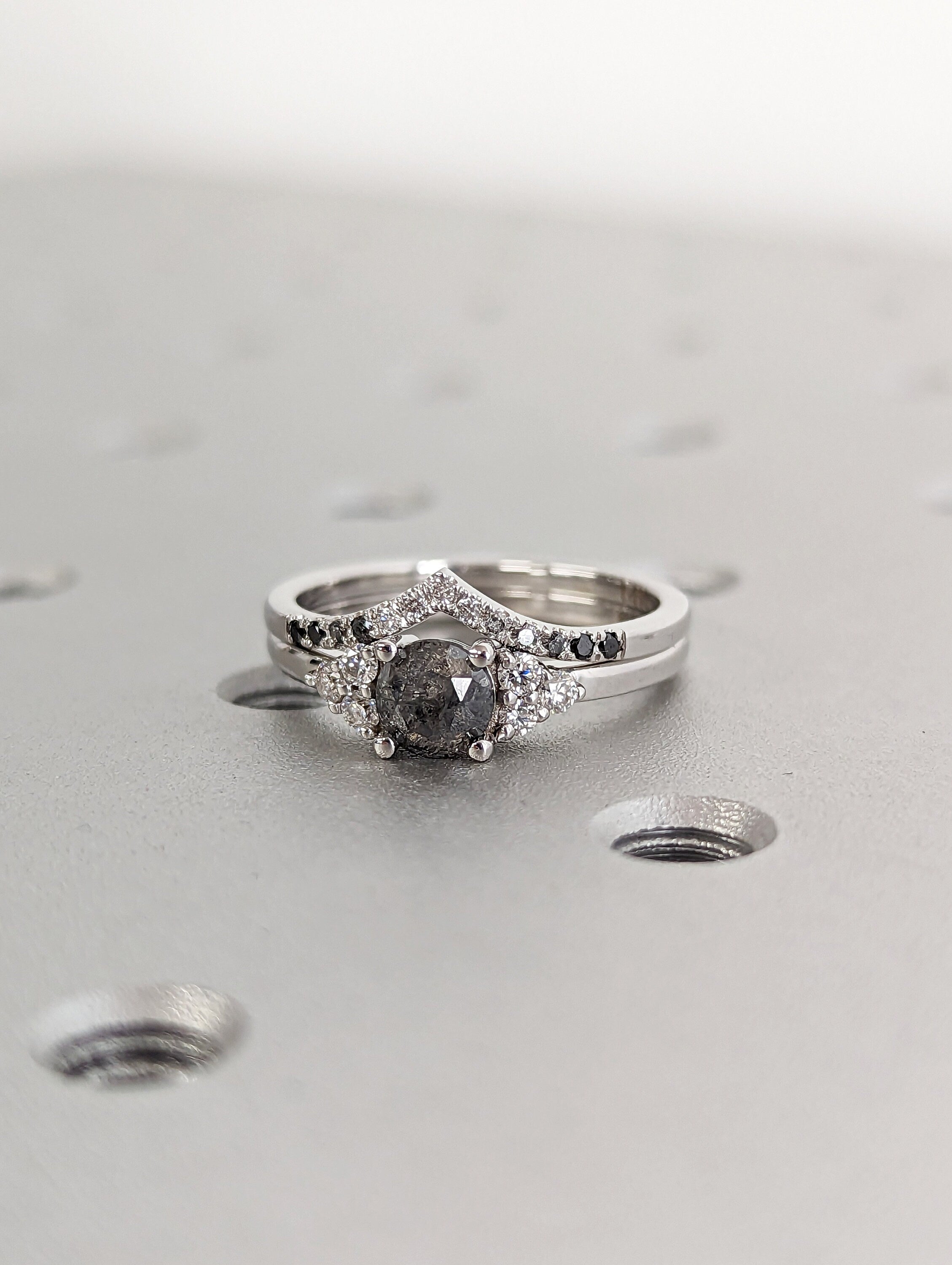 Unique Galaxy Round Cut Salt and Pepper Engagement Ring Set, Seven Stone Ring, Jewelry Gift For Women, Special Design Real Gold Ring For Her