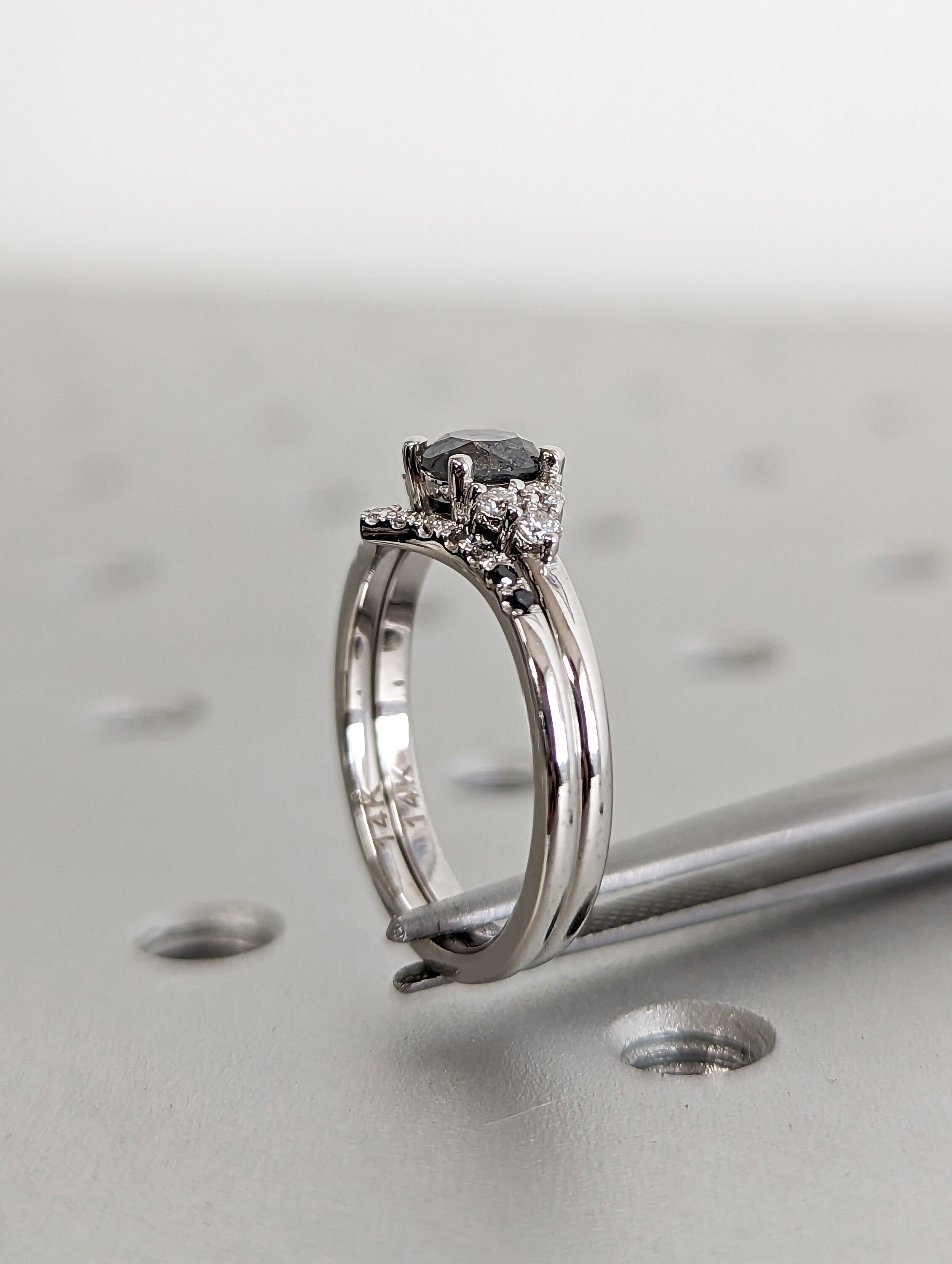 ONE-OF-A-KIND Round salt and pepper diamond, a solitaire ring that is just pure uniqueness, nothing that has ever been seen before. Can match with a unique Ombre diamond band.