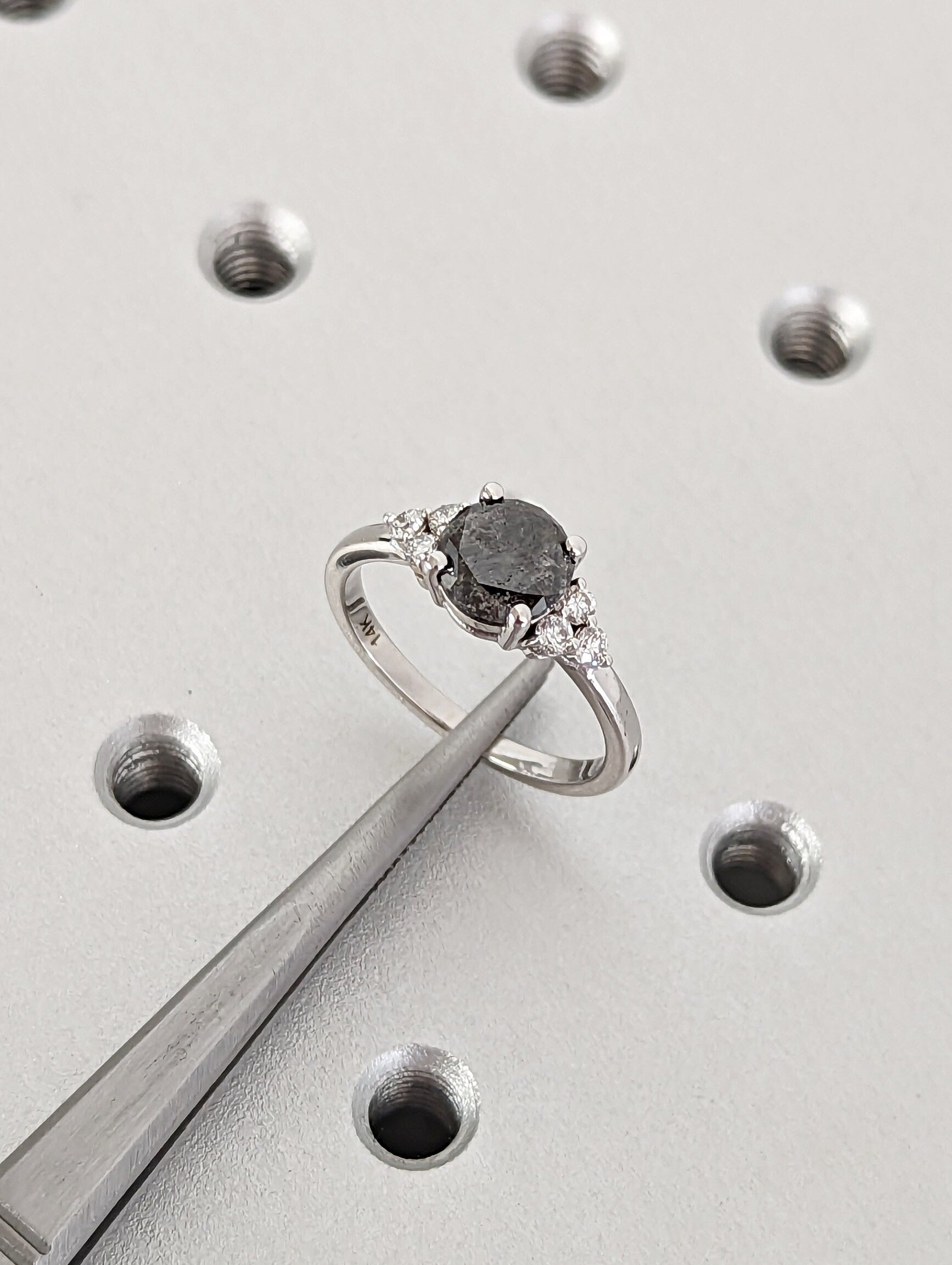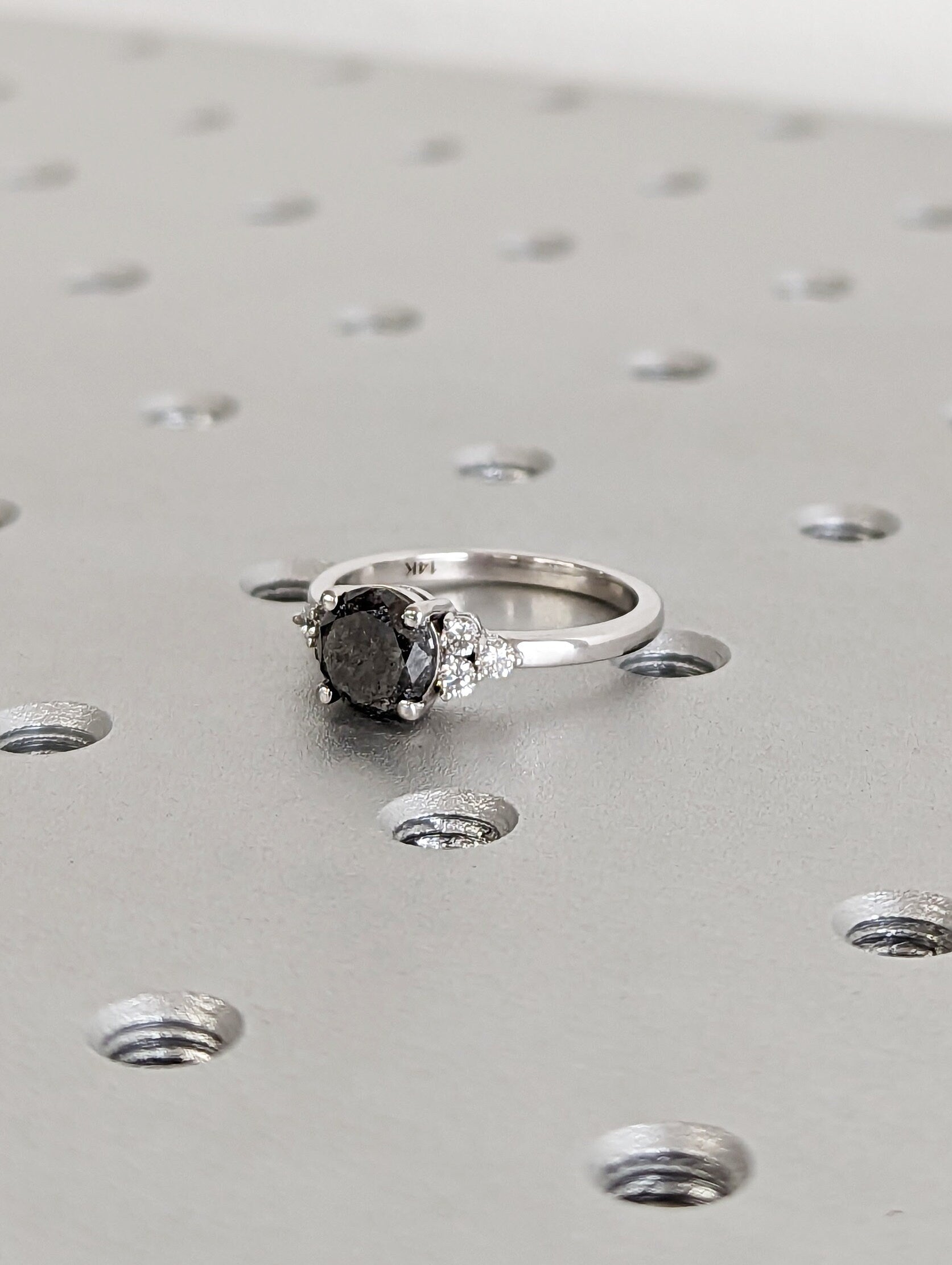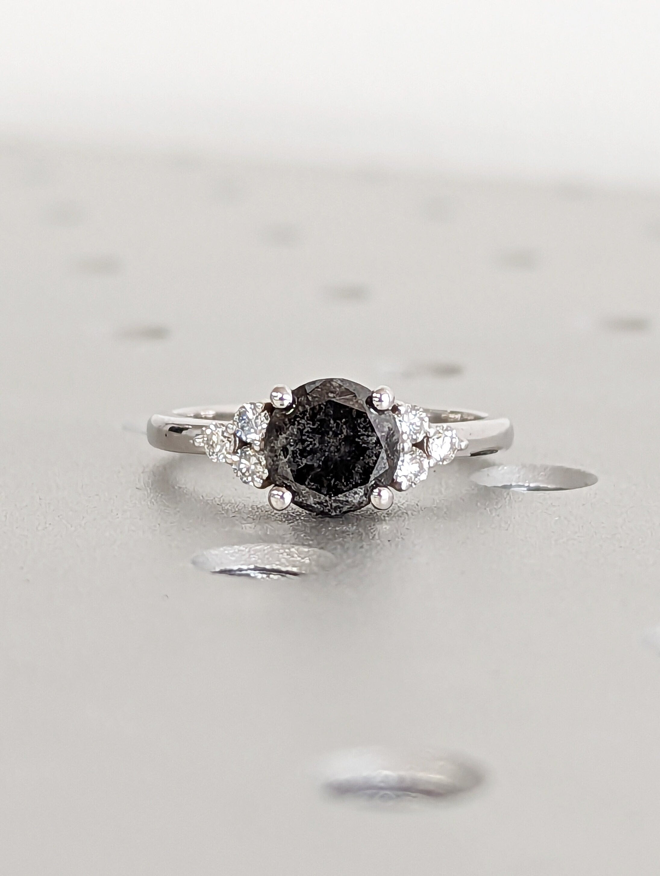 ONE-OF-A-KIND Round salt and pepper diamond, a solitaire ring that is just pure uniqueness, nothing that has ever been seen before. Can match with a unique Ombre diamond band.