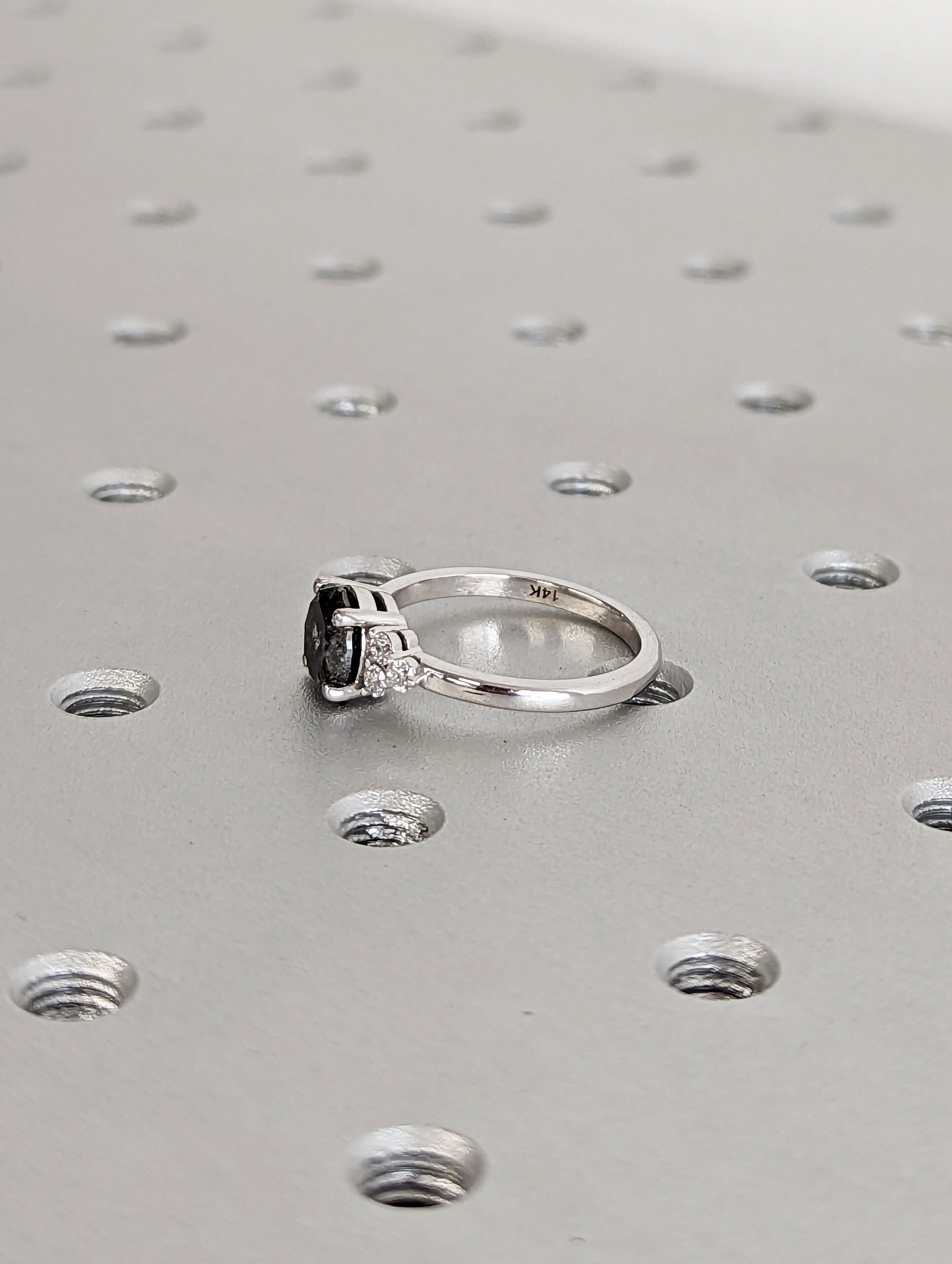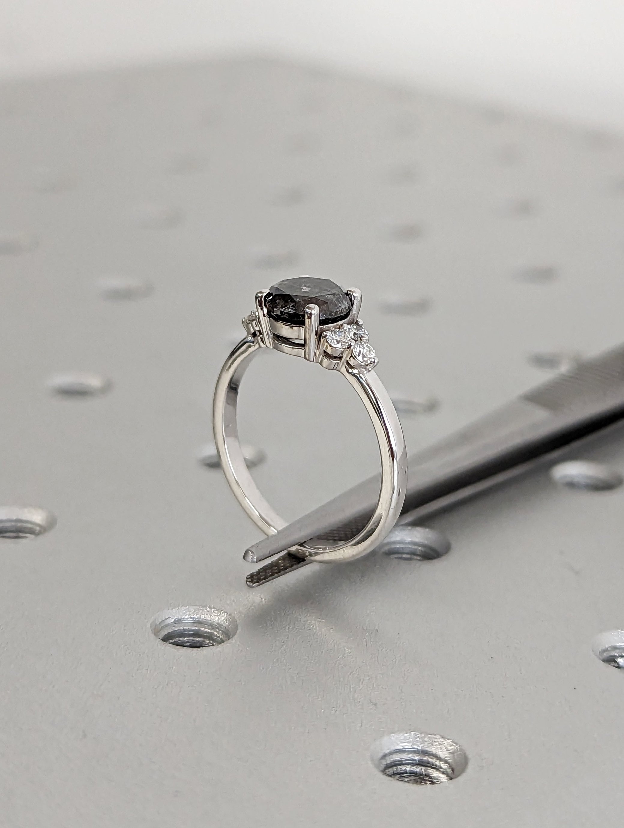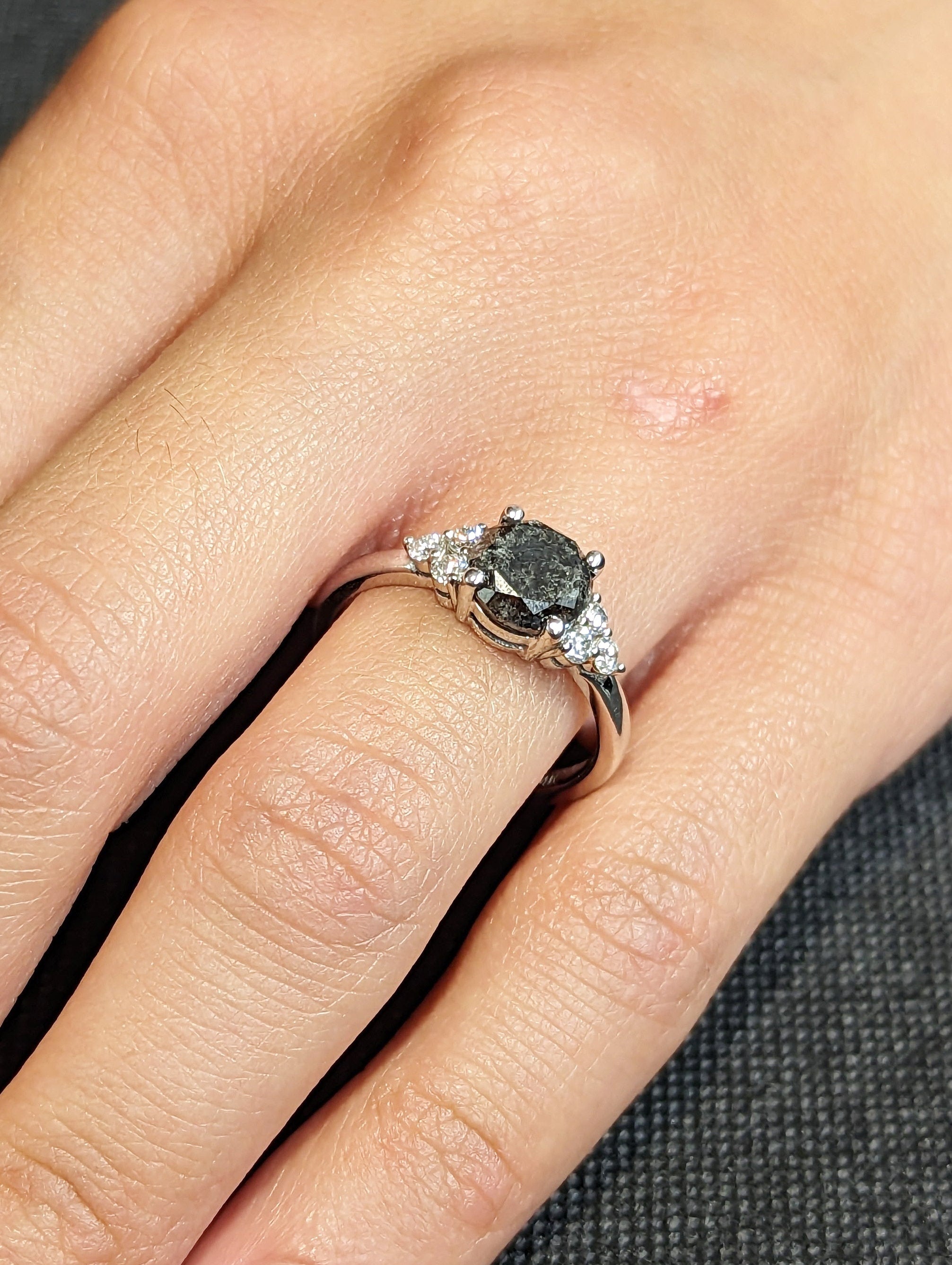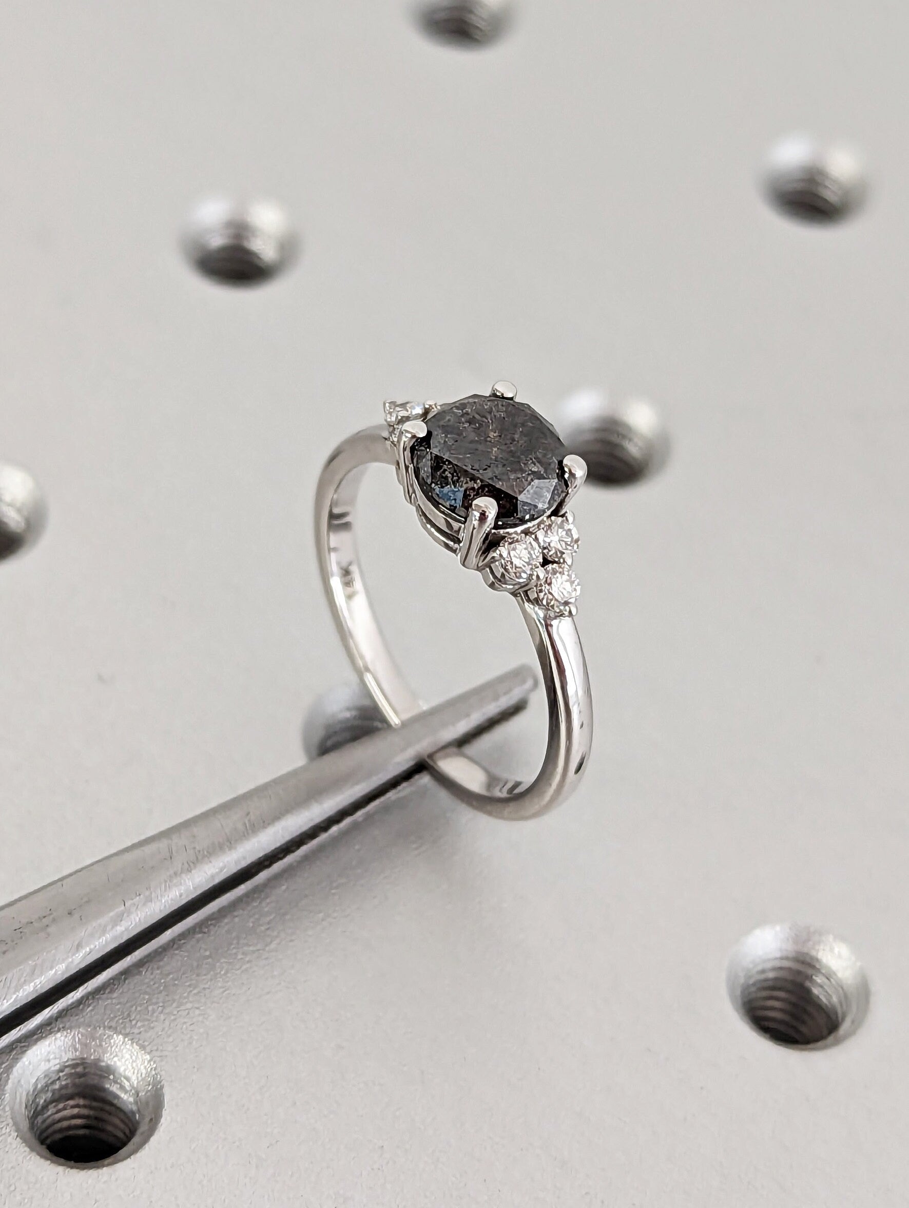 ONE-OF-A-KIND Round salt and pepper diamond, a solitaire ring that is just pure uniqueness, nothing that has ever been seen before. Can match with a unique Ombre diamond band.