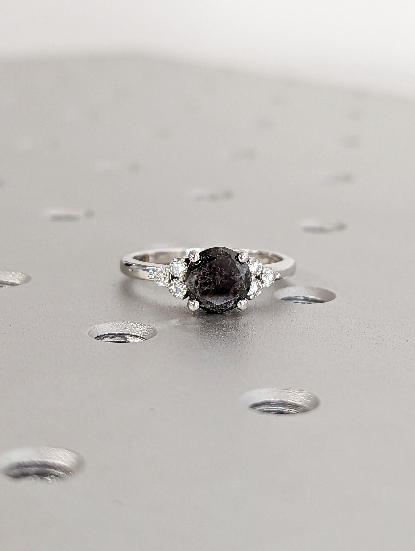 Unique Galaxy Round Cut Salt and Pepper Engagement Ring Set, Seven Stone Ring, Jewelry Gift For Women, Special Design Real Gold Ring For Her