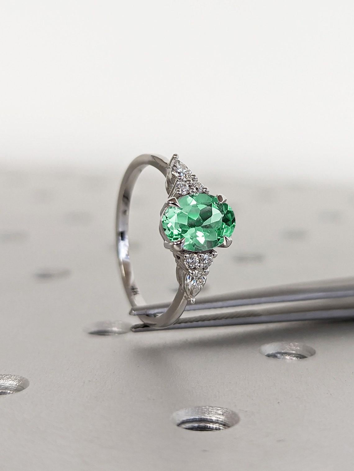 Unique Green Lab Sapphire Ring | Solid White Gold Sapphire and Diamond Promise Ring | 14k Gold Rings for Women | Oval cut Engagement Ring
