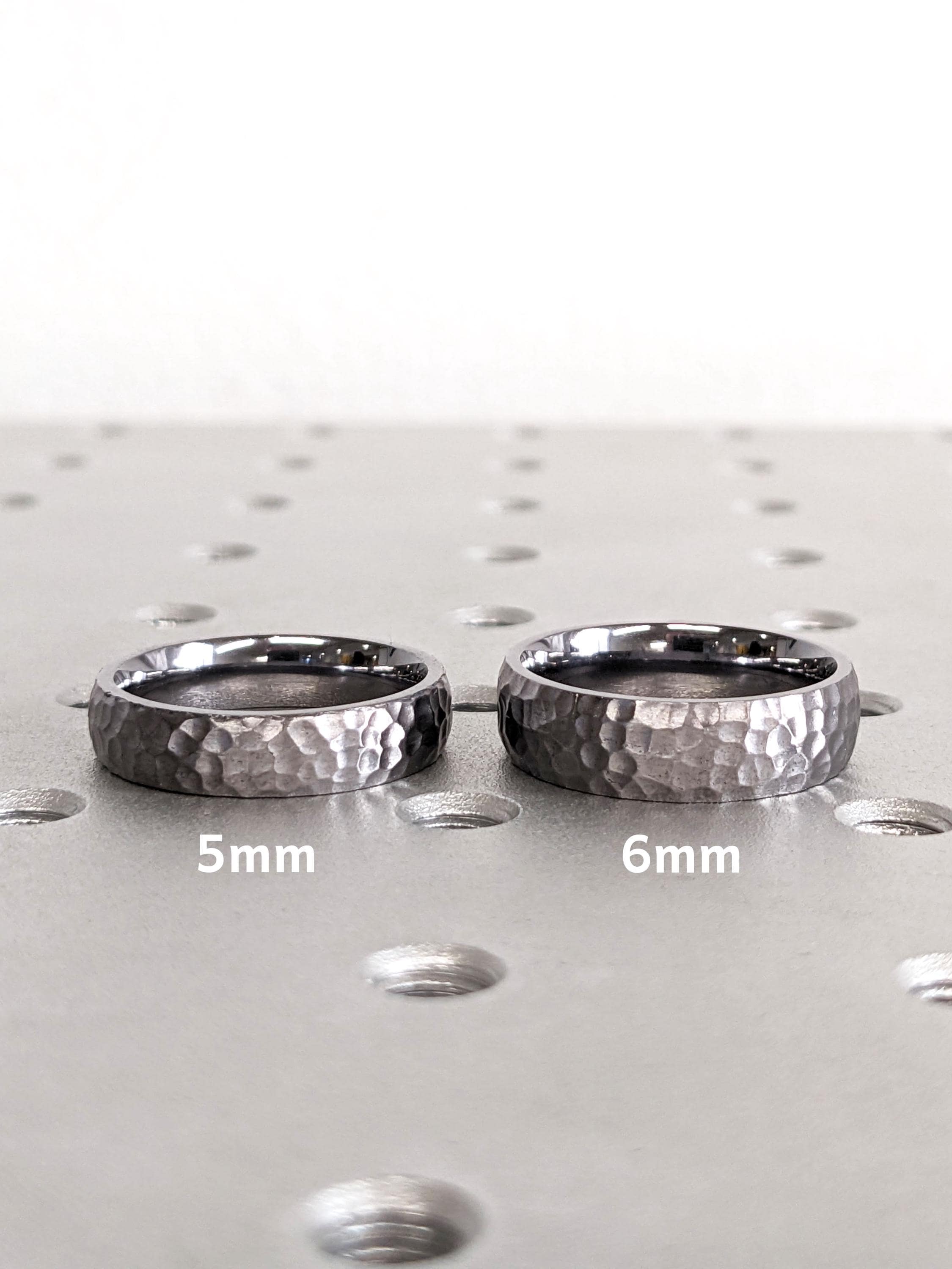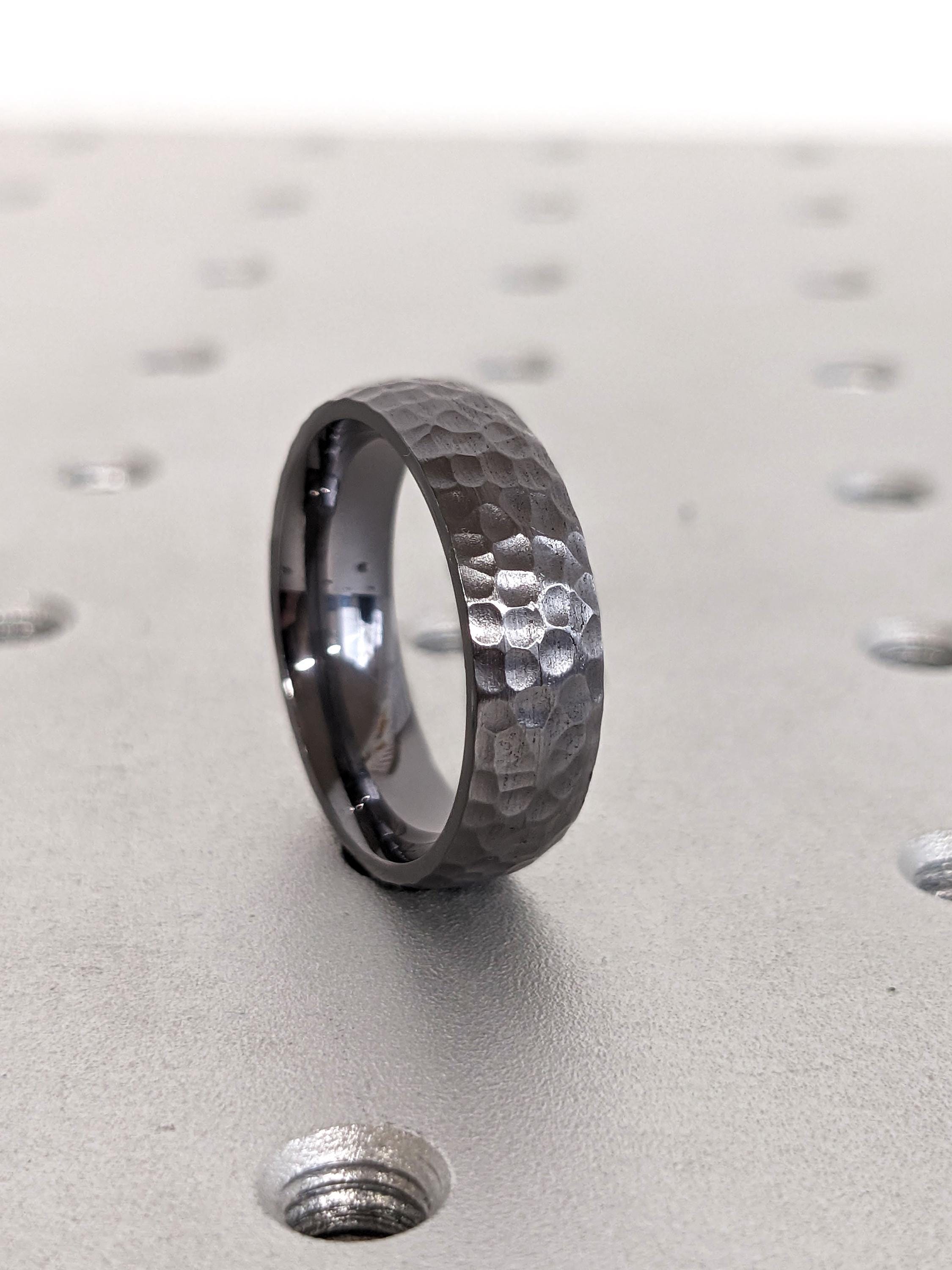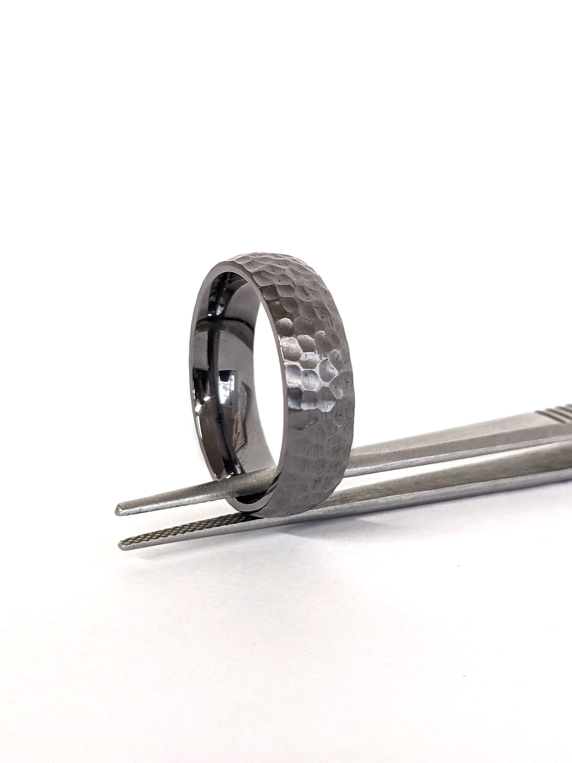 An alternative metal, 6mm width ring for him, with hand hammered faceted surface. With a sophisticated dark grey hue, this ring is hypoallergenic and comes with comfort fit suitable for everyday wear.