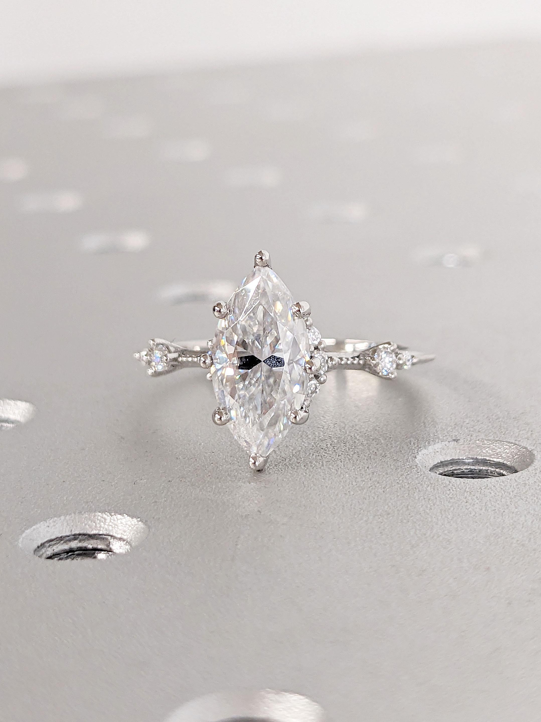 Celebrate your unique love story with our marquise cut Lab Diamond ring, where each side of the main stone is accented by a delicate cluster of man made diamonds. This beautiful ring exudes timeless elegance, making it the perfect choice to commemorate your special bond and create cherished memories together.