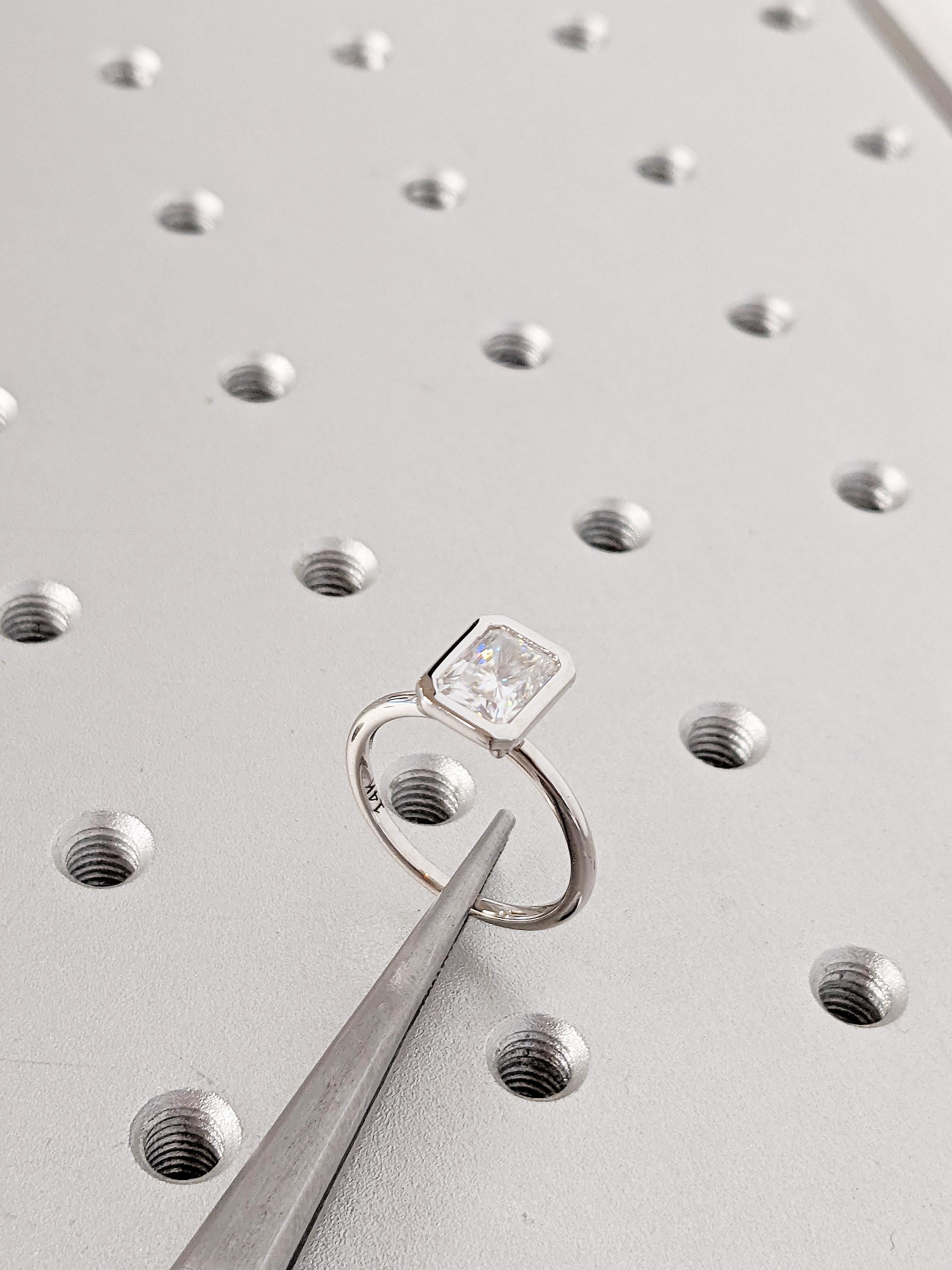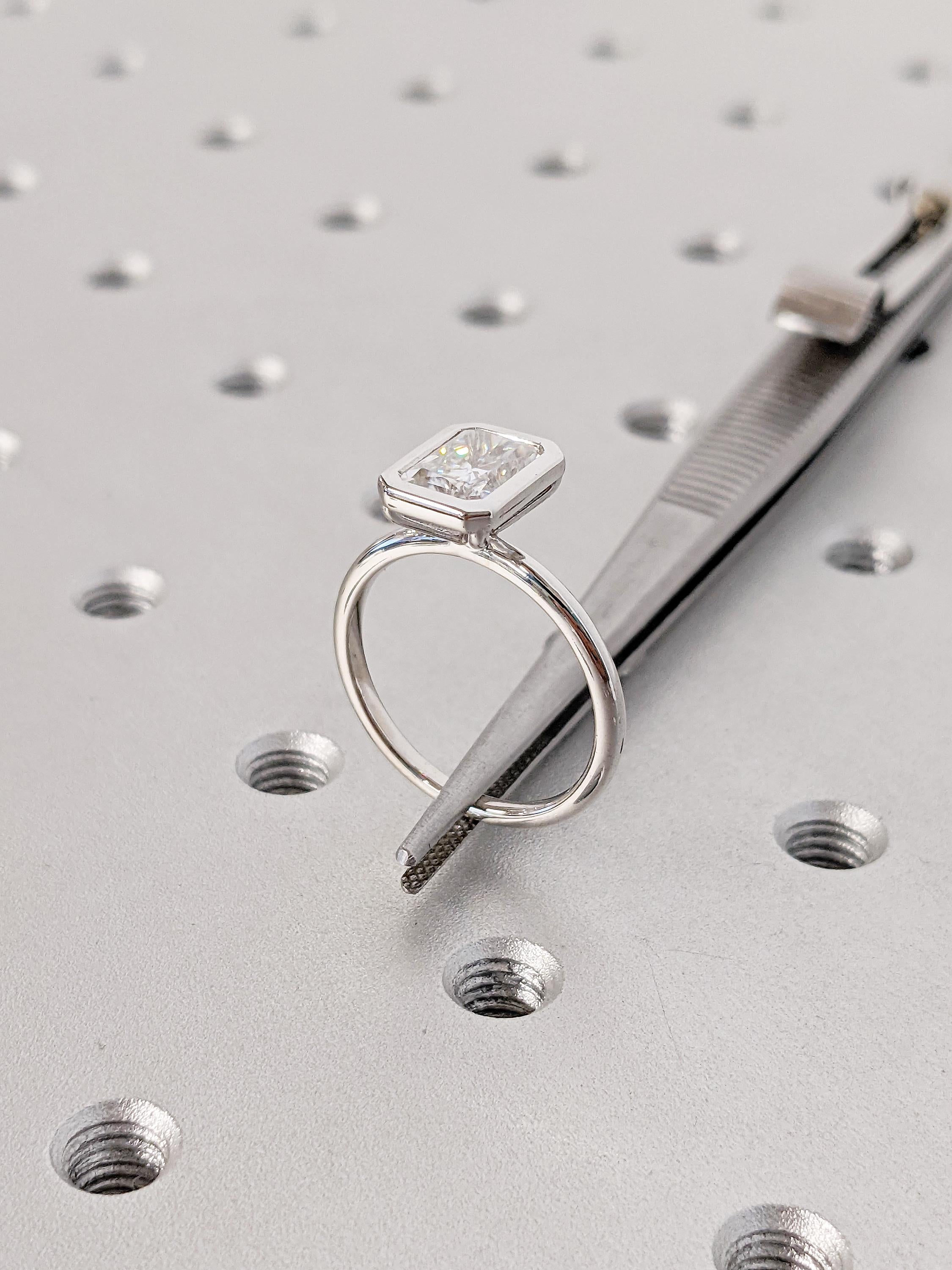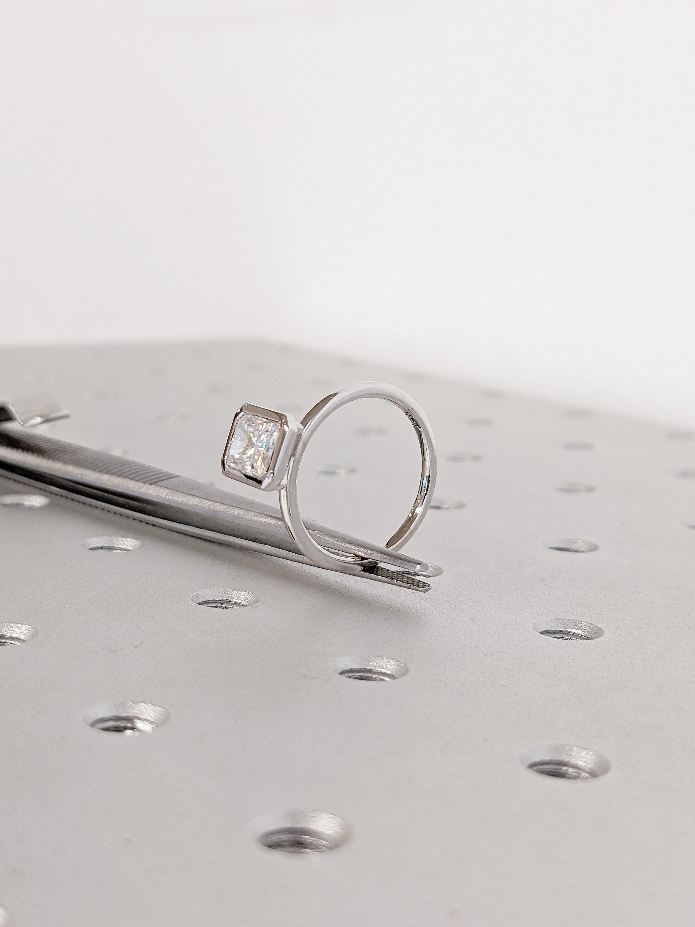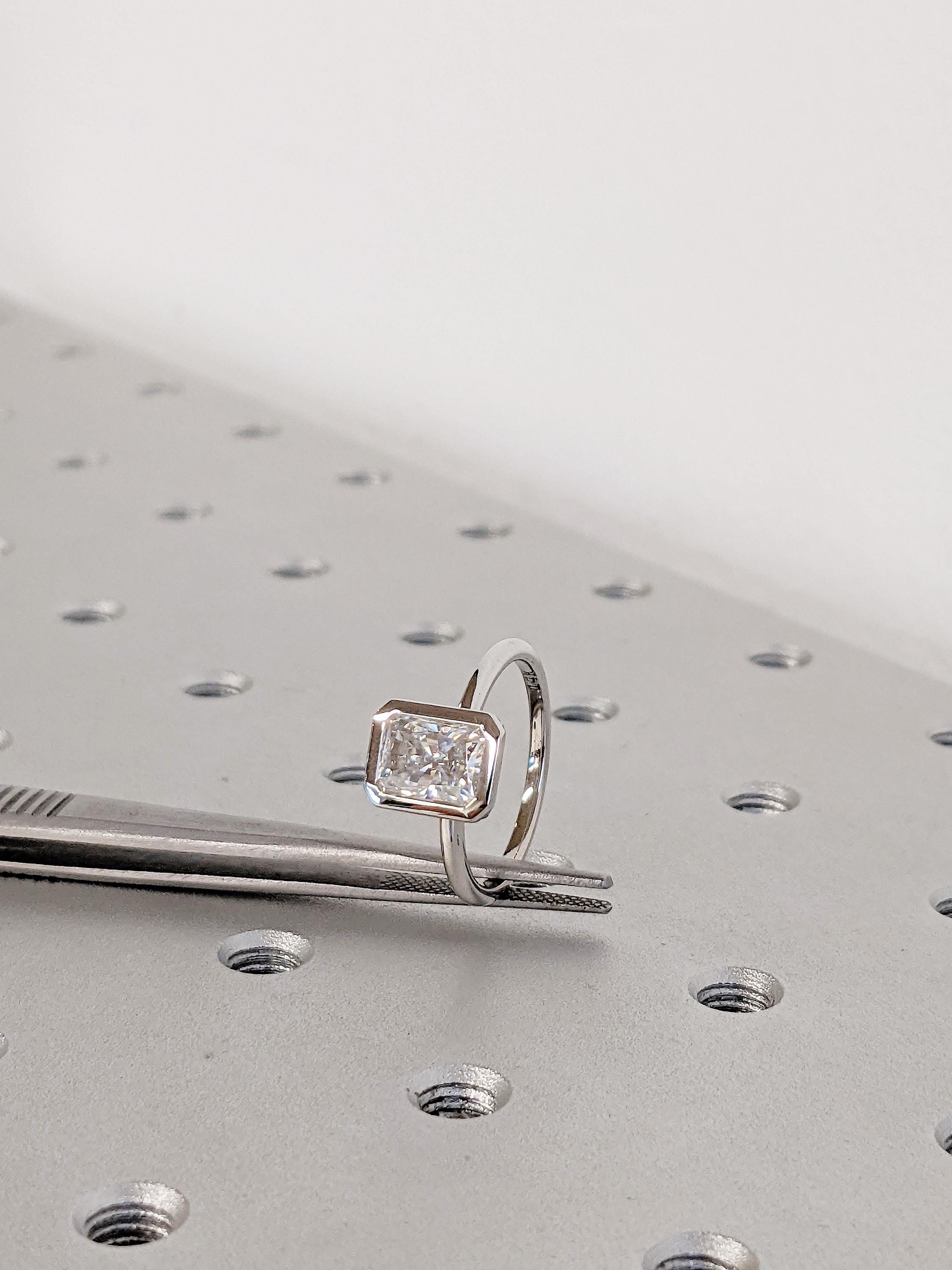 This Lab Grown Diamond engagement ring with radiant cut center stone in a sleek bezel setting creates a refined and modern look. The clean lines highlight the brilliance of the Diamond, offering elegance with durability. This timeless ring is a perfect choice for engagements, weddings, bridal jewelry, anniversaries, or as a sophisticated piece for everyday wear.