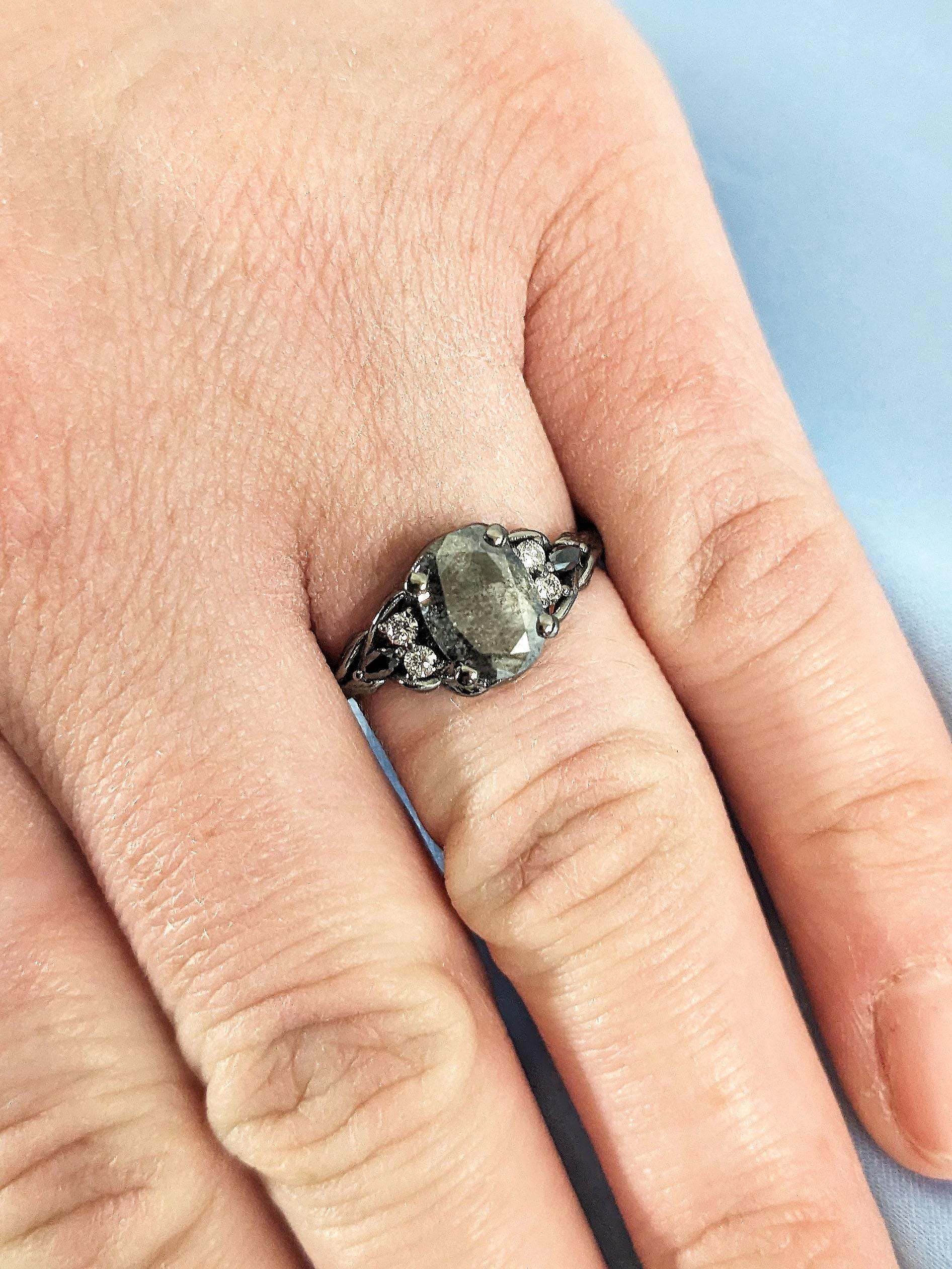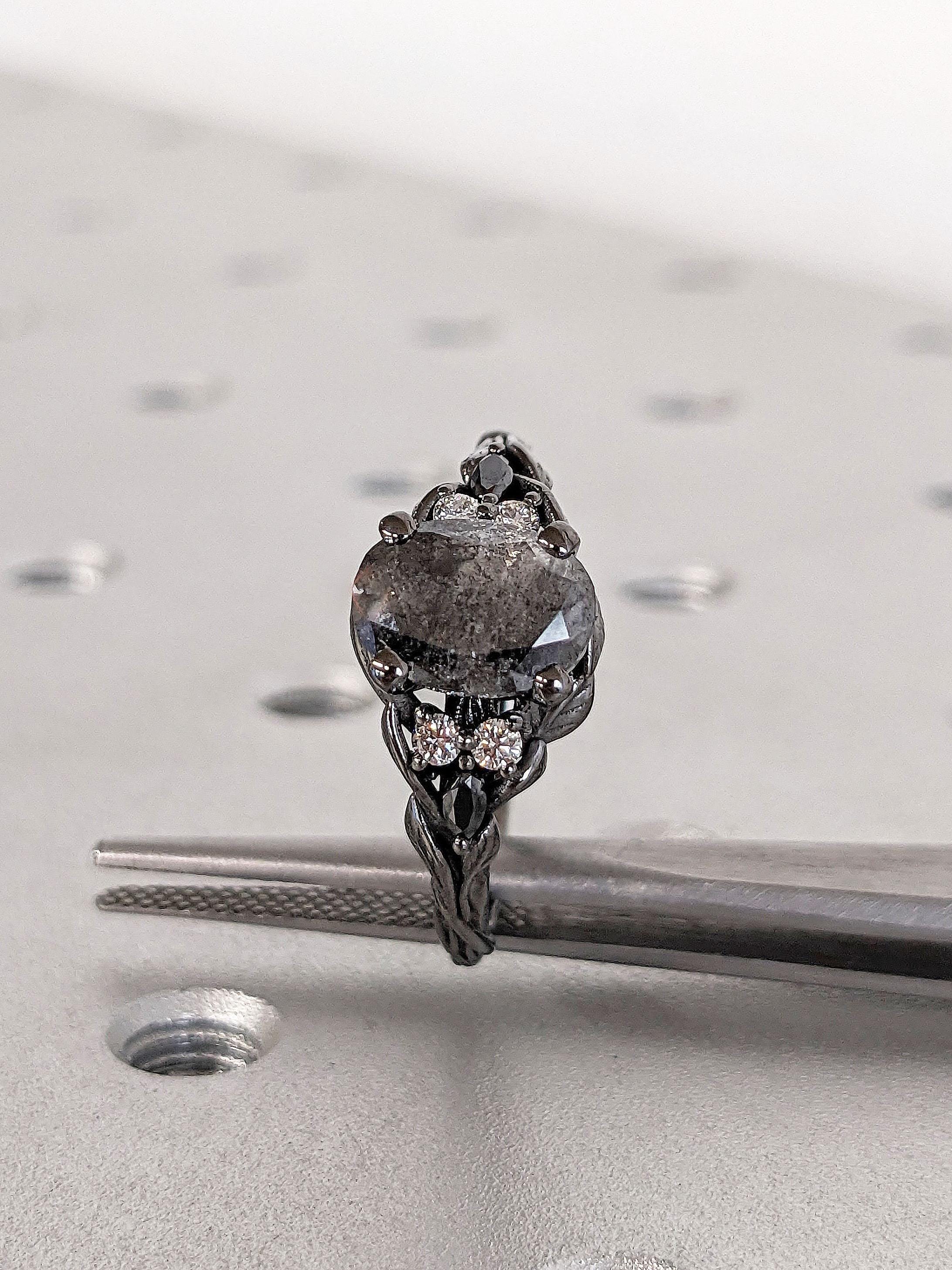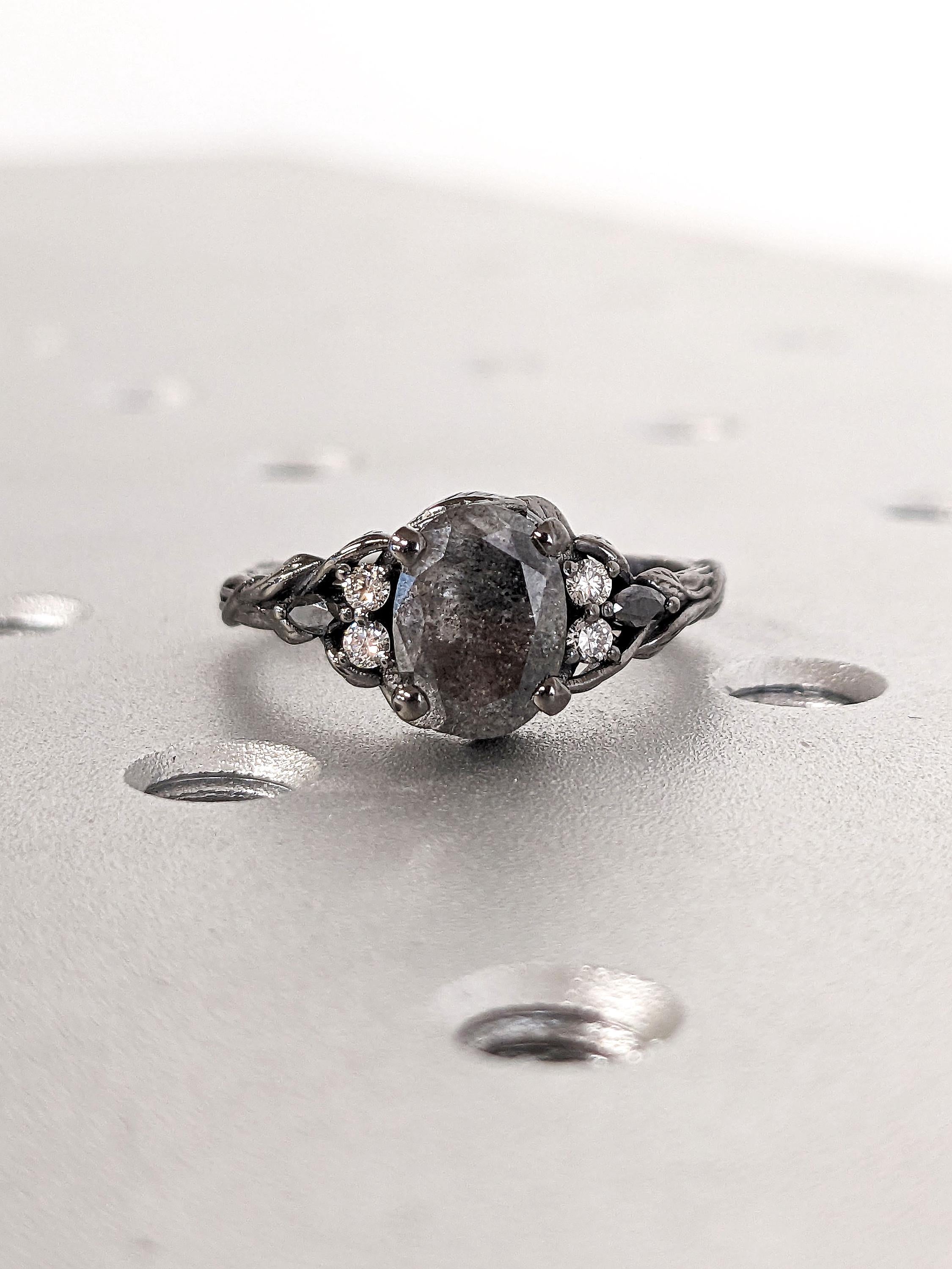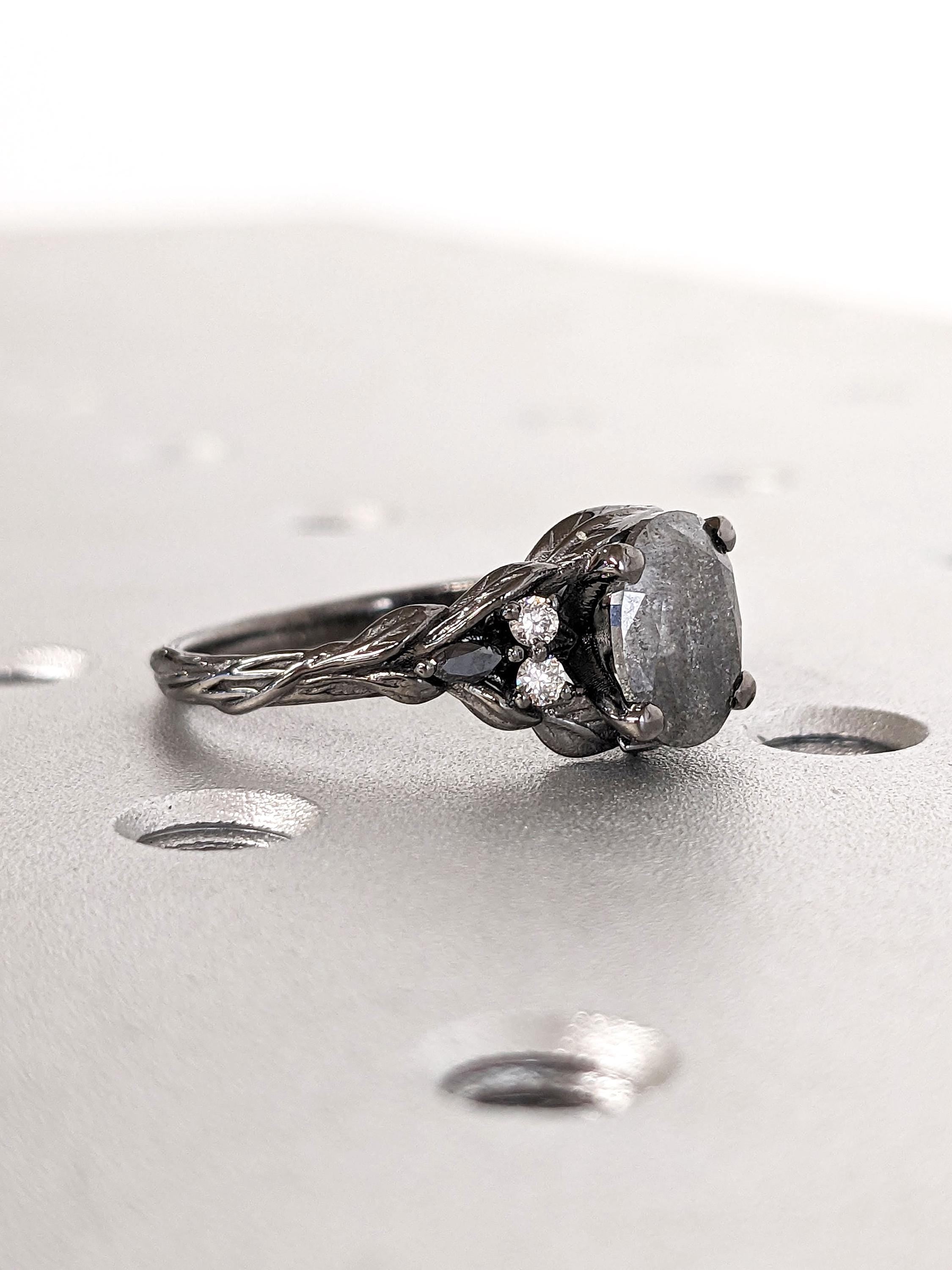 A rustic handmade ring features an oval cut Salt and Pepper Diamond focal stone, accented by round cut white gemstones and marquise cut black diamond side stones. With twig and branches engraved band and graceful leaves embracing the seven gemstones, this nature inspired jewelry is the perfect timeless gift for any occasion.