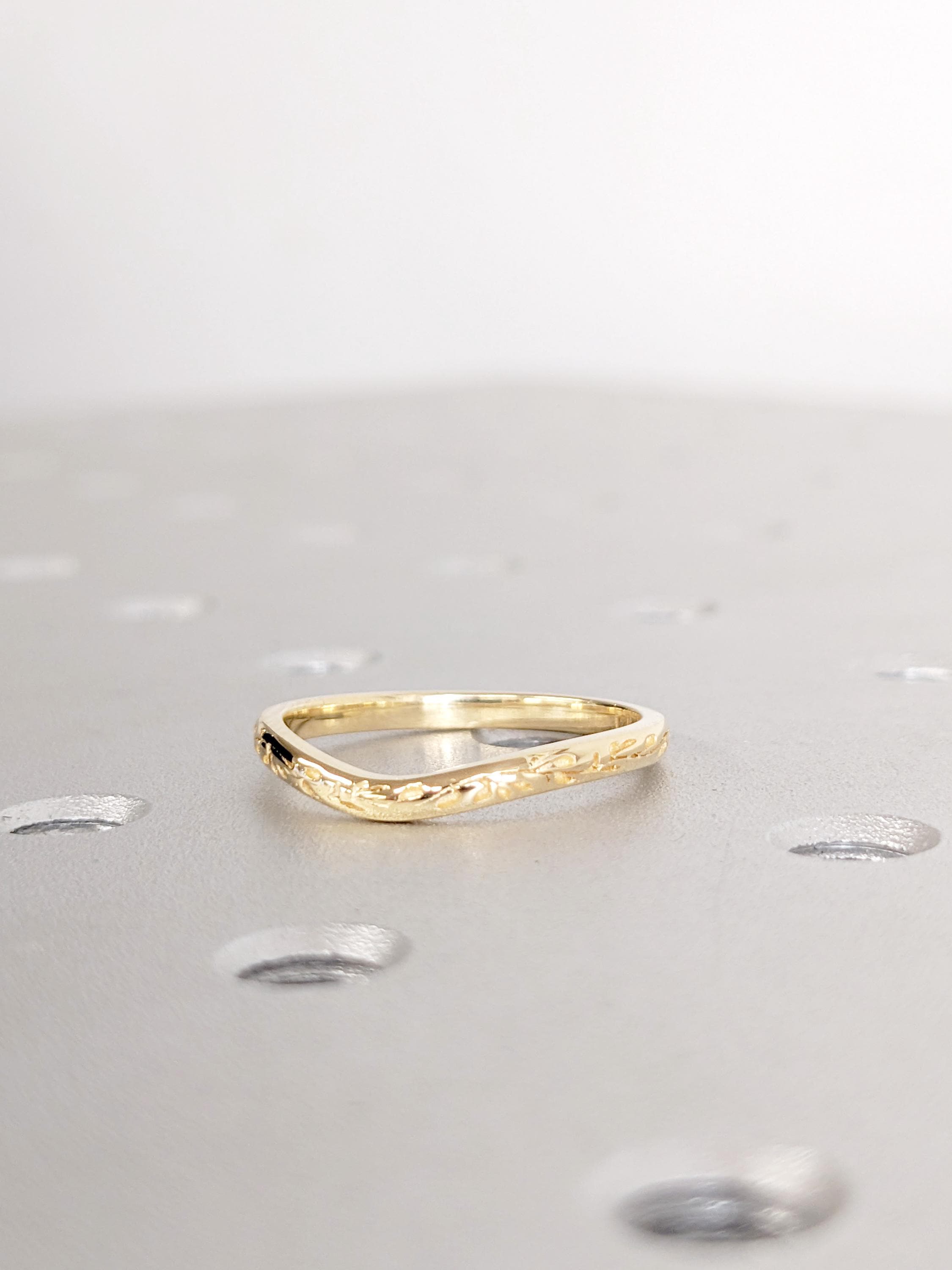 This Curved Wedding Band for Women has a graceful leaf motif design that symbolizes love, growth, and harmony. The gentle curve makes it a perfect stackable ring to pair with engagement rings or wear alone. A beautiful wedding band, promise ring, or anniversary gift for her; elegant, meaningful, and timeless.