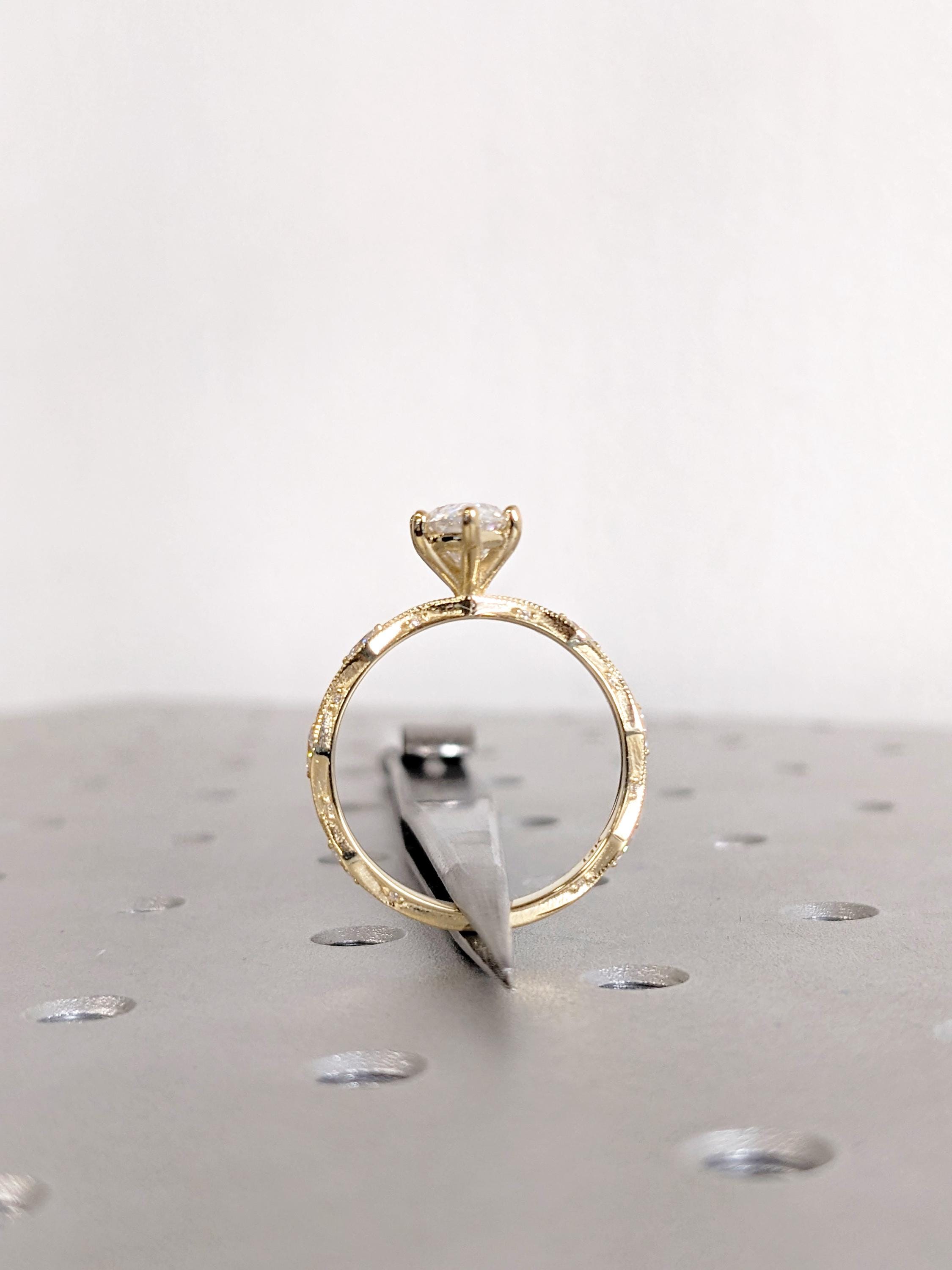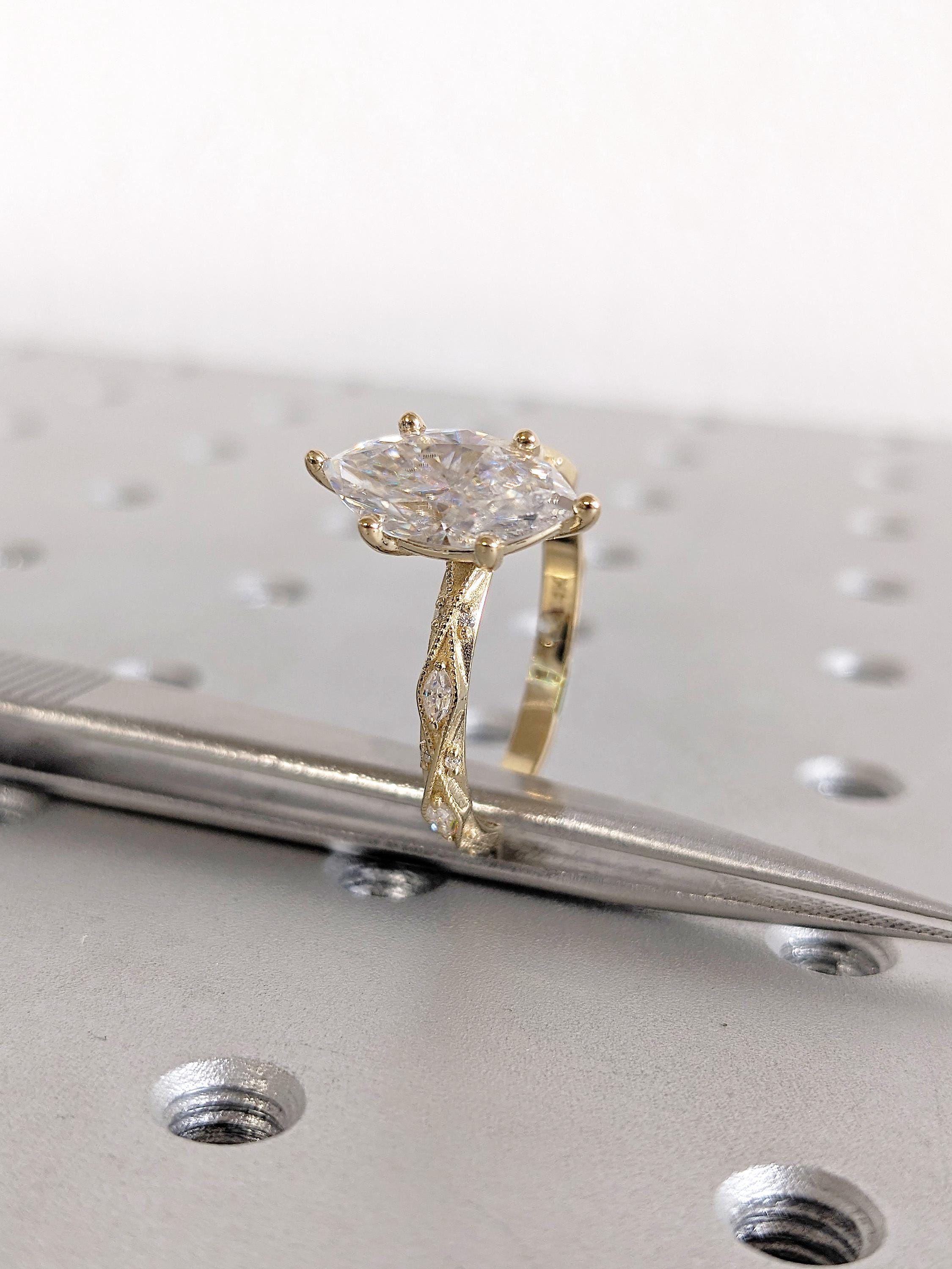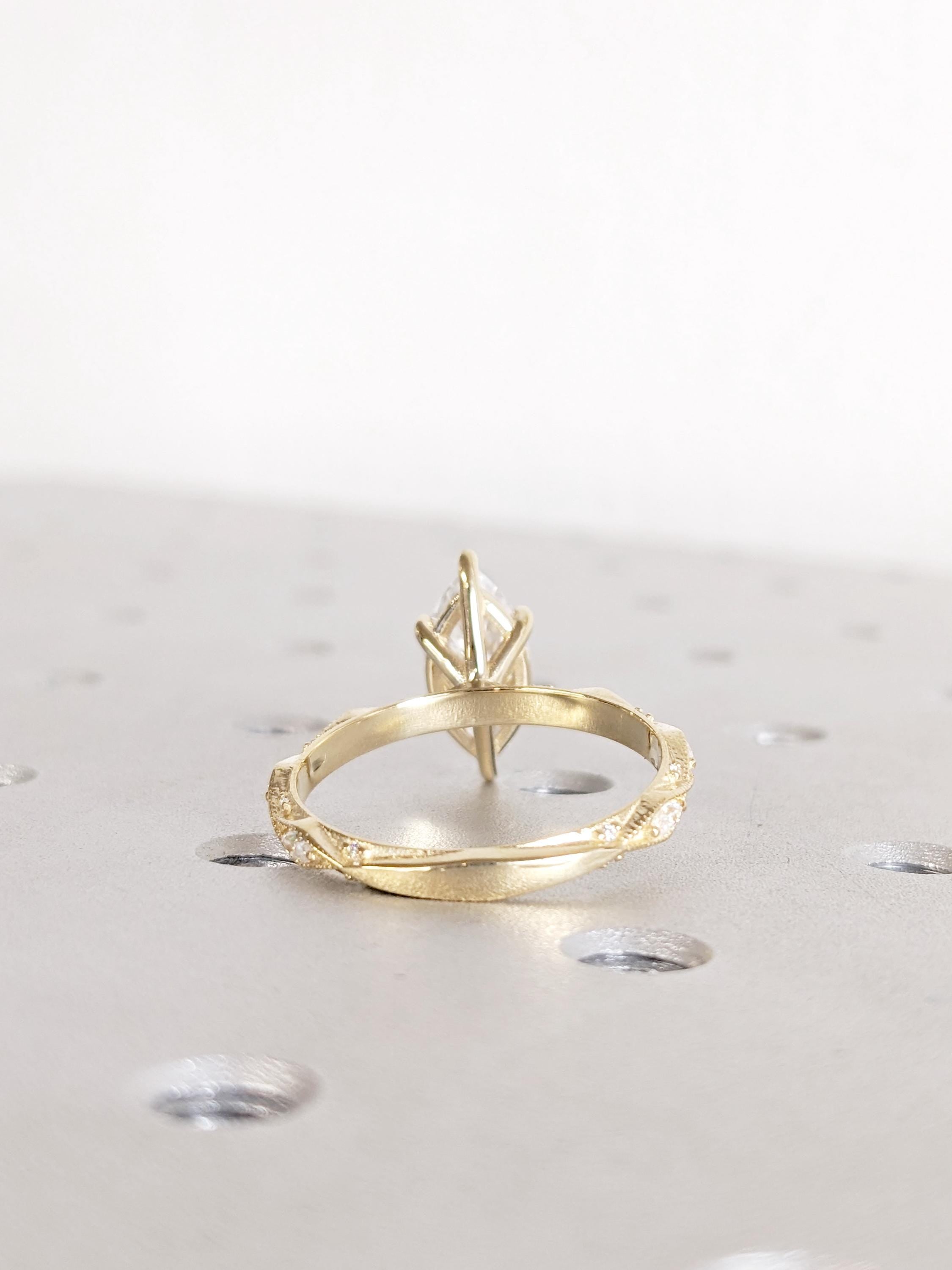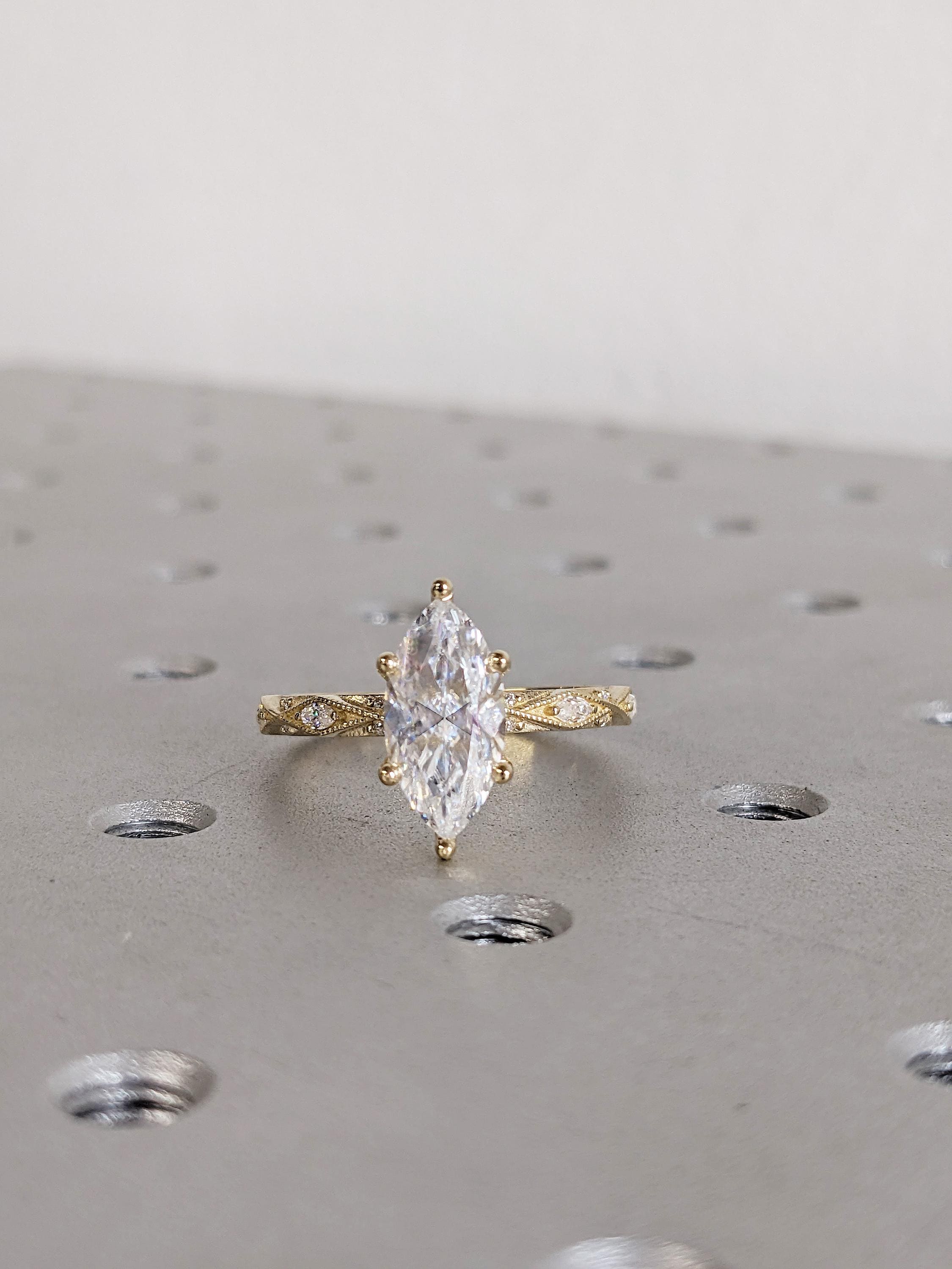 Unique Moissanite Engagement Ring, 14K Solid Yellow Gold Art Deco Marquise Ring, Milgrain Ring For Women, Wedding Ring For Her, Fine Jewelry