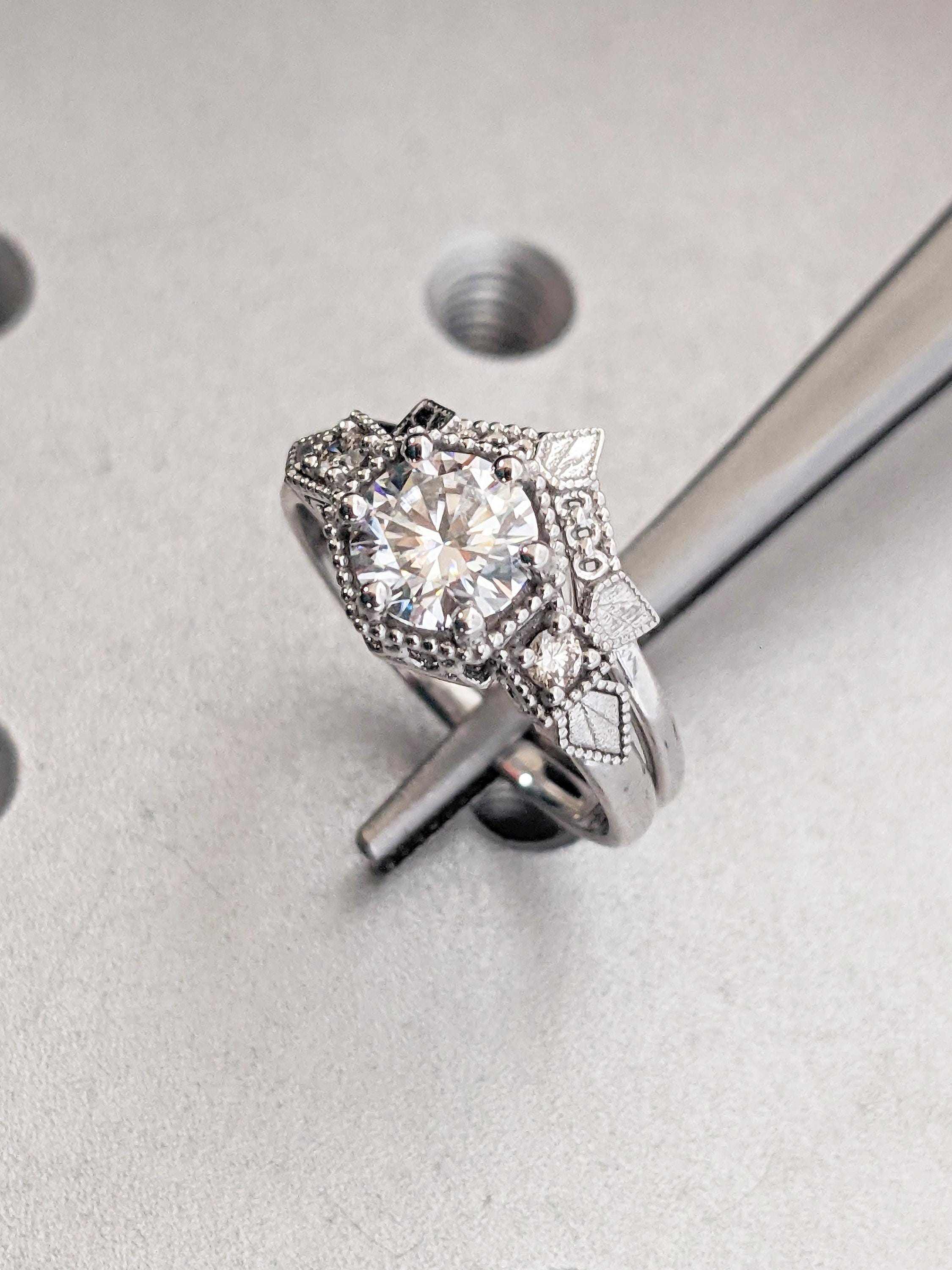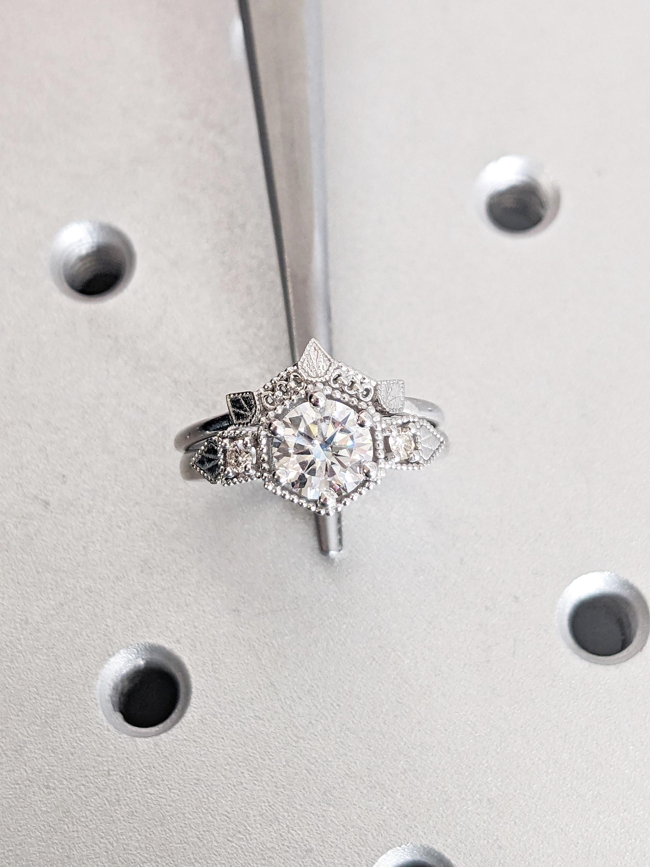 Celebrate the start of your forever with our stunning engagement ring, featuring a radiant Moissanite centerpiece set in an elegant hexagonal design. The delicate milgrain detailing lends a vintage charm, while sparkling Moissanite side stones enhance its brilliance. Complete the look with a matching v-shaped stacking ring as part of a bridal set. Its intricate milgrain detailing and unique leaf-inspired design create a timeless and sophisticated piece of jewelry.