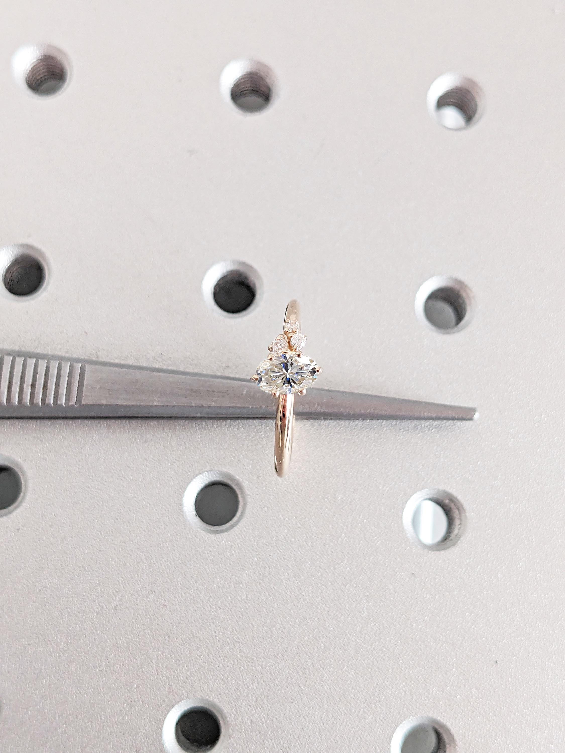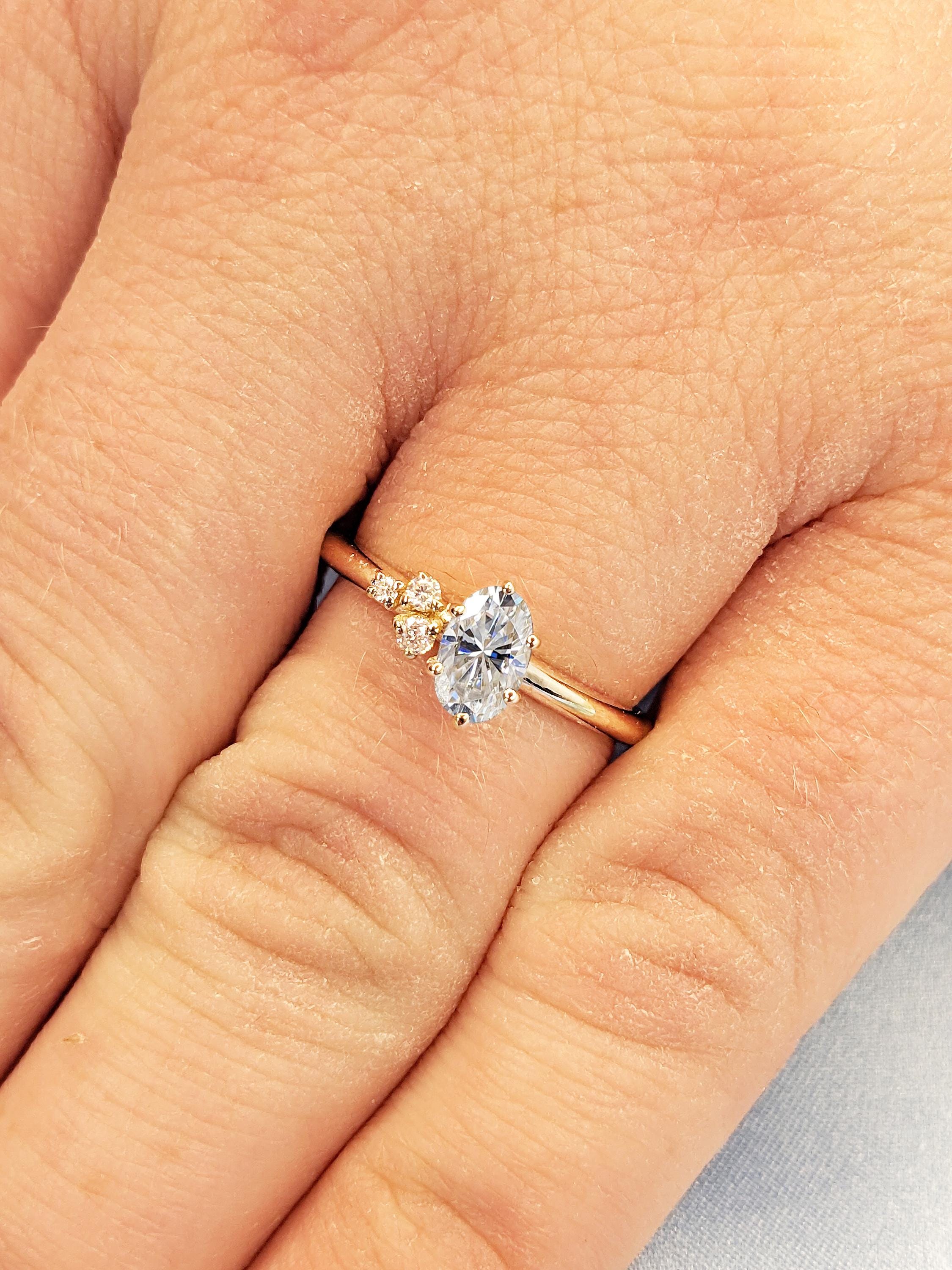 Elegant and enchanting, this ring features an oval cut Moissanite in a delicate six-prong setting. The center stone is complemented by a unique cluster of Natural Diamonds, Lab-Grown Diamonds, or Moissanite of your choice, gracefully adorning one side of the band. This exquisite piece is a timeless statement of beauty and a perfect blend of sophistication and individuality.