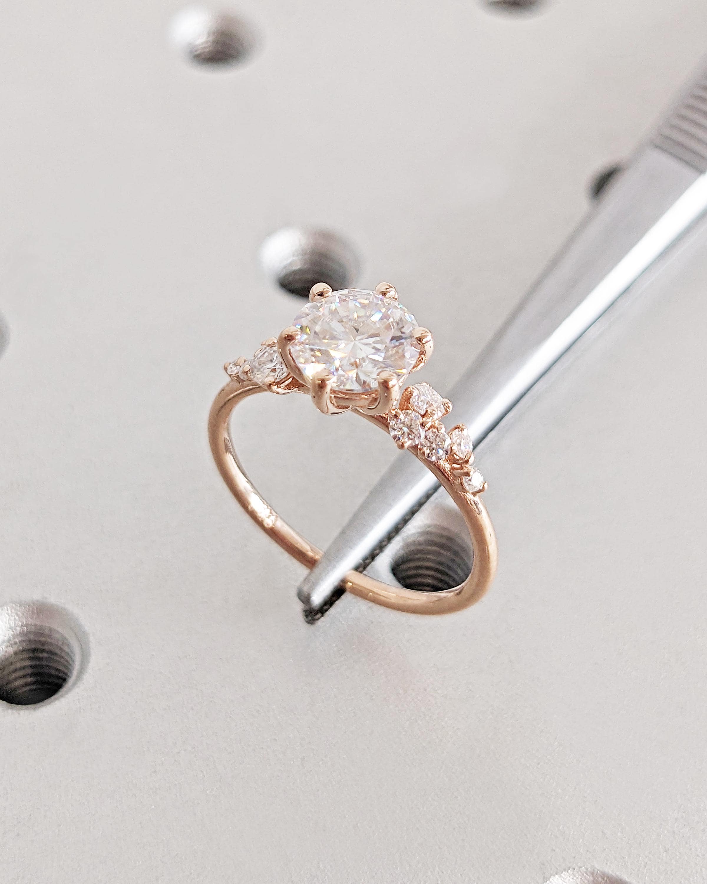 Mark the beginning of your forever with our elegantly designed engagement ring, featuring a classic center stone on a slender and delicate 1.4mm width band. The meticulous craftsmanship is apparent in the intricate setting adorned with a cluster of dazzling Diamonds or Moissanites, resembling the purity of freshly fallen snow, creating a timeless symbol of enduring love.