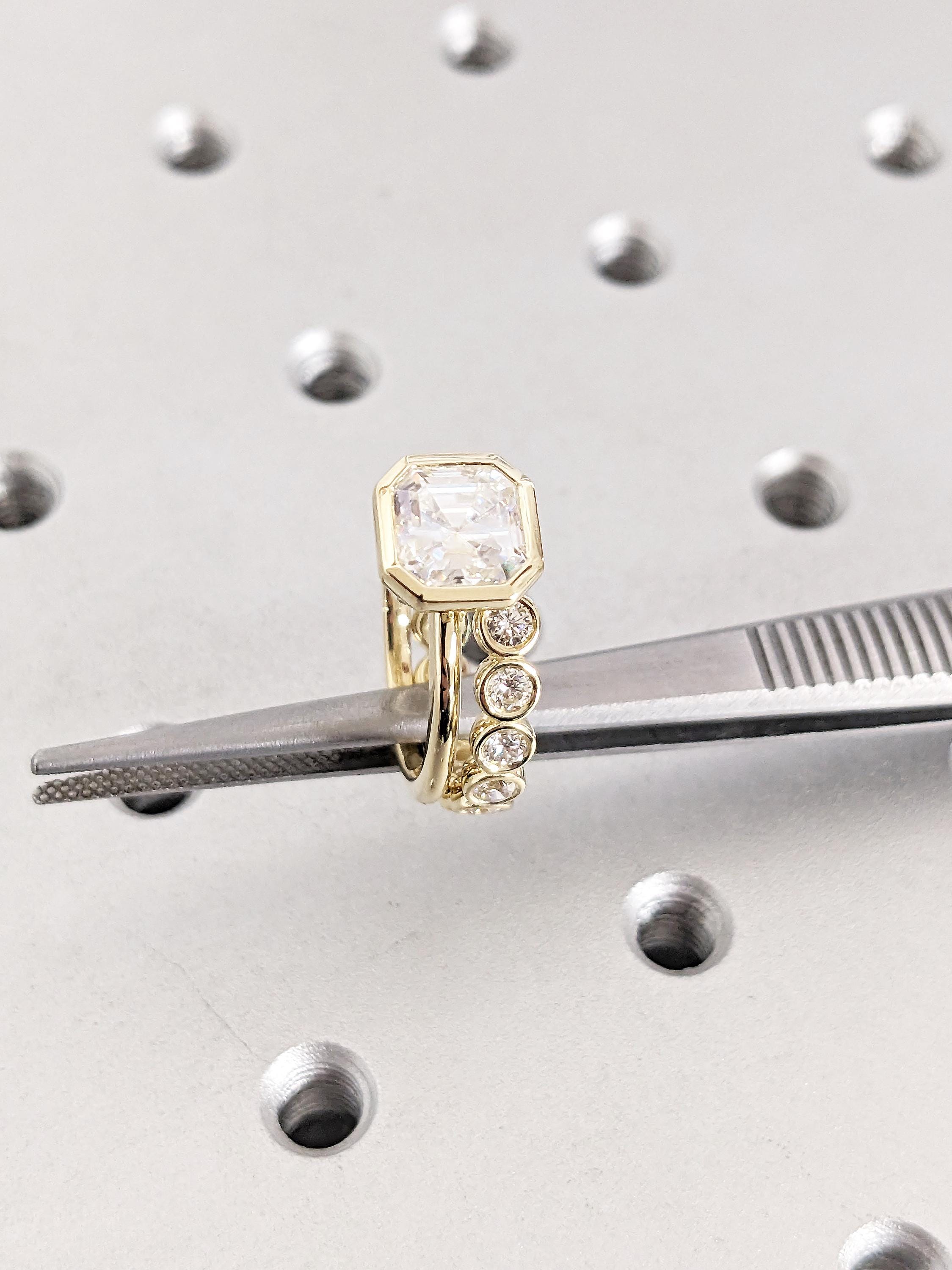 This elegant engagement ring set showcases an asscher-cut Moissanite in a sleek bezel setting. Meticulously handcrafted, this timeless piece is the perfect statement ring to elevate your sophisticated style. Pair it with our full eternity band adorned with round-cut Moissanites in gold bezels. Together, these rings form a harmonious blend of contemporary and classic style, ideal for engagements or special occasions.