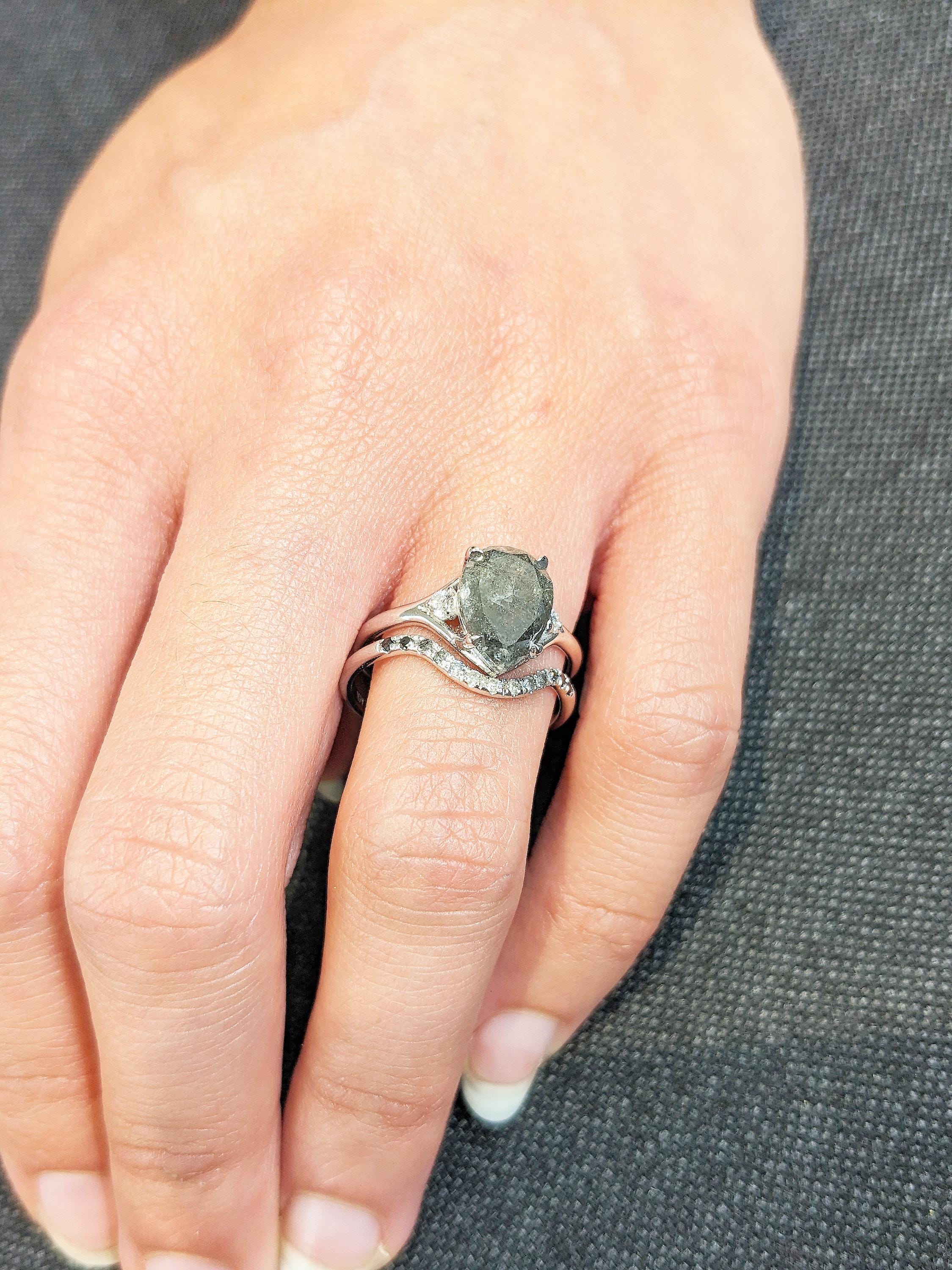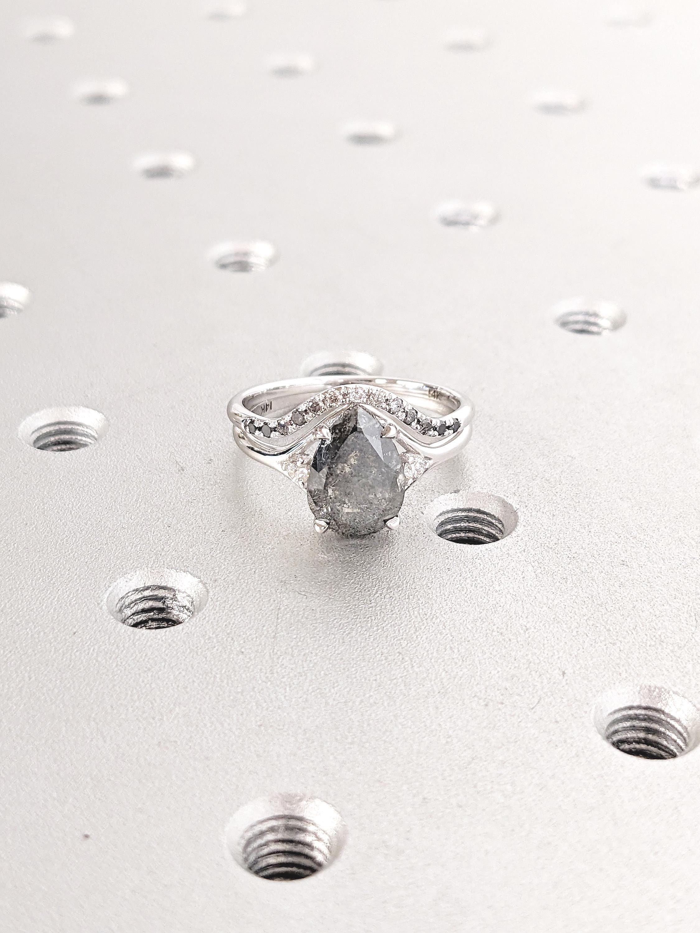 Unique Promise Ring Set, 14k Gold Engagement Ring Set for Women, Salt and Pepper Diamond, Moissanite, Hidden Amethyst Ring, Pear Shaped Ring
