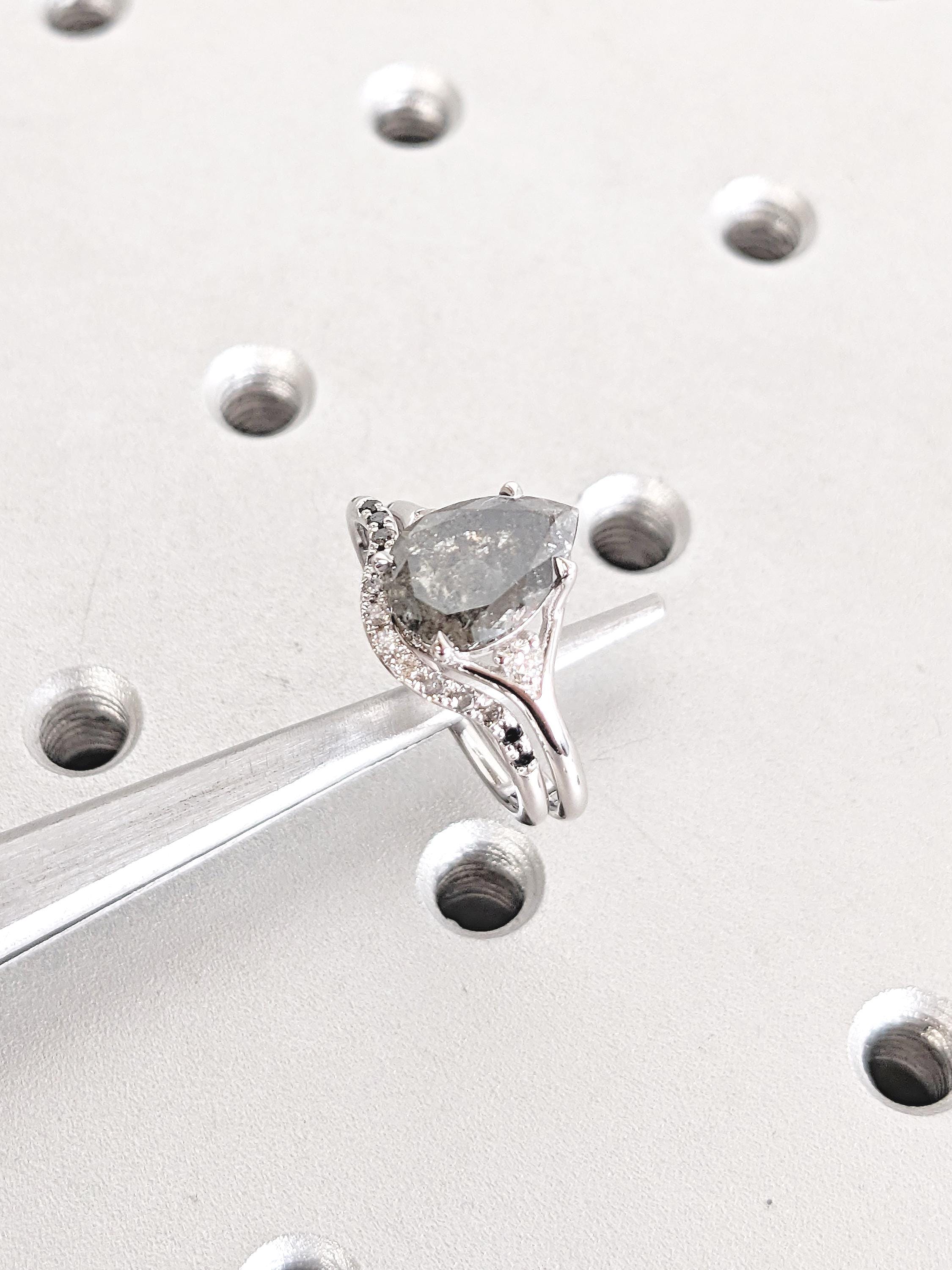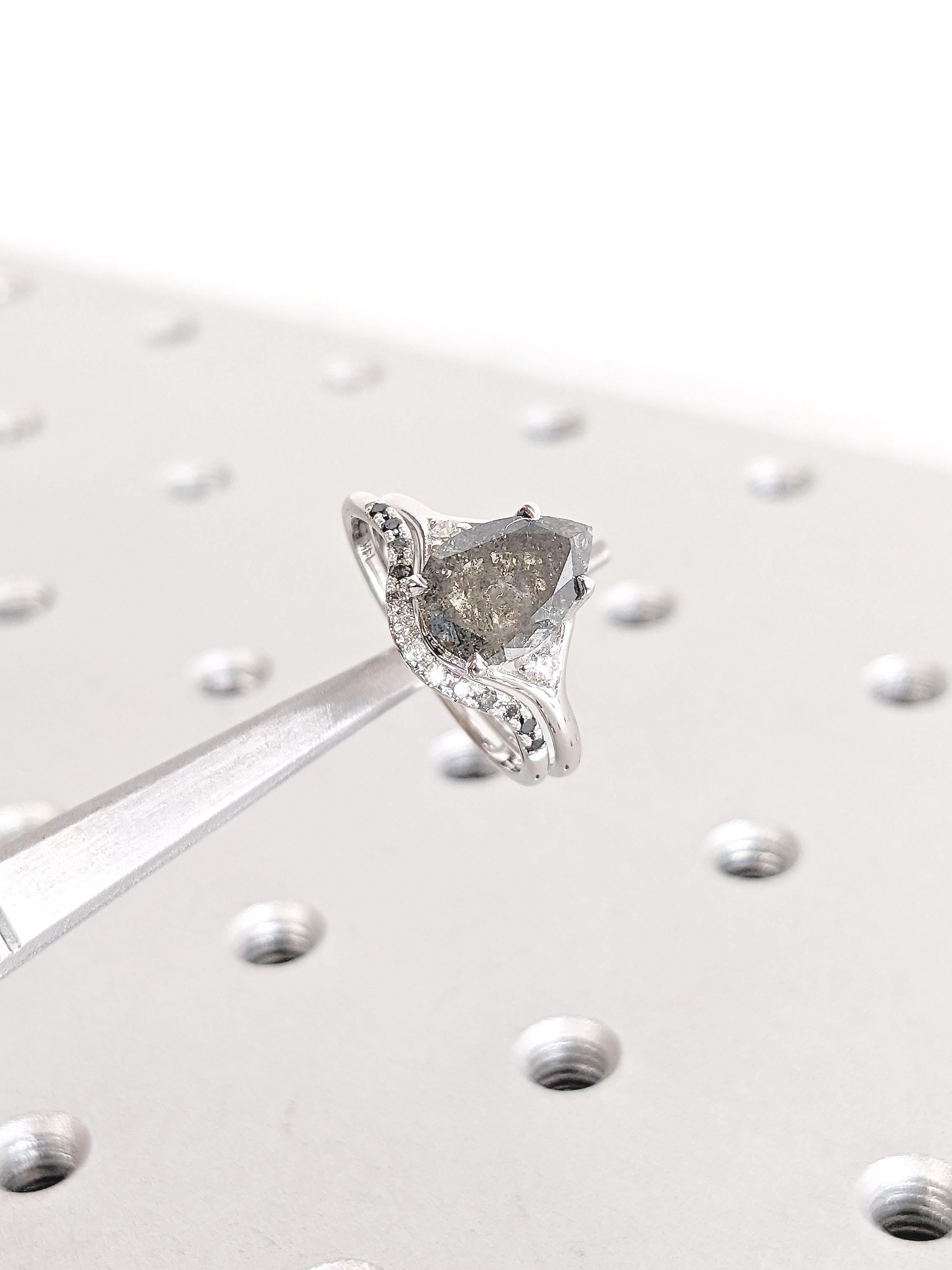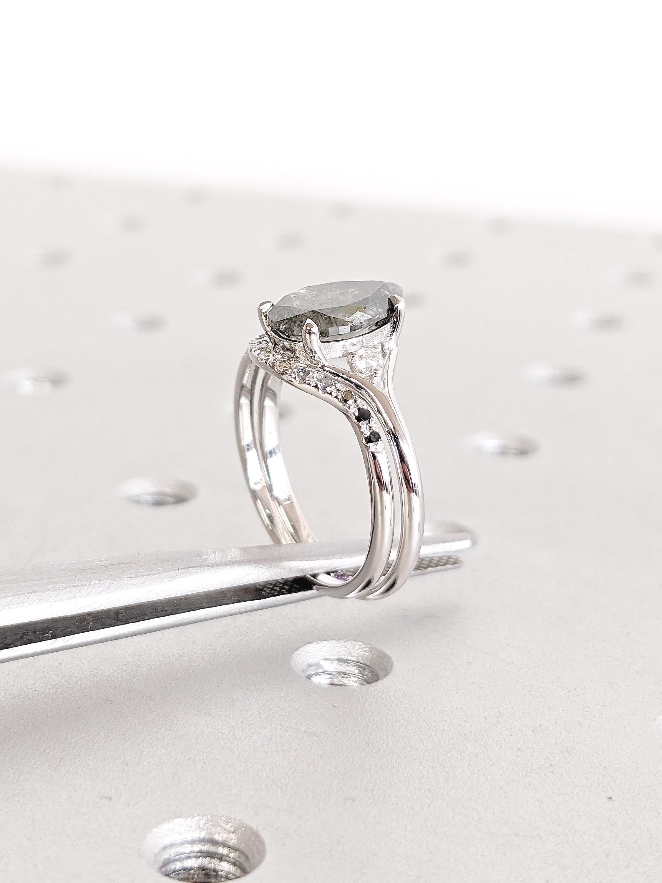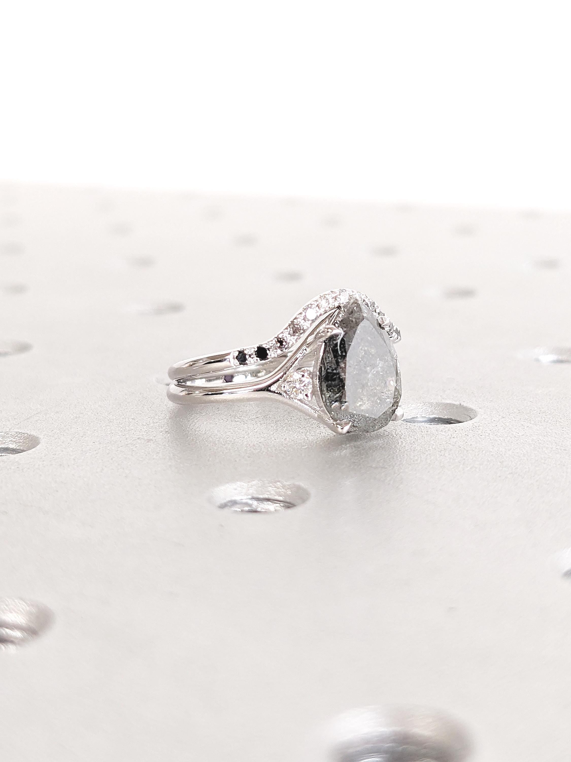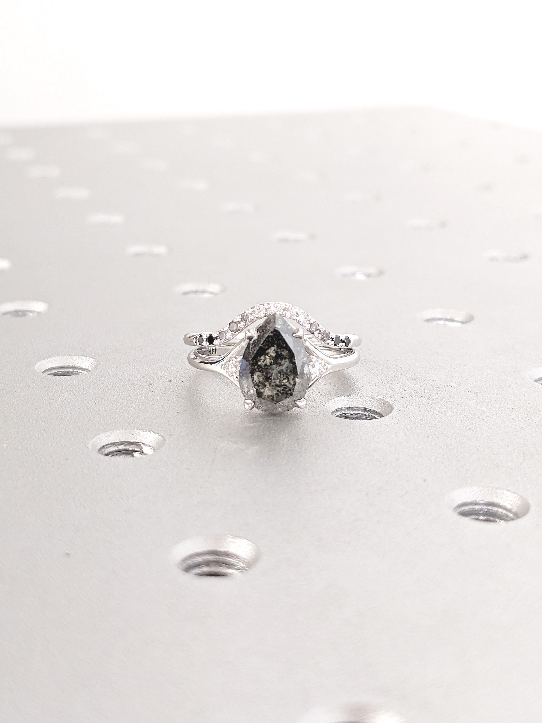 This bridal set beautifully combines bold elegance with modern sophistication. The engagement ring features a striking pear-cut Salt and Pepper Diamond set on a contemporary split shank band, flanked by sparkling Moissanites for refined brilliance. A hidden Amethyst tucked inside the band adds a personal, mystical touch. Paired with a gracefully curved wedding band adorned with flowing Ombre Diamonds, the set exudes timeless elegance and raw beauty. Together, they create a harmonious blend of individuality and minimalist charm, perfect for the modern bride.