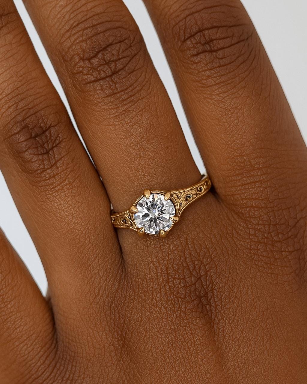 This engagement ring is a beautiful fusion of nature and vintage artistry, with a round cut Lab Diamond cradled in a classic six-prong basket setting. The band is adorned with vintage-style milgrain edges and delicately carved filigree waves that flow halfway around, drawing attention to the solitaire center stone. Choose from platinum or gold to create your own heirloom-worthy engagement ring.