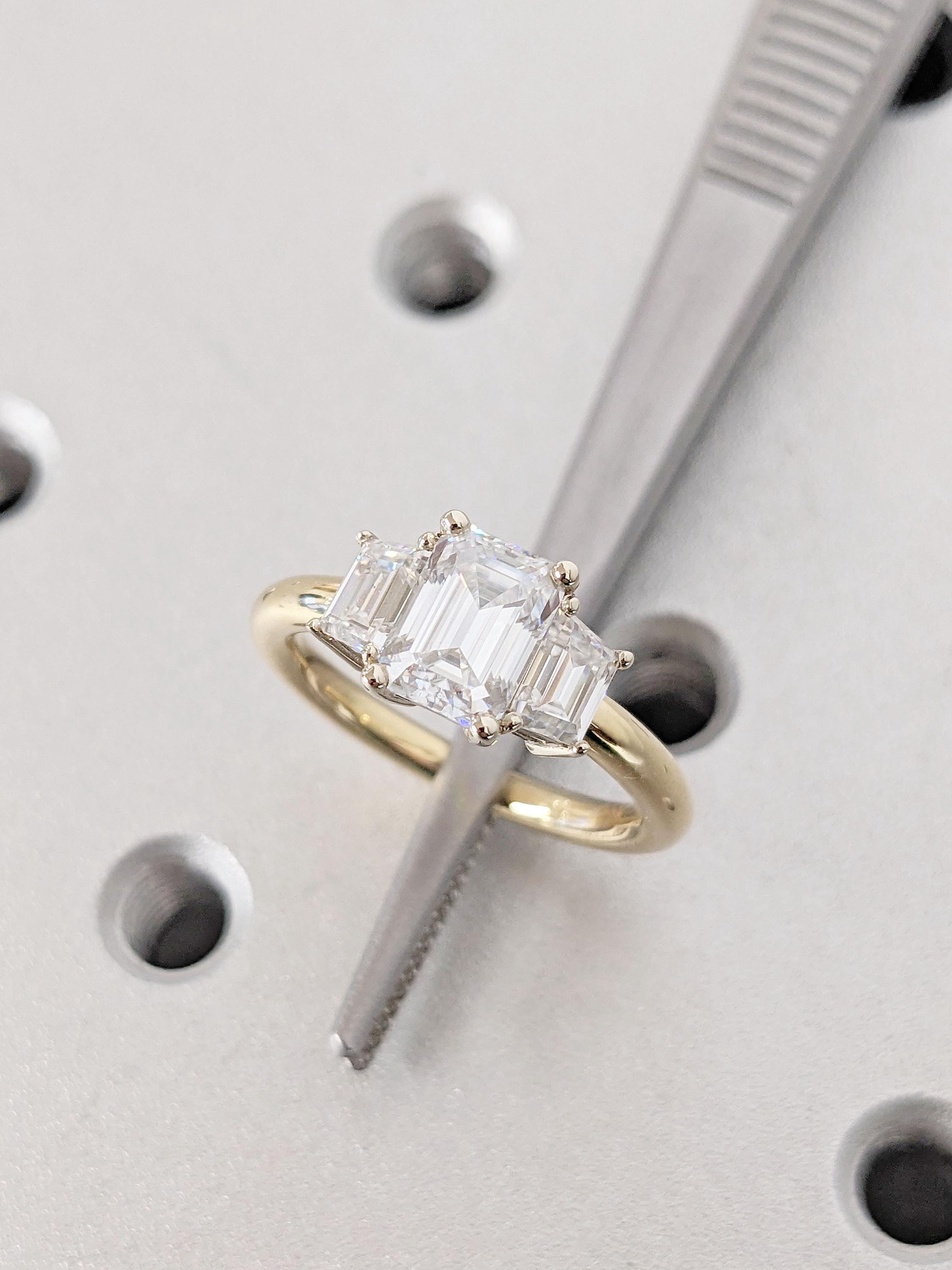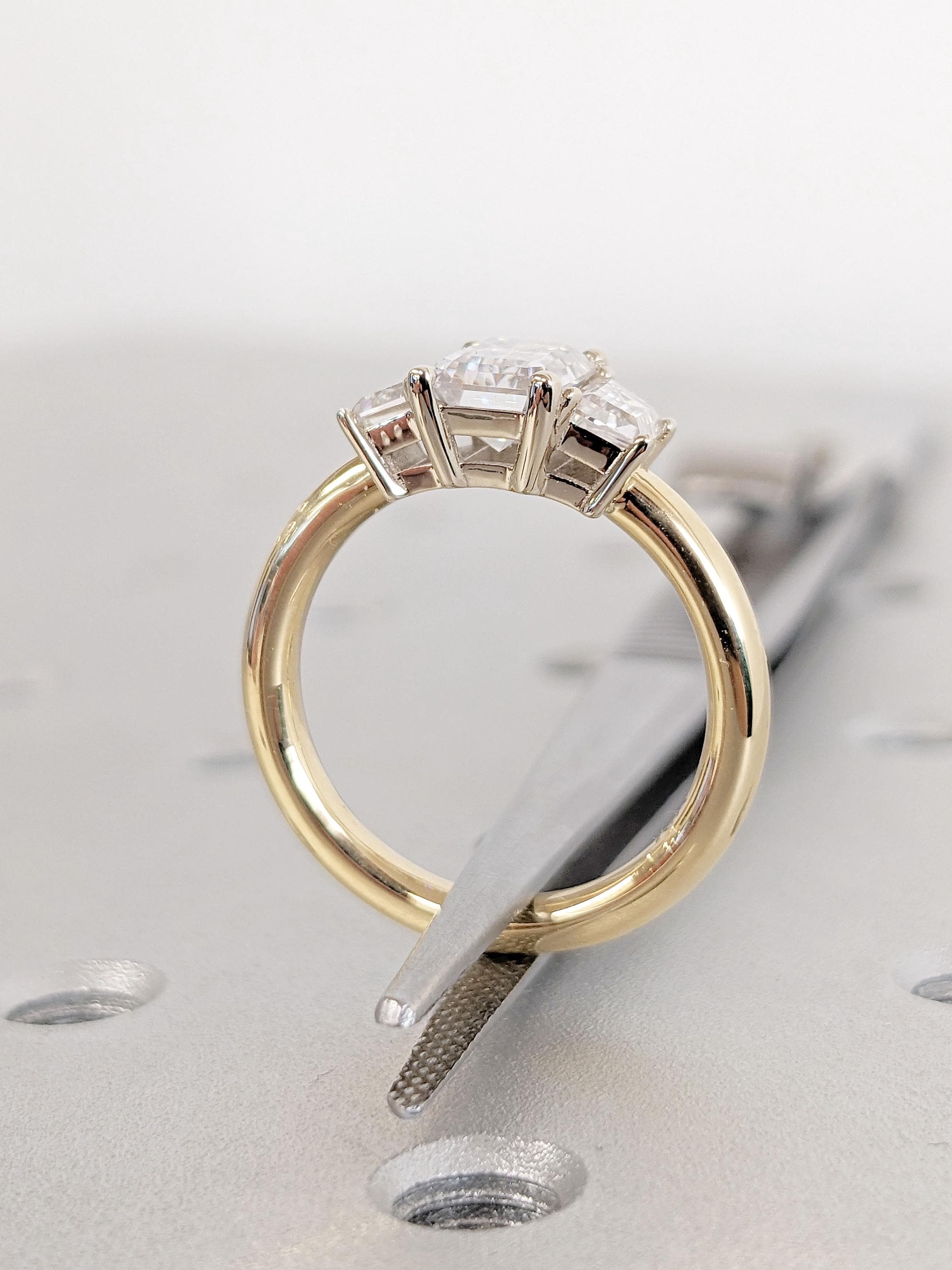 Striking in contrast and form, this two-tone ring highlights an emerald cut Moissanite center stone, prized for its clean lines and mirror-like brilliance. Flanking the center are trapezoid cut side stones, creating a bold geometric balance that enhances the modern elegance of the design. The two-tone setting adds depth and distinction, making this ring a statement of refined individuality.