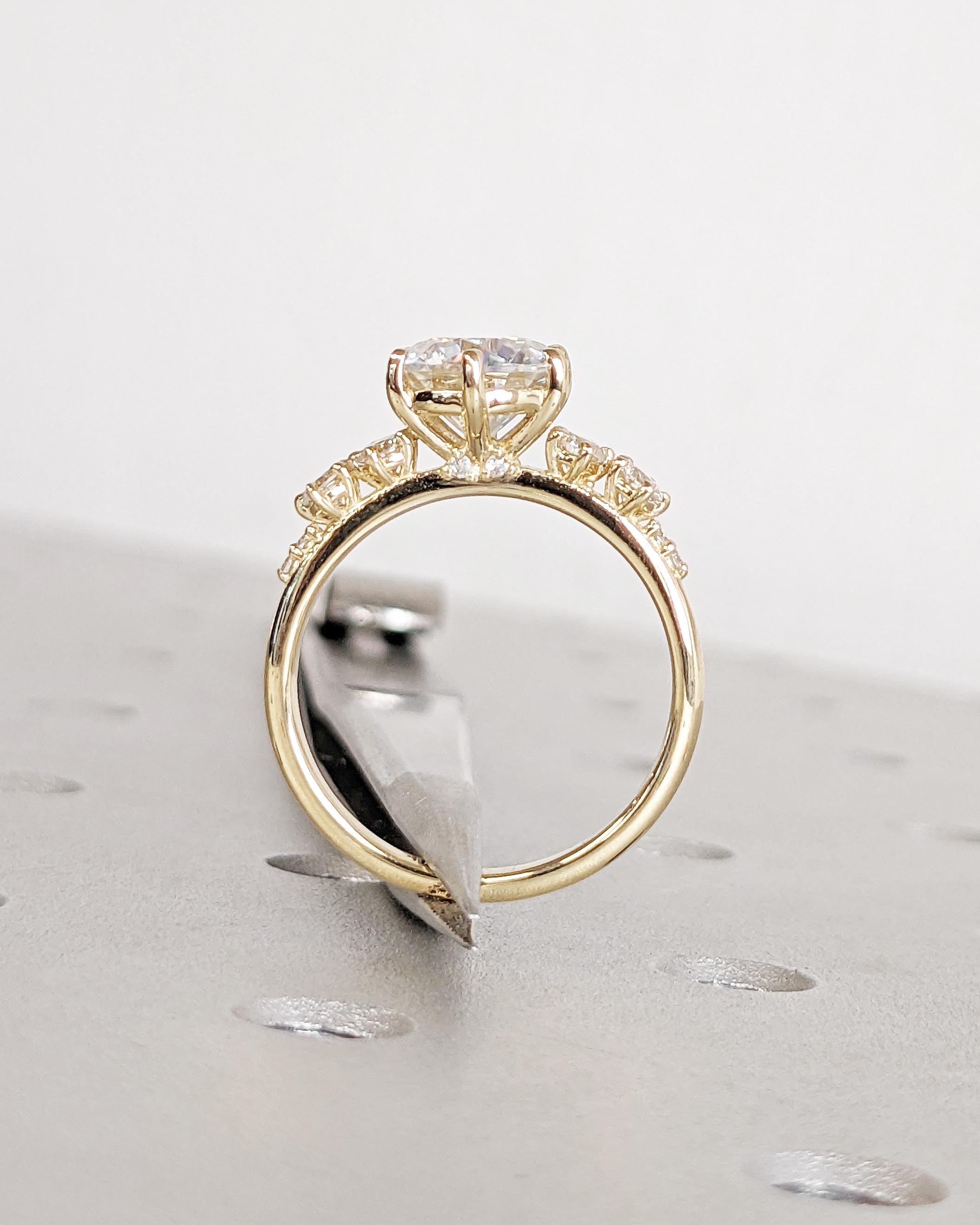 An elegant handmade statement jewelry, features a round cut Moissanite center stone, held gently by a 6 prong basket setting on a delicate 1.7mm width band. The ring's shoulder adorned with 4 side stones on each side, gradually grows in size as it leads up to the focal stone, while the accented bridge with a pair of dazzling gemstones on both side, adds an extra sparkles and hidden beauty to the ring. Side stones are available in either natural diamonds, lab diamonds or moissanites.