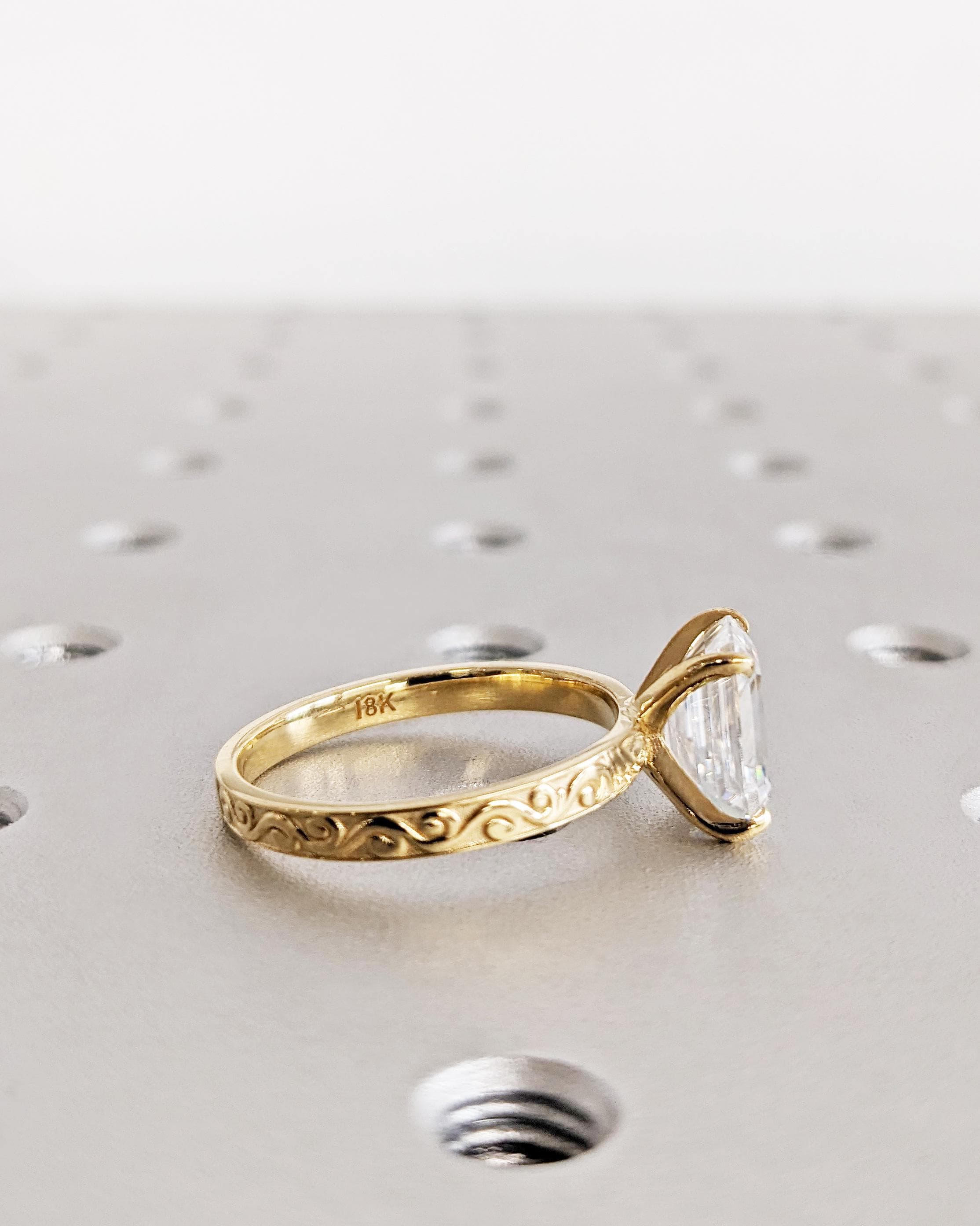 Handcrafted with elegant scrollwork pattern, this 2.5mm width band features an emerald cut Lab Created Diamond solitaire set in open gallery style. The perfect balance between minimalist and vintage charm.