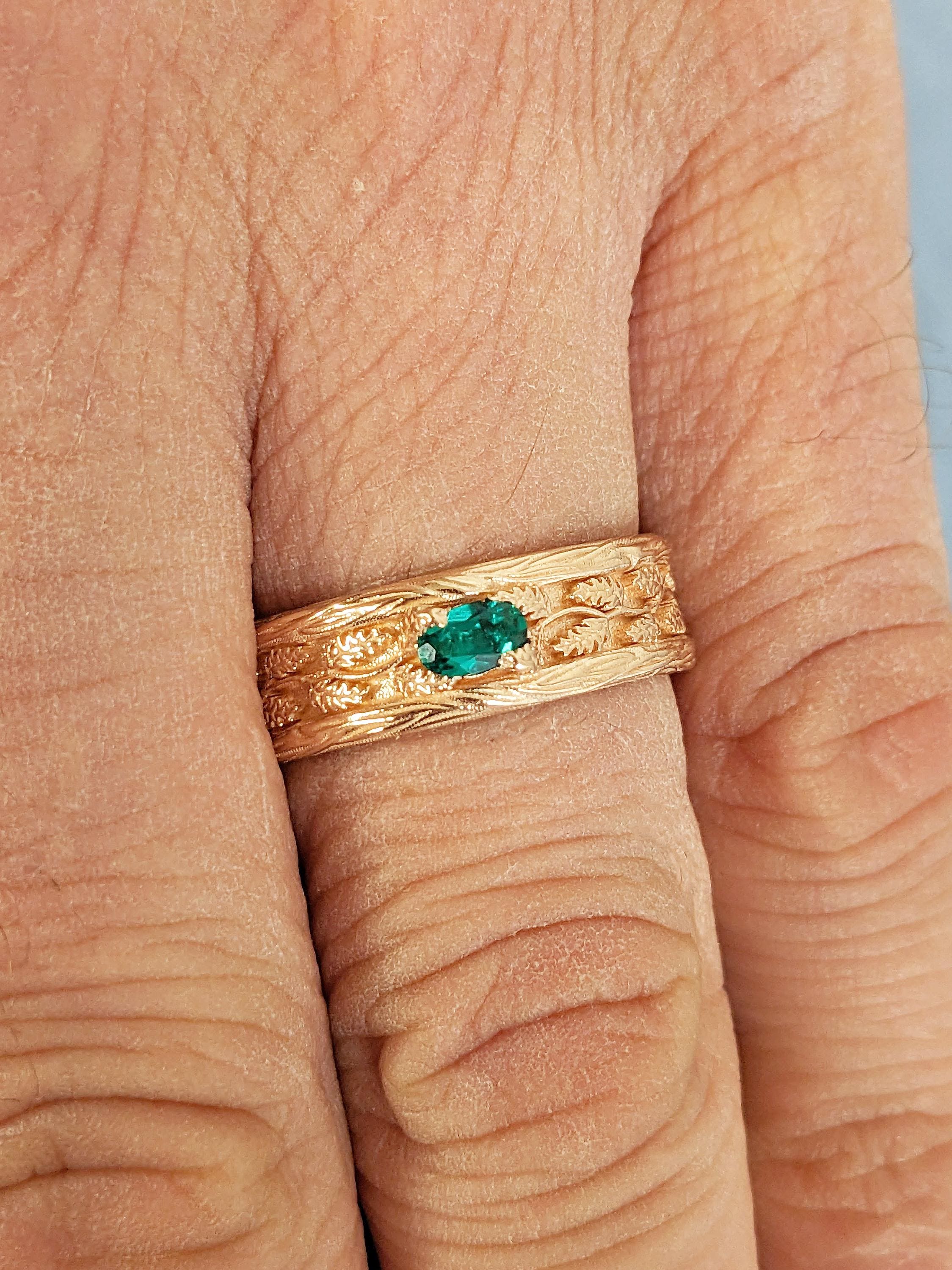 This men's ring showcases a bold and intricate design. The gold band is adorned with detailed engravings inspired by natural foliage, creating an organic, earthy charm. At its center, a vibrant oval Lab Grown Emerald is securely set, offering a striking contrast to the band and a vivid pop of color. With its robust craftsmanship and elegant detailing, this ring perfectly balances rugged sophistication, making it an ideal choice for those seeking a distinctive and stylish accessory.