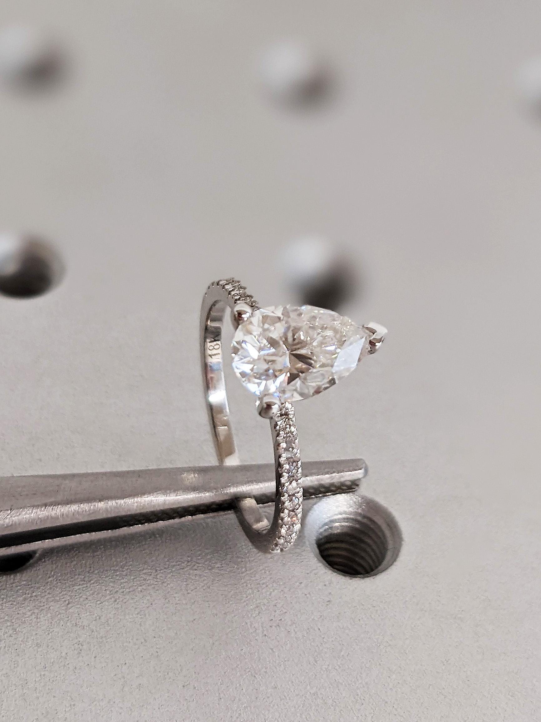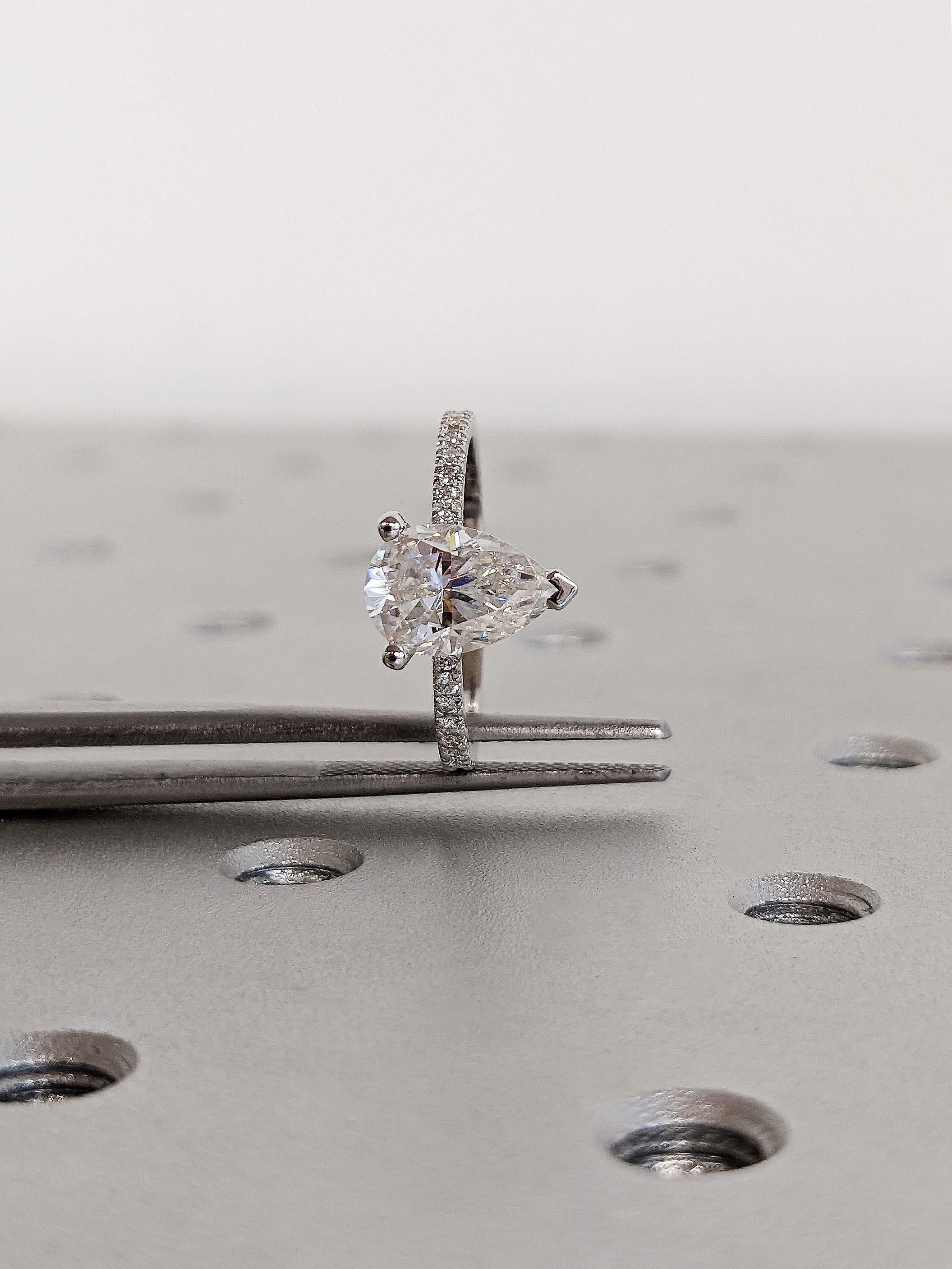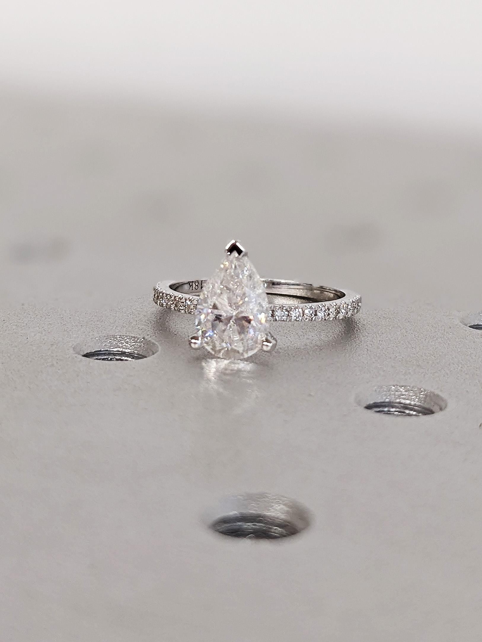 Celebrate everlasting love with this stunning engagement ring, beautifully crafted for timeless elegance. The center showcases a brilliant pear cut Lab Grown Diamond, expertly faceted to radiate fire and sparkle. Its sleek silhouette is complemented by a delicate pavé band, customizable with either Natural Diamond, Lab Diamond or Moissanite. Designed for comfort and durability, perfect as an engagement ring, wedding keepsake or anniversary gift.