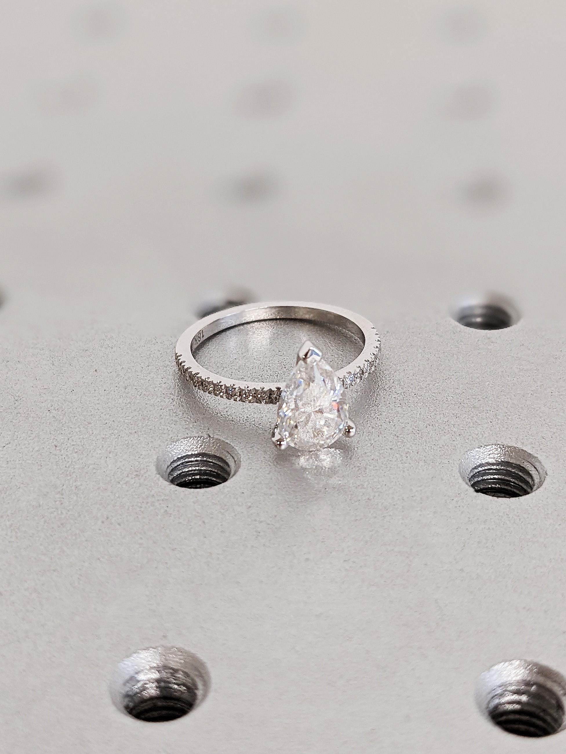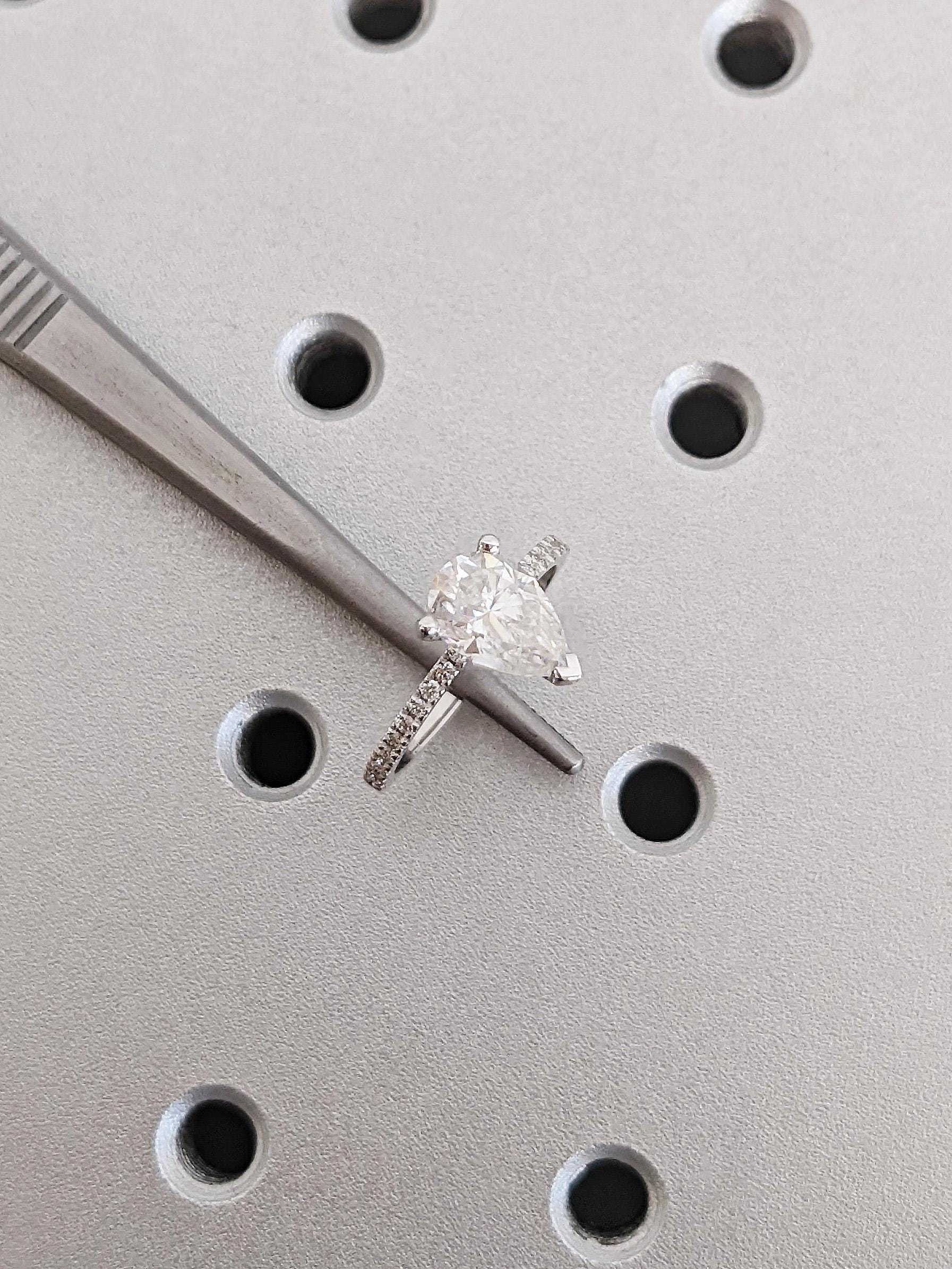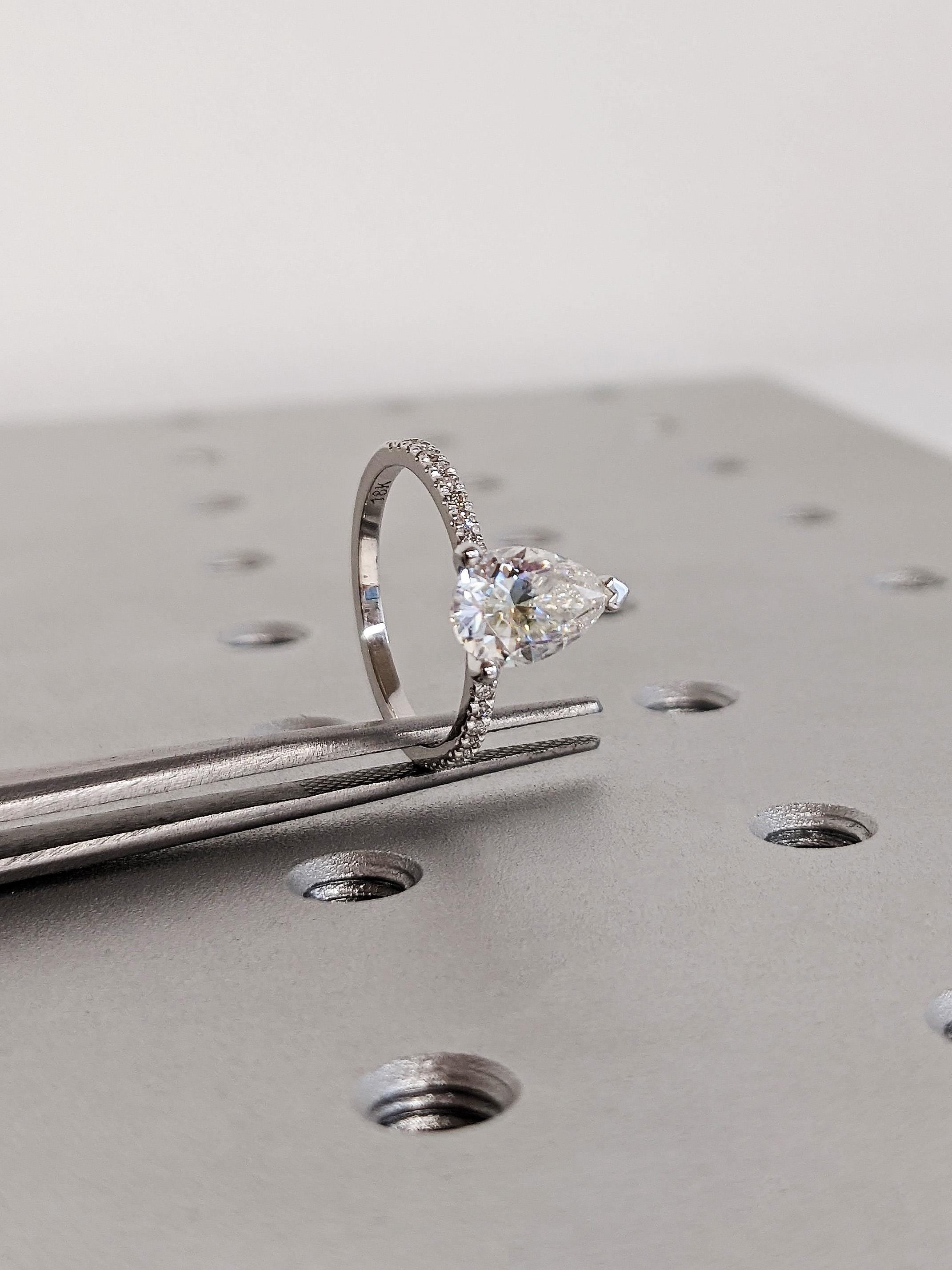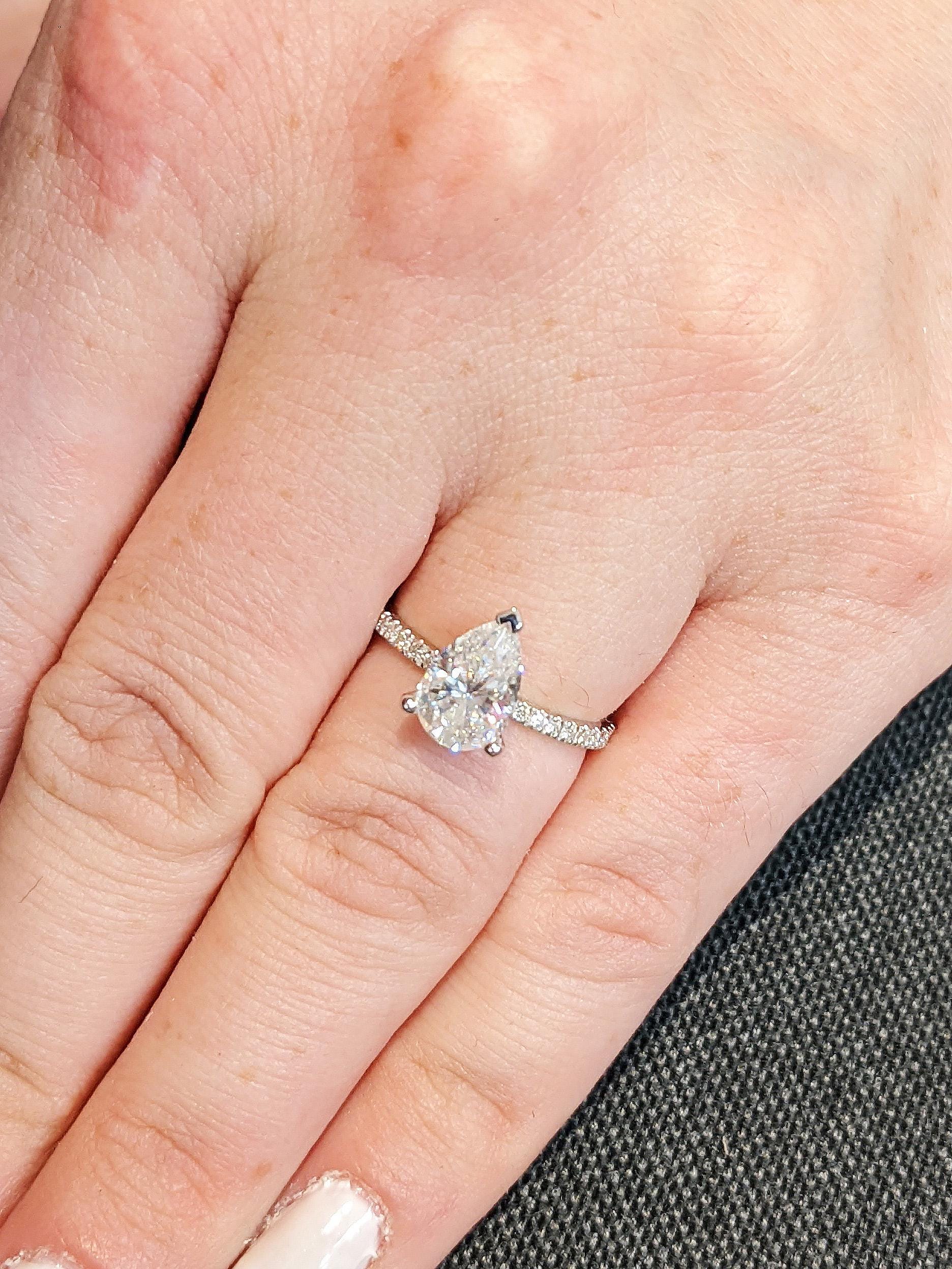 Celebrate everlasting love with this stunning engagement ring, beautifully crafted for timeless elegance. The center showcases a brilliant pear cut Lab Grown Diamond, expertly faceted to radiate fire and sparkle. Its sleek silhouette is complemented by a delicate pavé band, customizable with either Natural Diamond, Lab Diamond or Moissanite. Designed for comfort and durability, perfect as an engagement ring, wedding keepsake or anniversary gift.