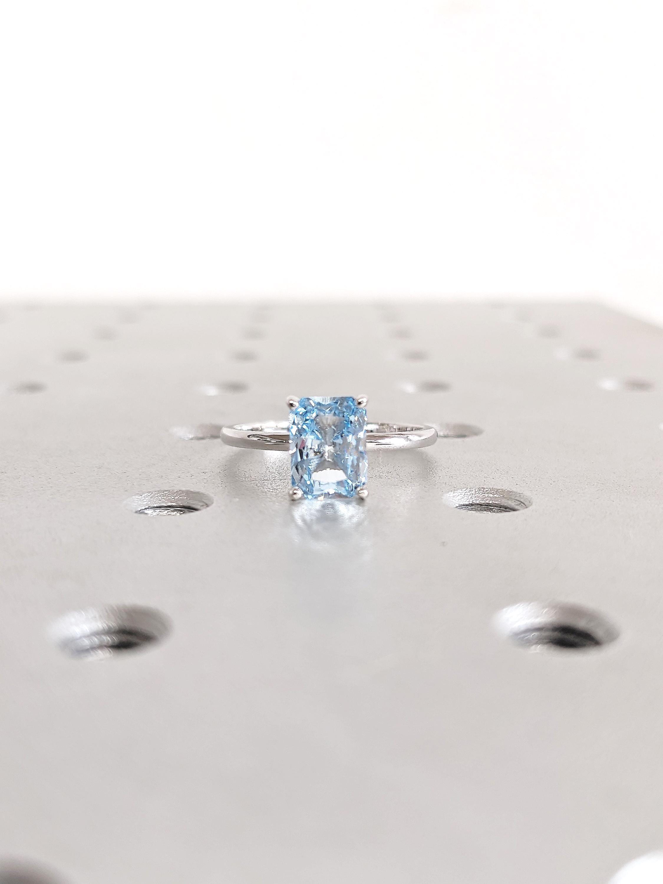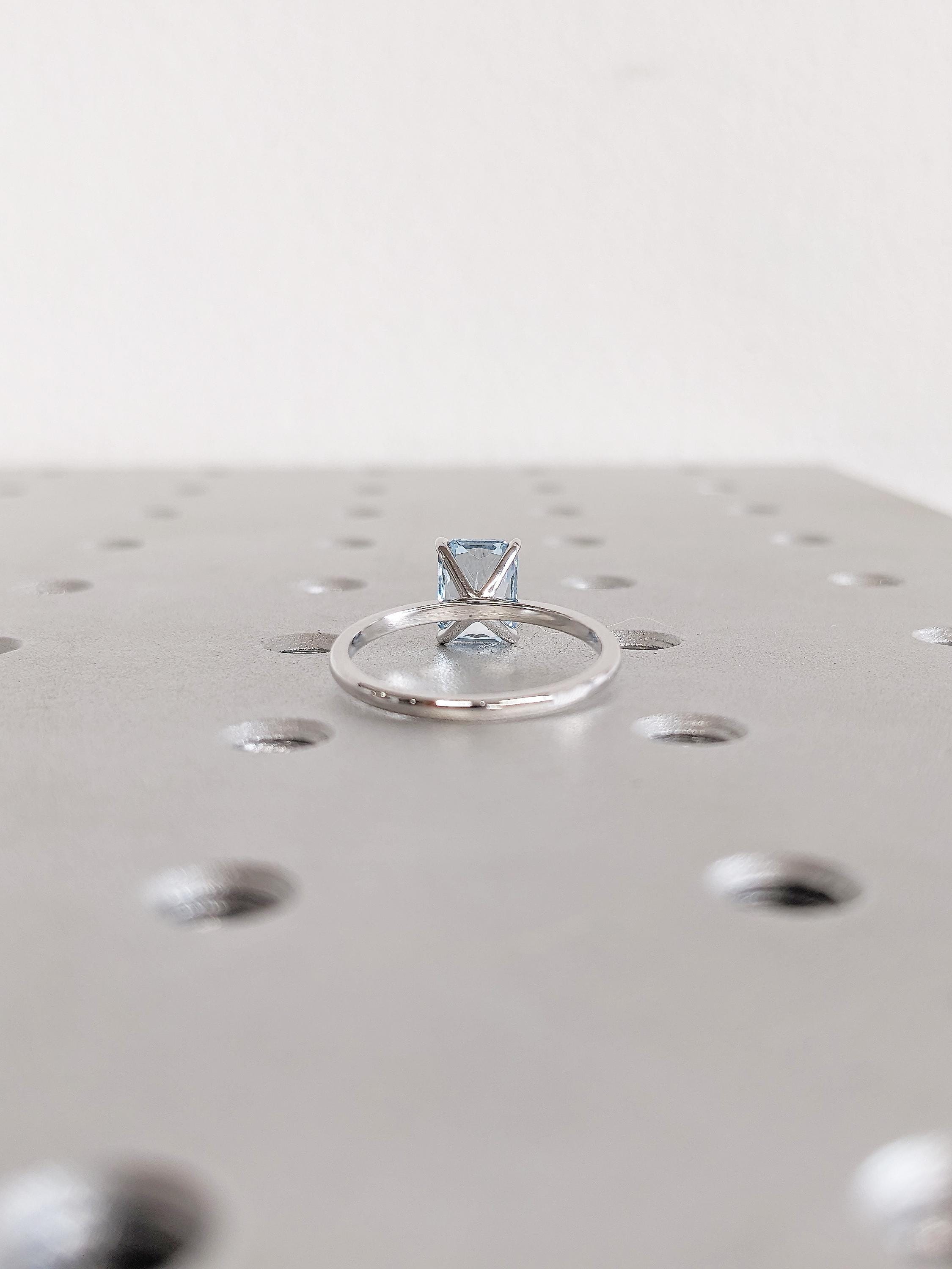 Celebrate your unique love story with our radiant cut Lab Grown Blue Aquamarine engagement ring, delicately set upon a slender 1.6mm band for a touch of sophistication. This beautiful ring exudes timeless elegance, making it the perfect choice to commemorate your special bond and create cherished memories together.