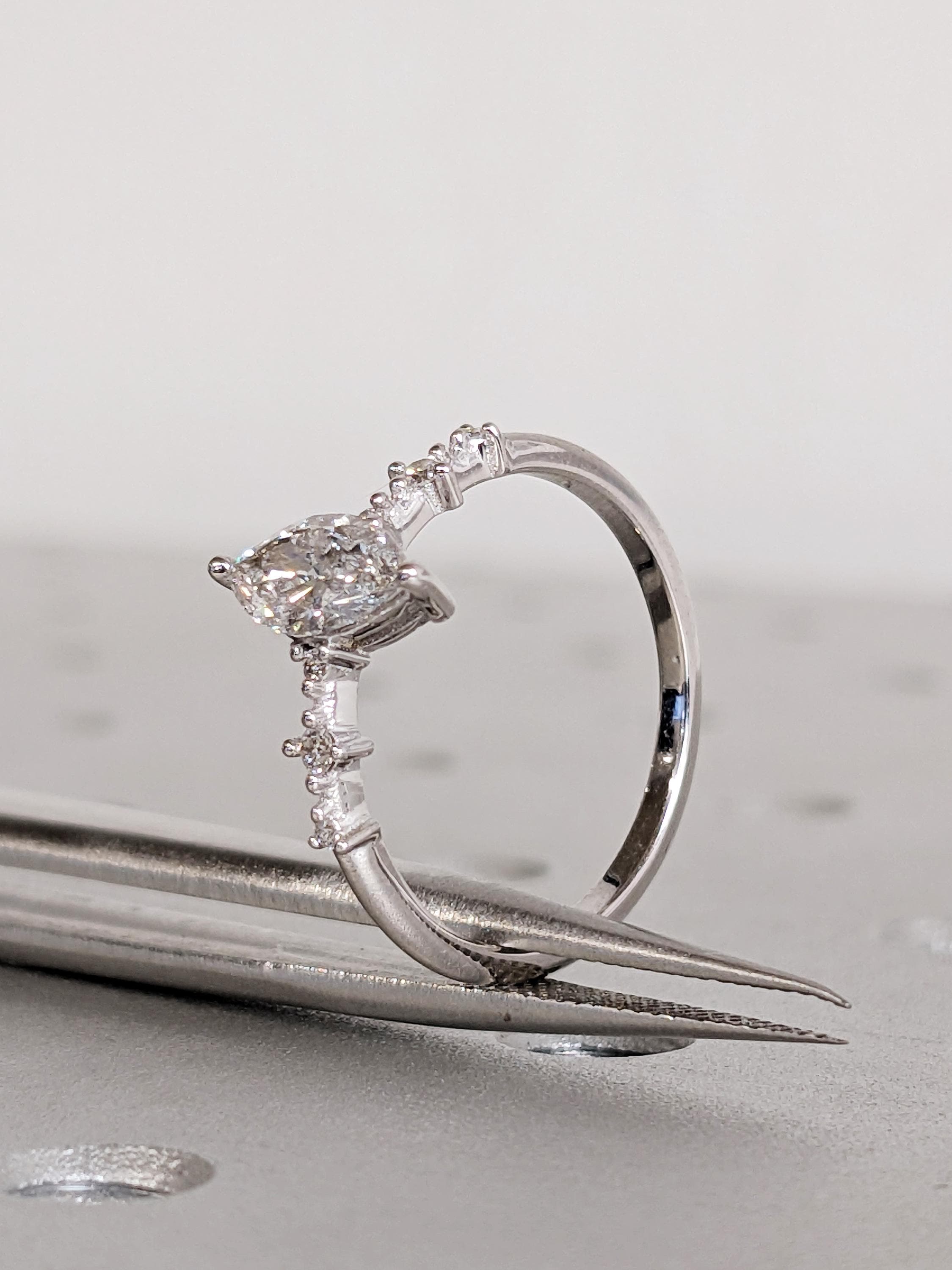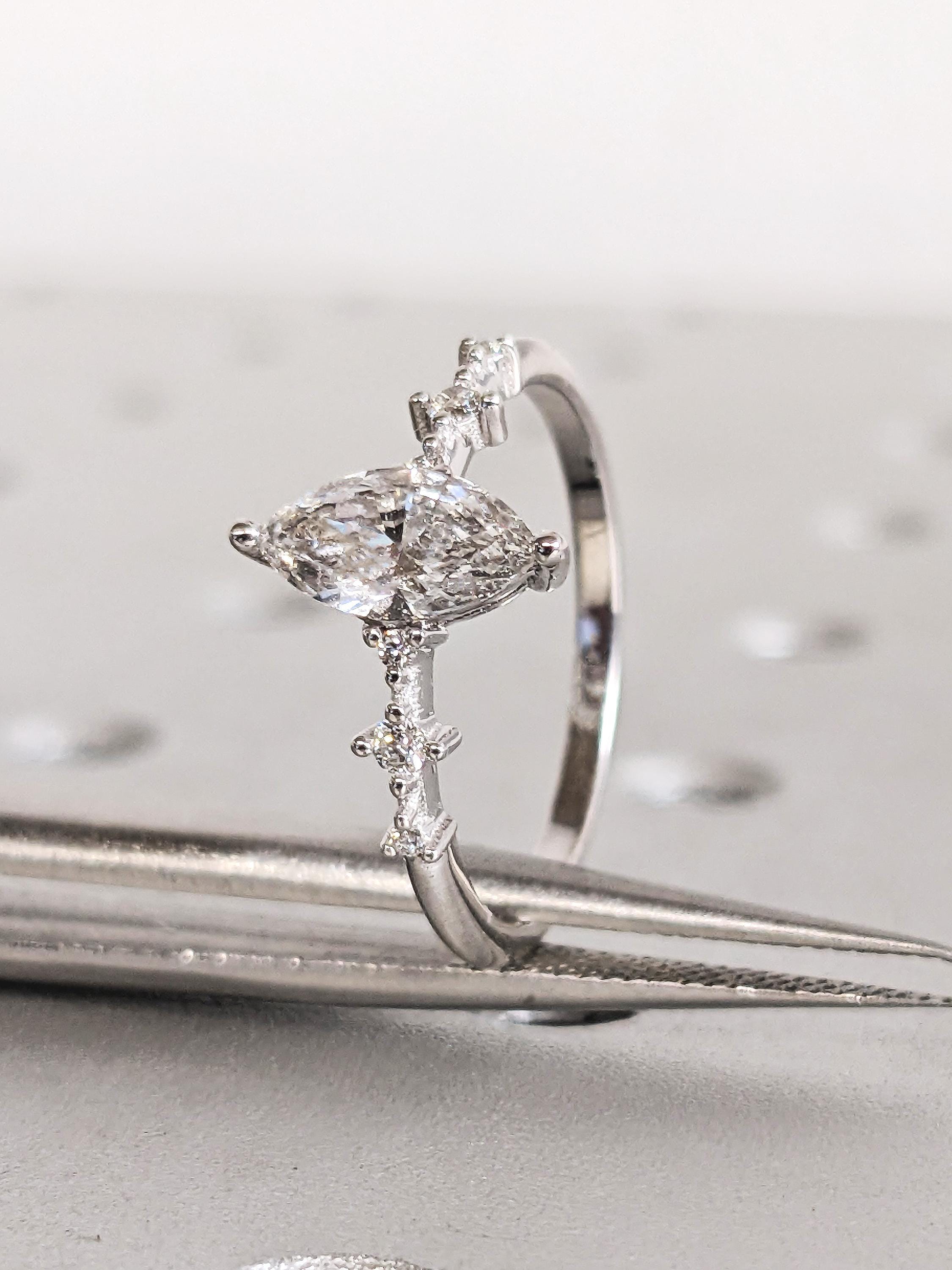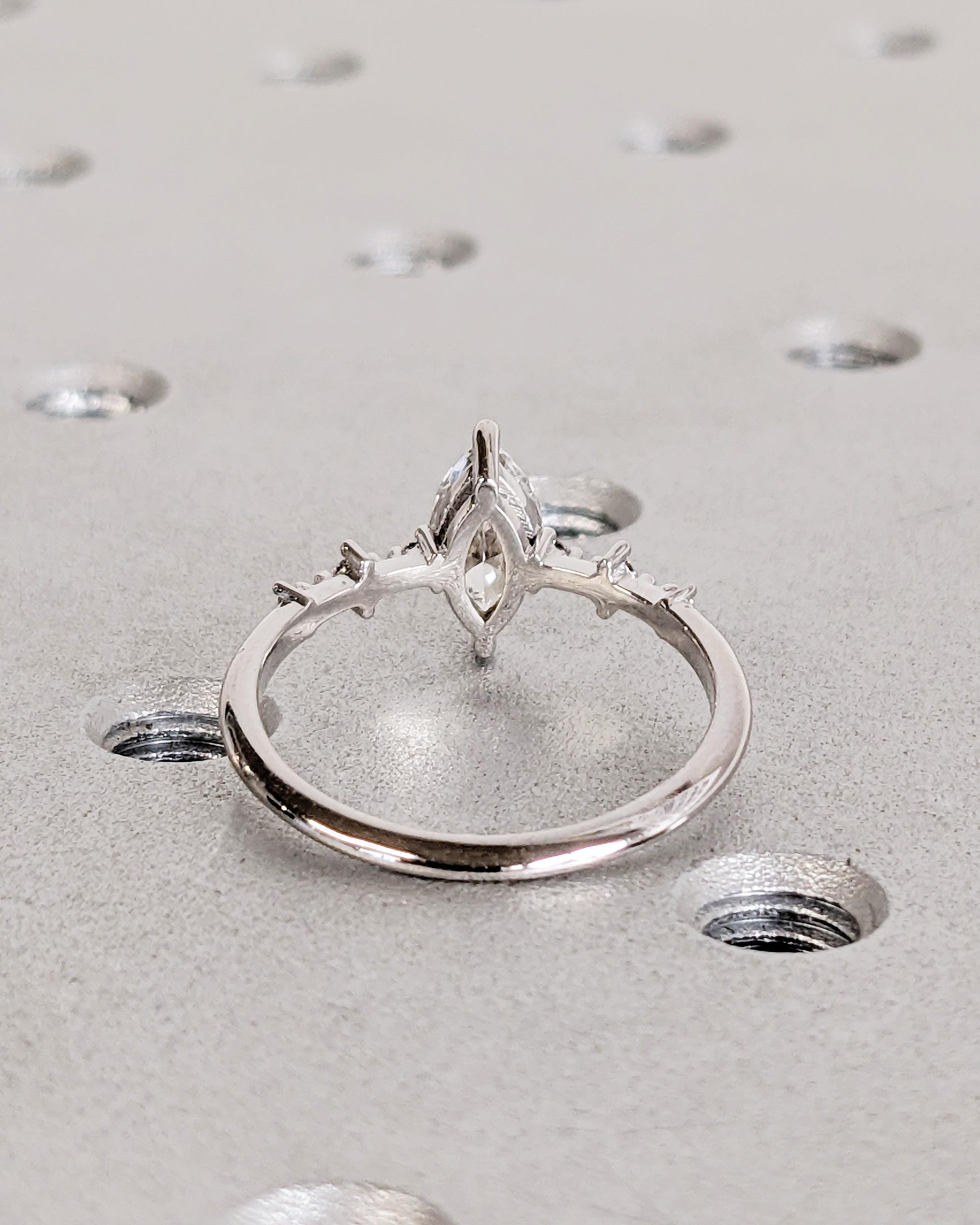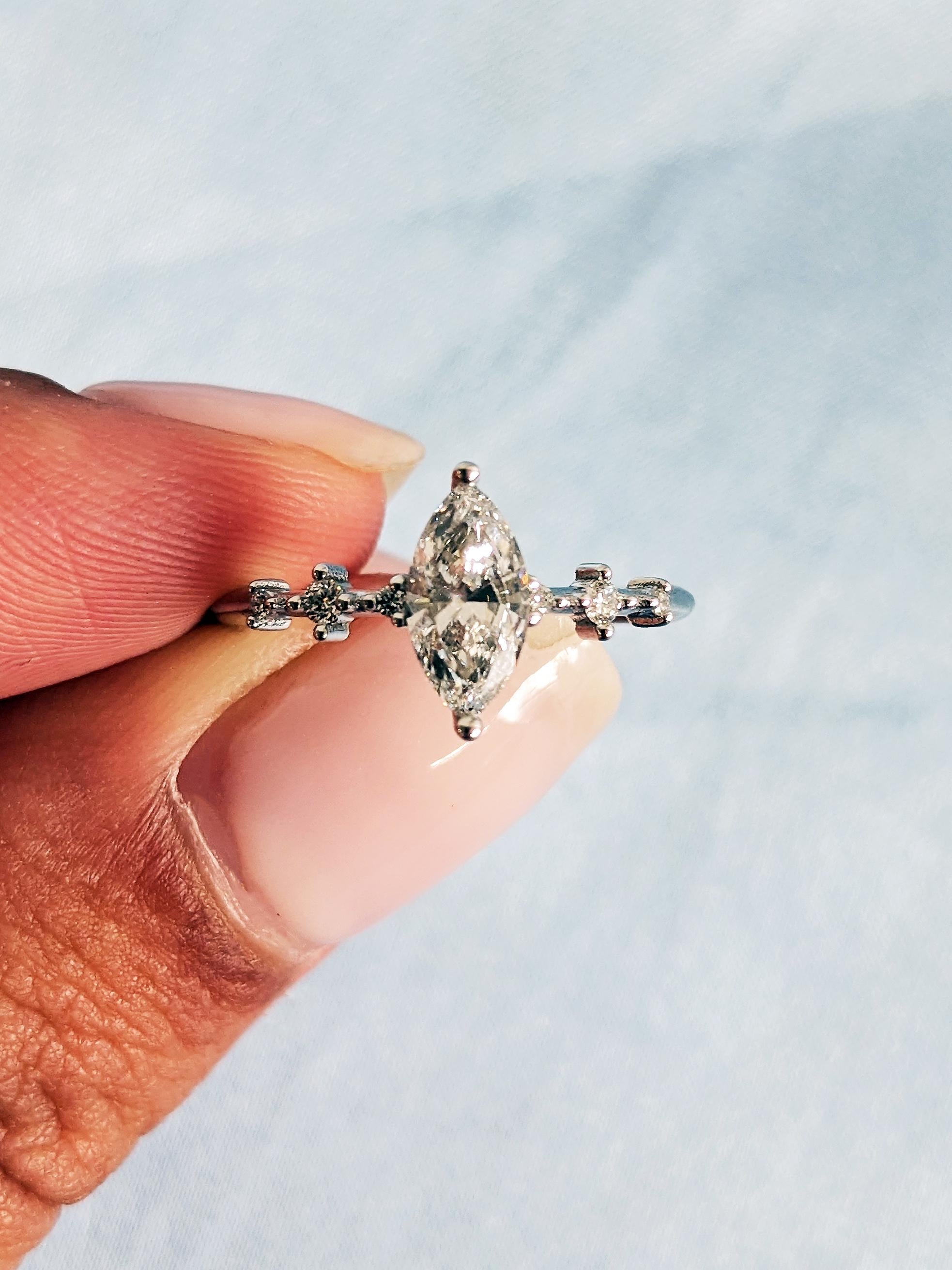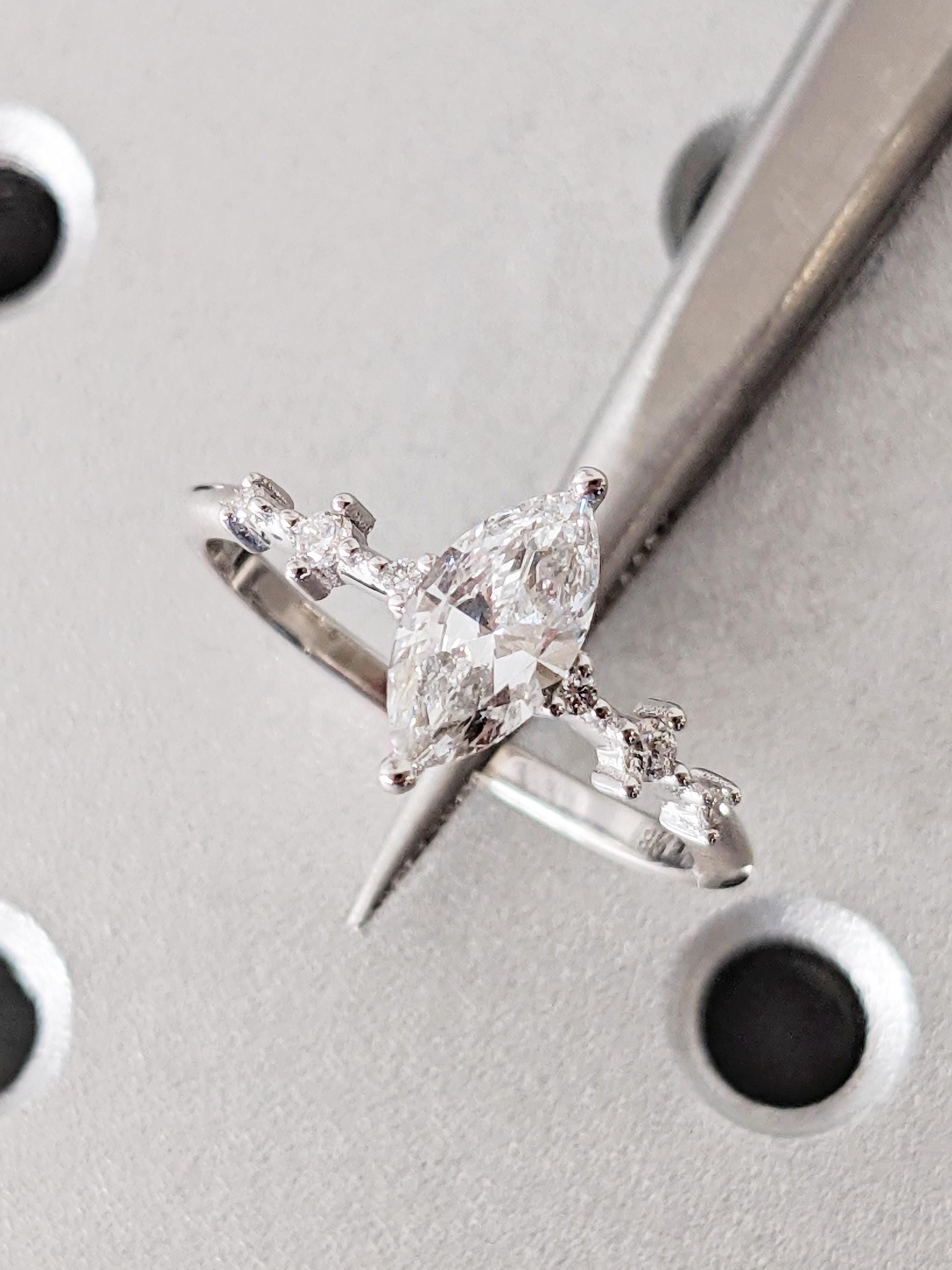 Captivate hearts with our marquise cut Moissanite engagement ring, adorned with three enchanting Natural Diamonds, Lab Grown Diamond or Moissanite stones on either side. Embrace the magic of your union with this exquisite symbol of everlasting love and devotion.