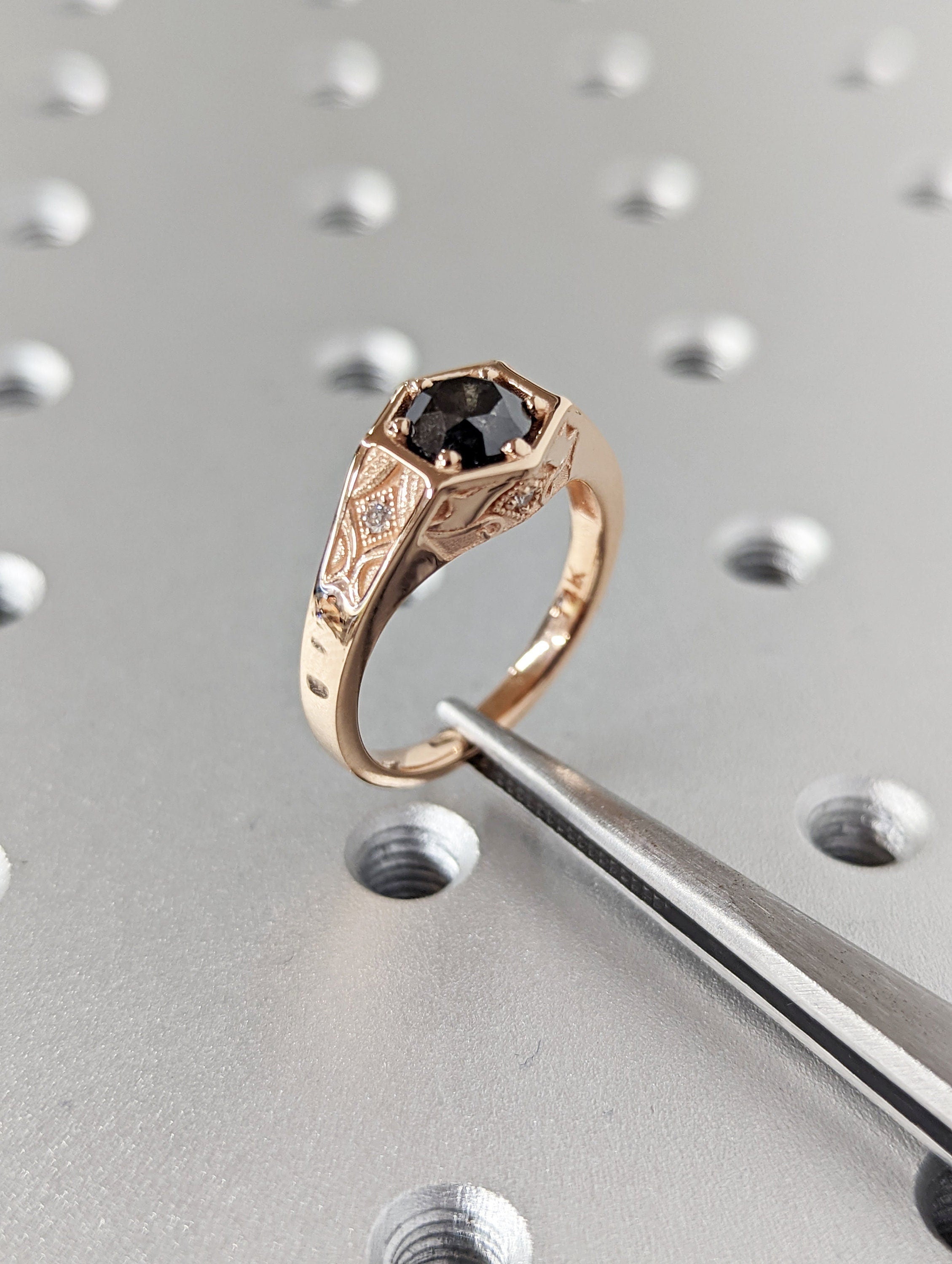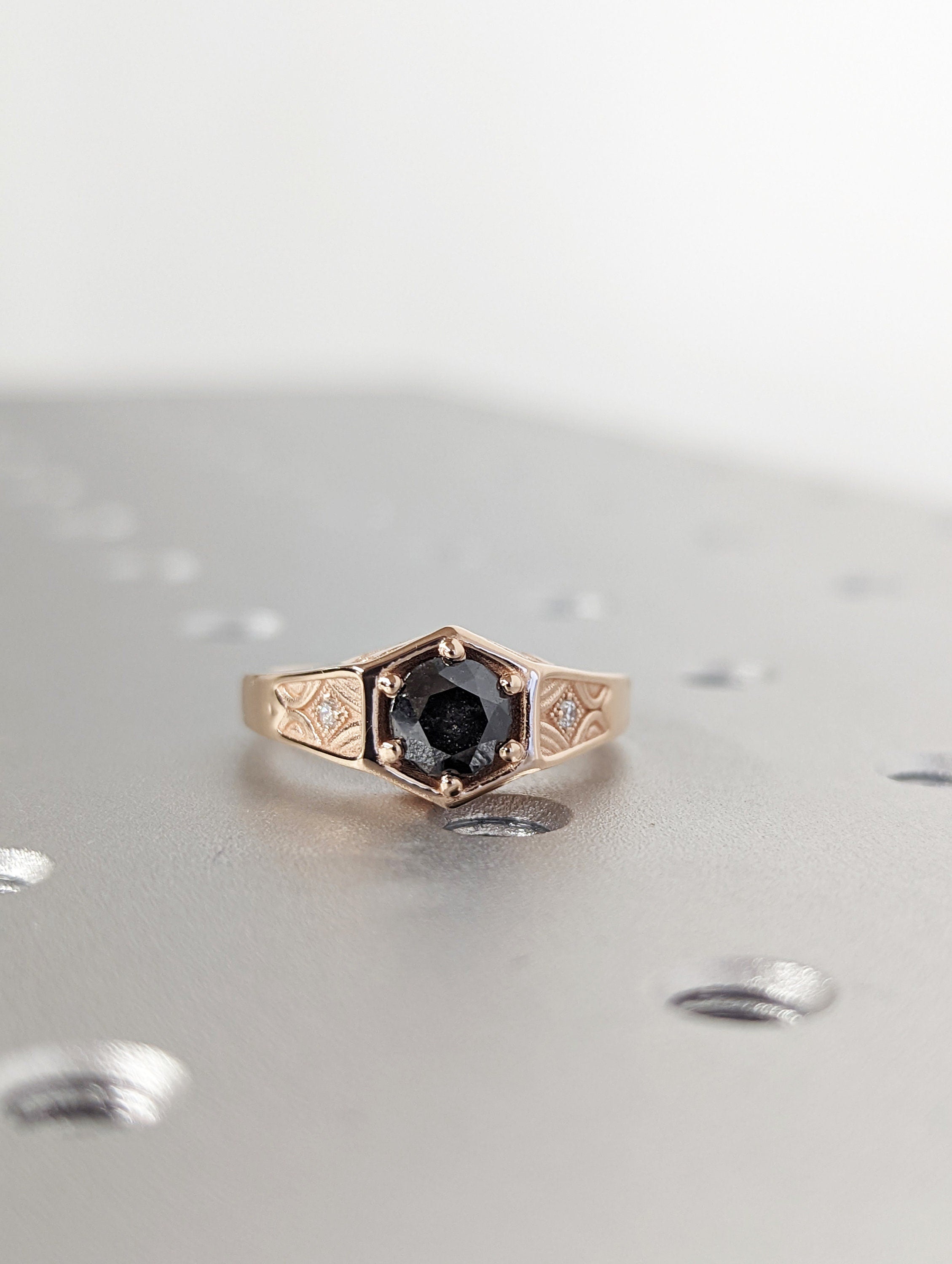 A six-prong low setting is beautifully cupped in a hexagonal design with engraved shoulders, embellished with hidden diamond accents and beaded milgrain in this refined, art-deco style engagement ring.